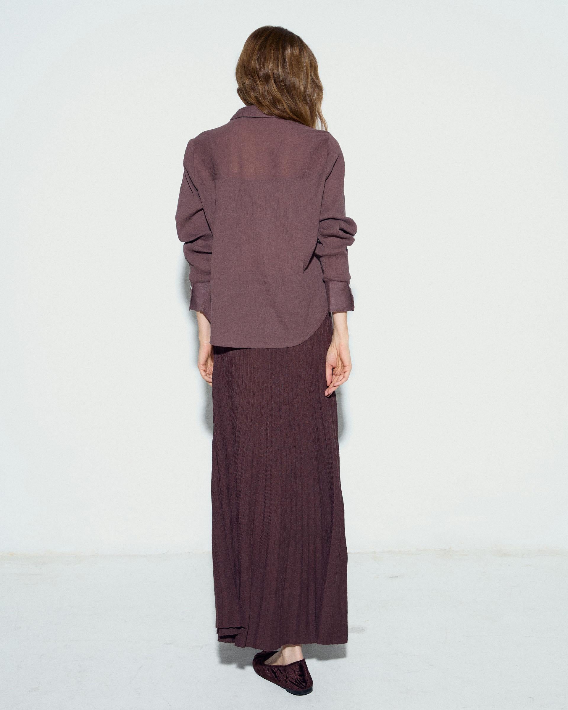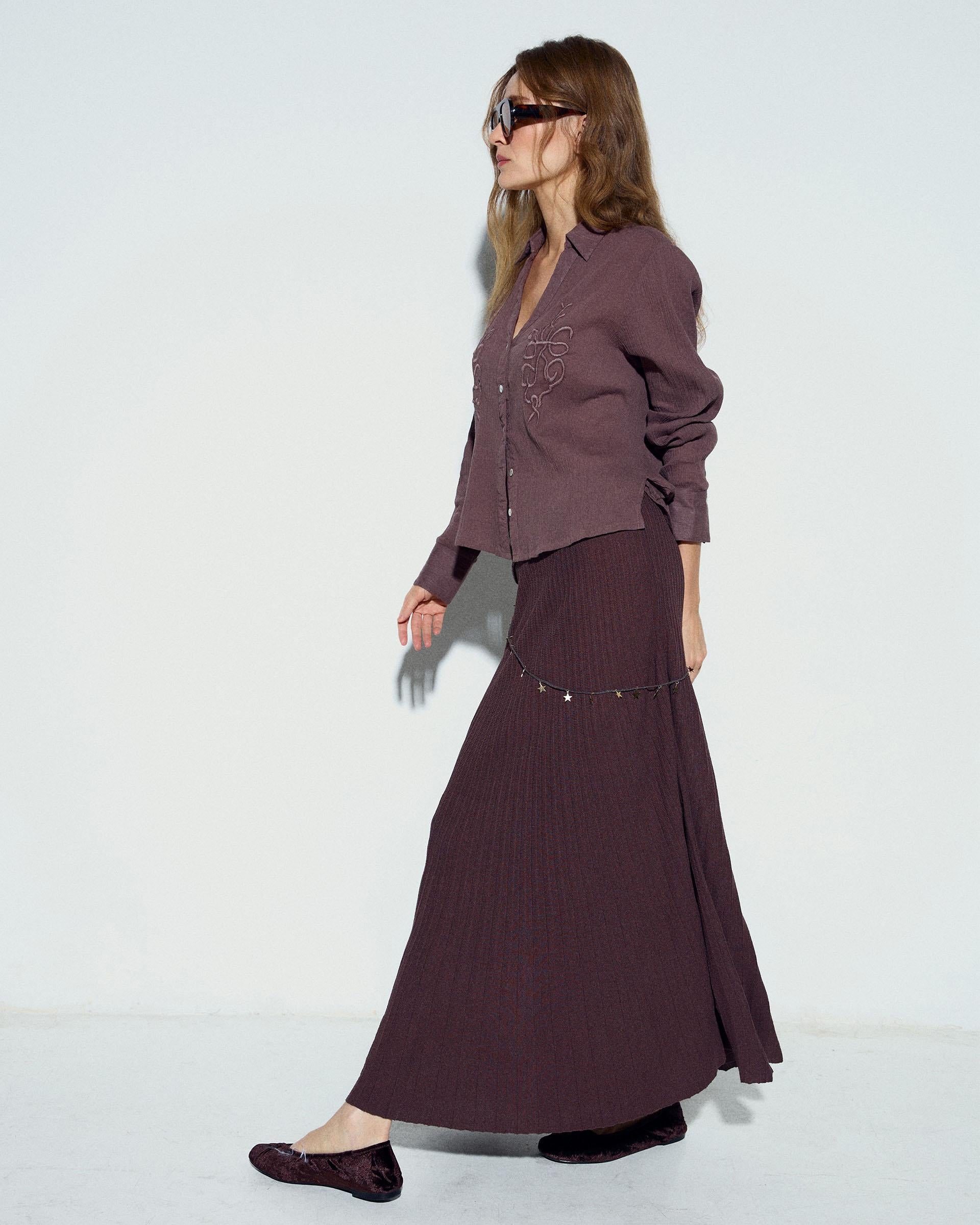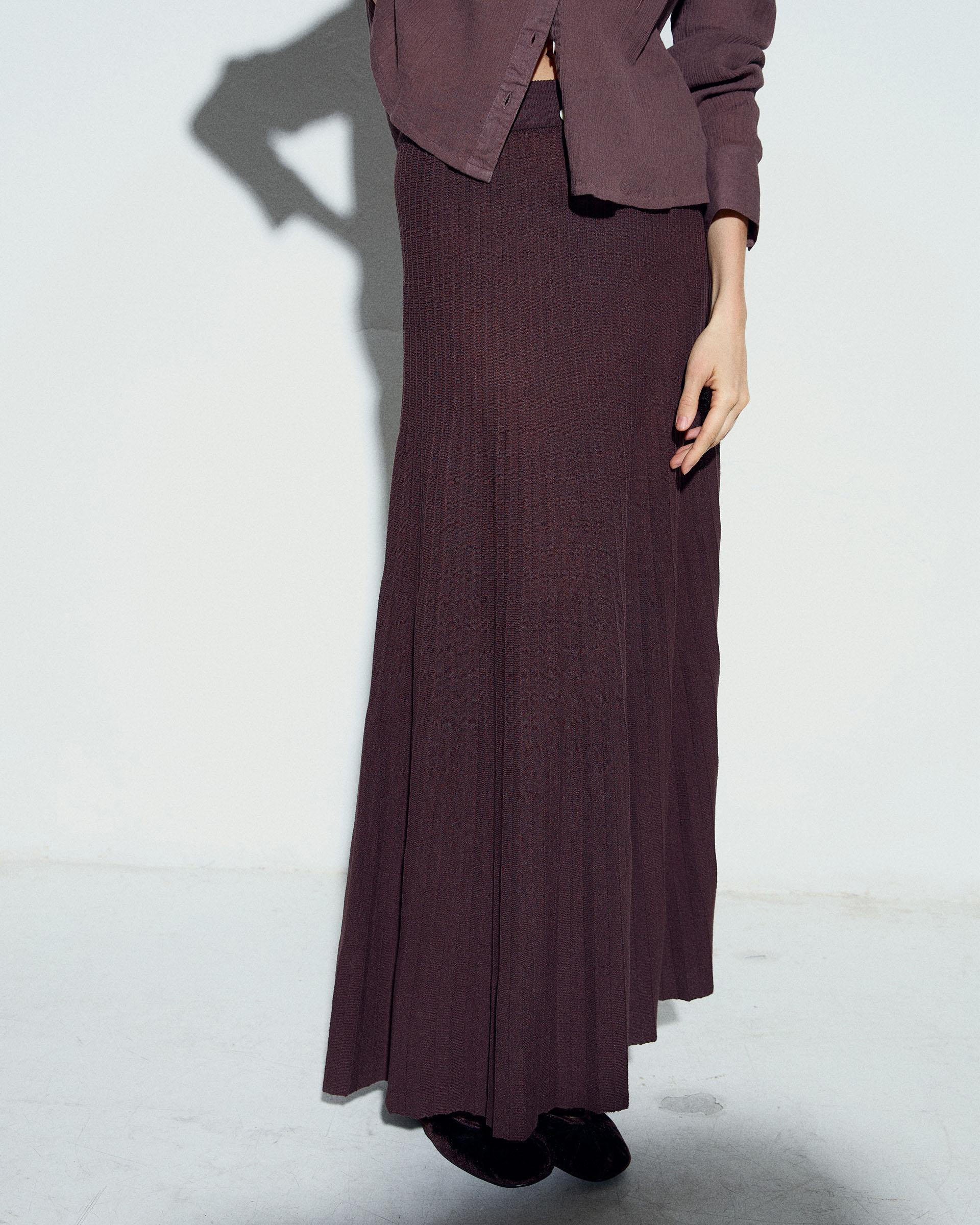 Falda larga de punto fino con goma en cinturilla y detalle de plisado, de color marrón.