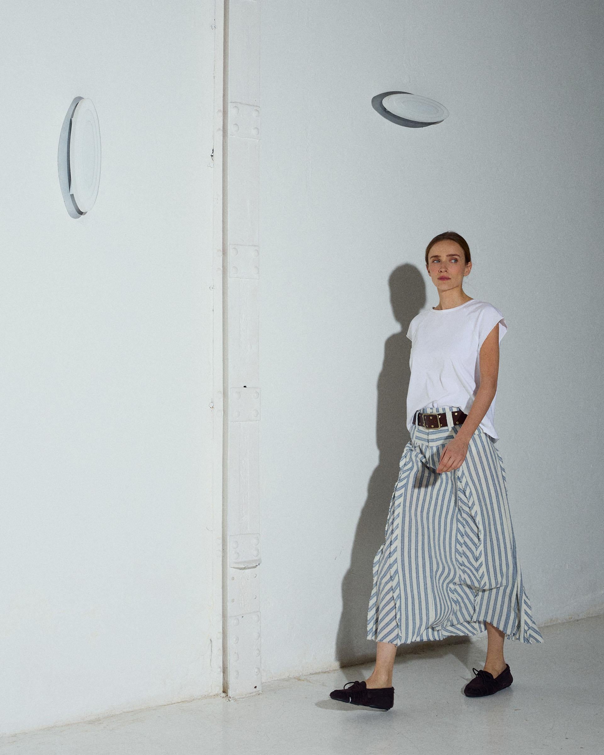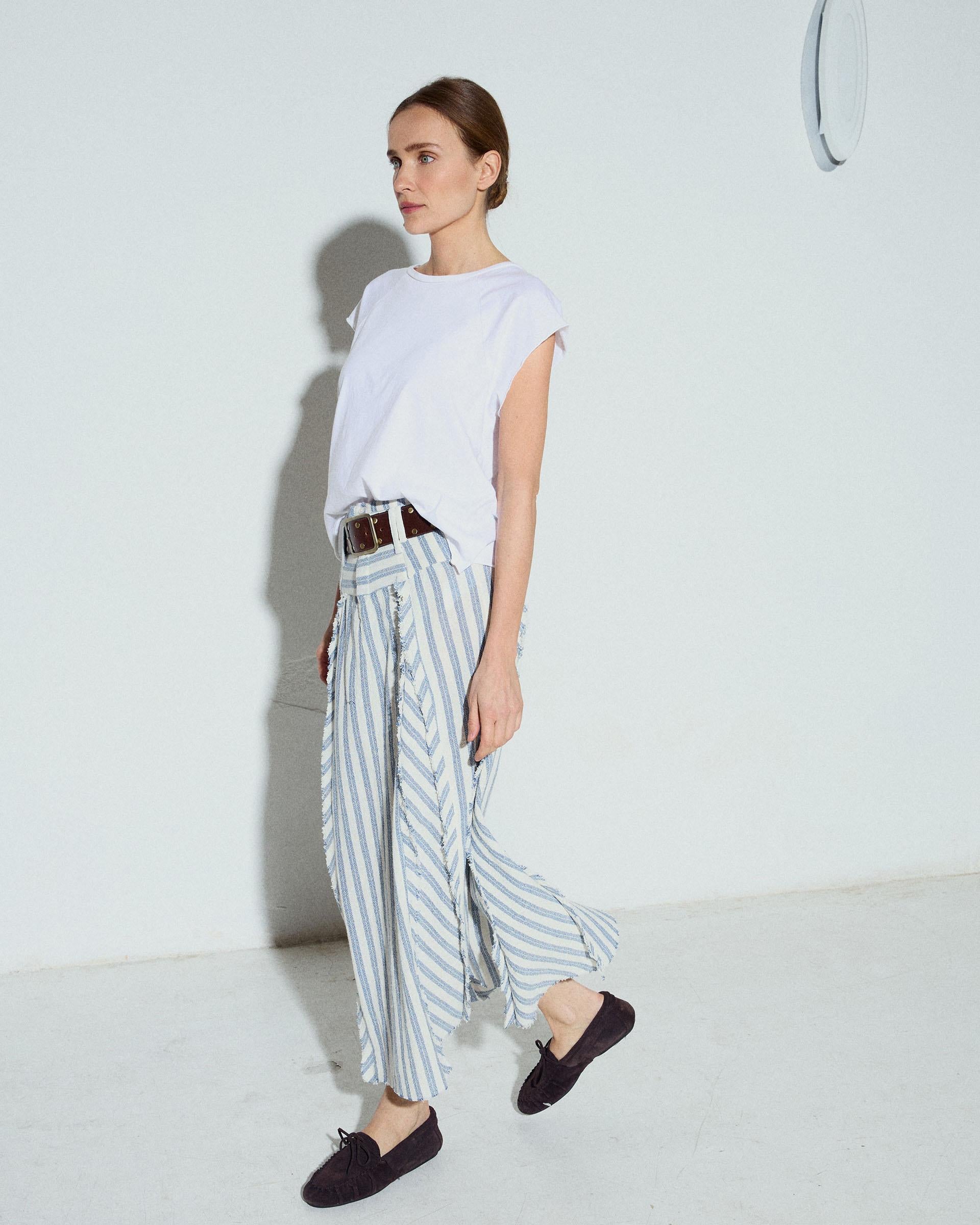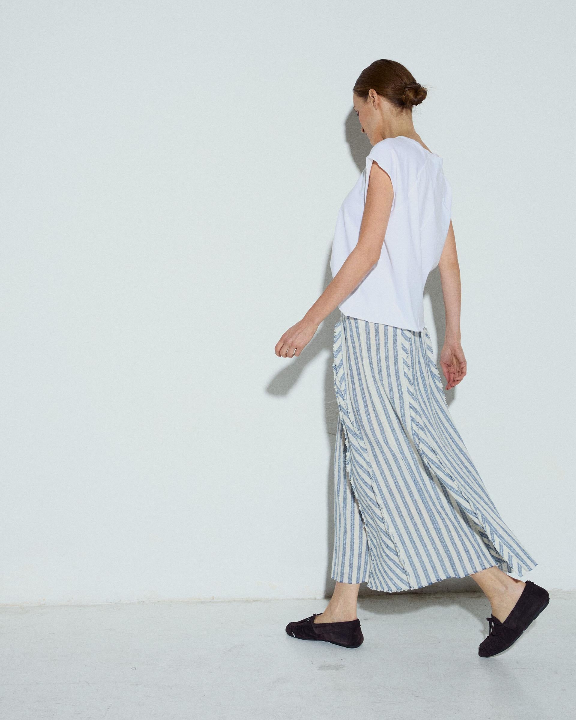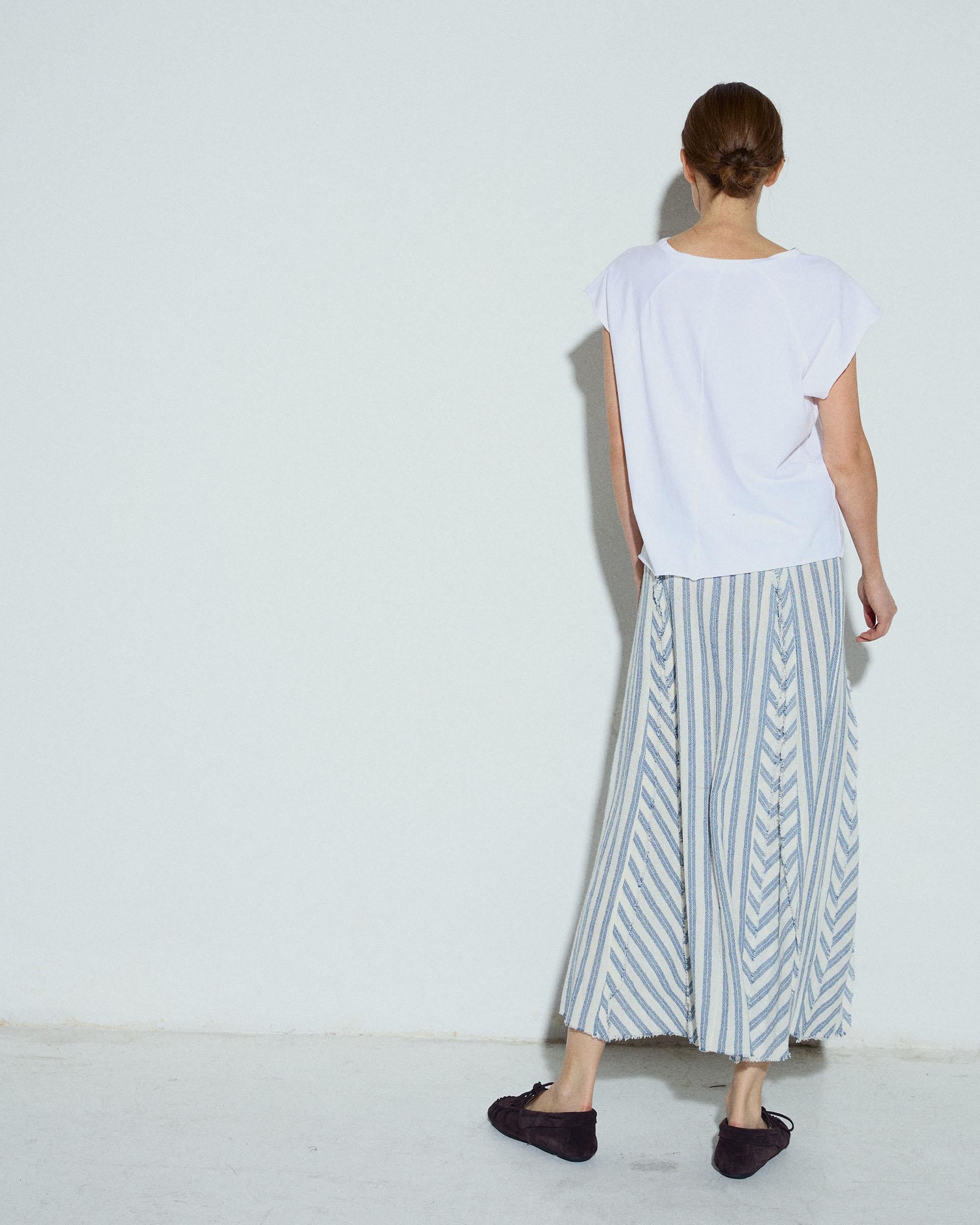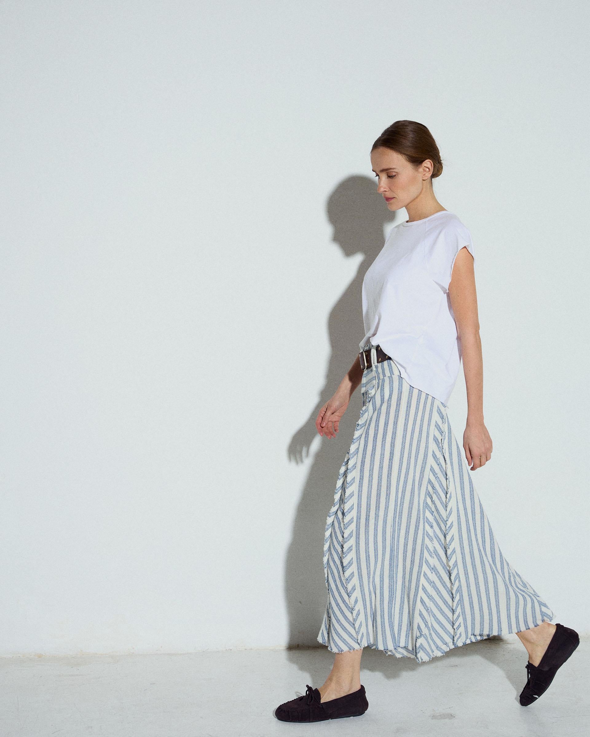 Falda larga con tejido rústico con estampado de rayas azul y blanco, cinturilla ancha y detalle de picos.