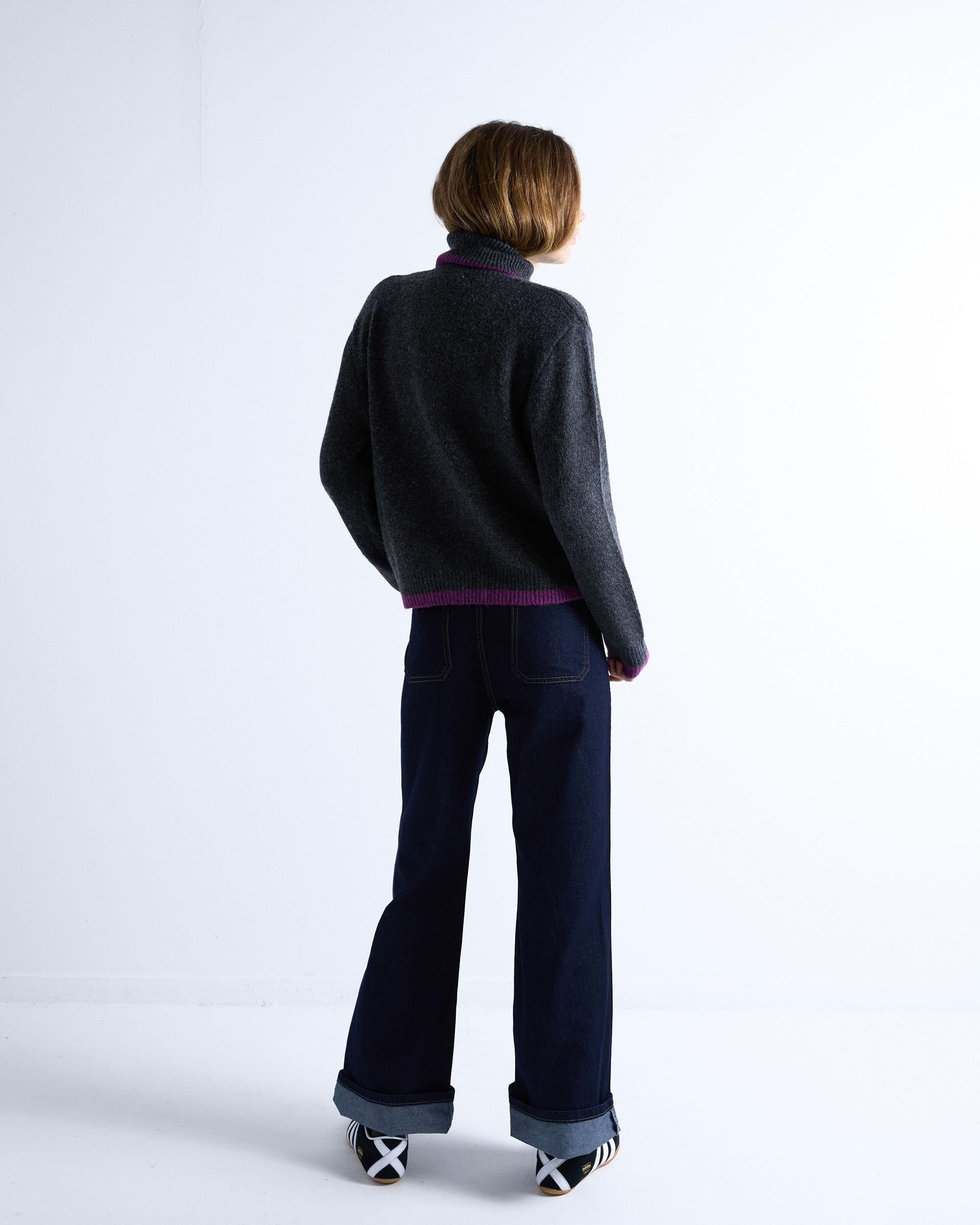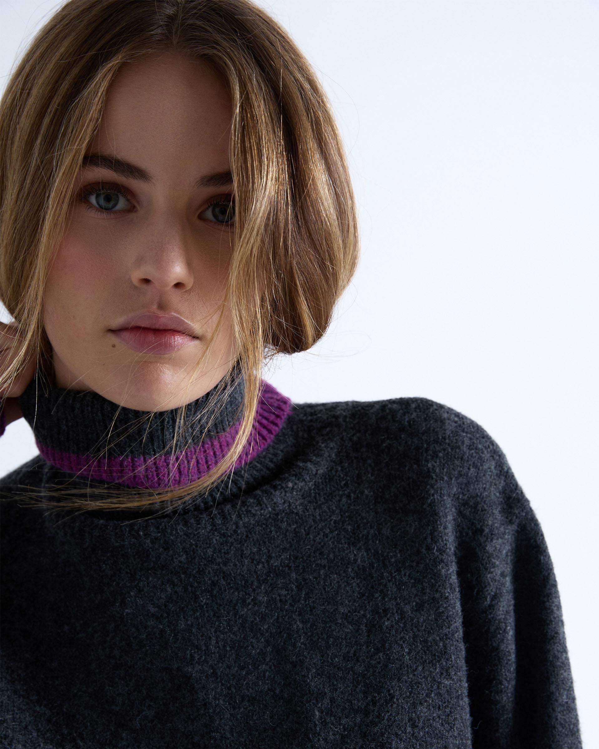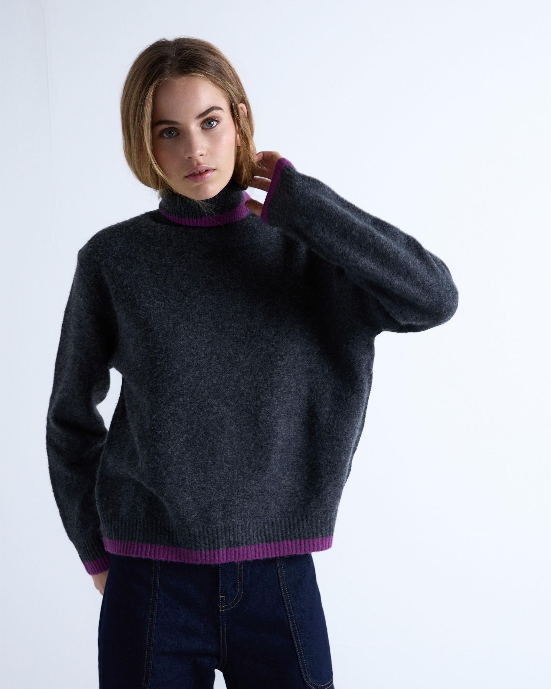 Jersey de punto de color antracita de cuello alto con detalle de contraste en morado en cuello, puños y bajo.