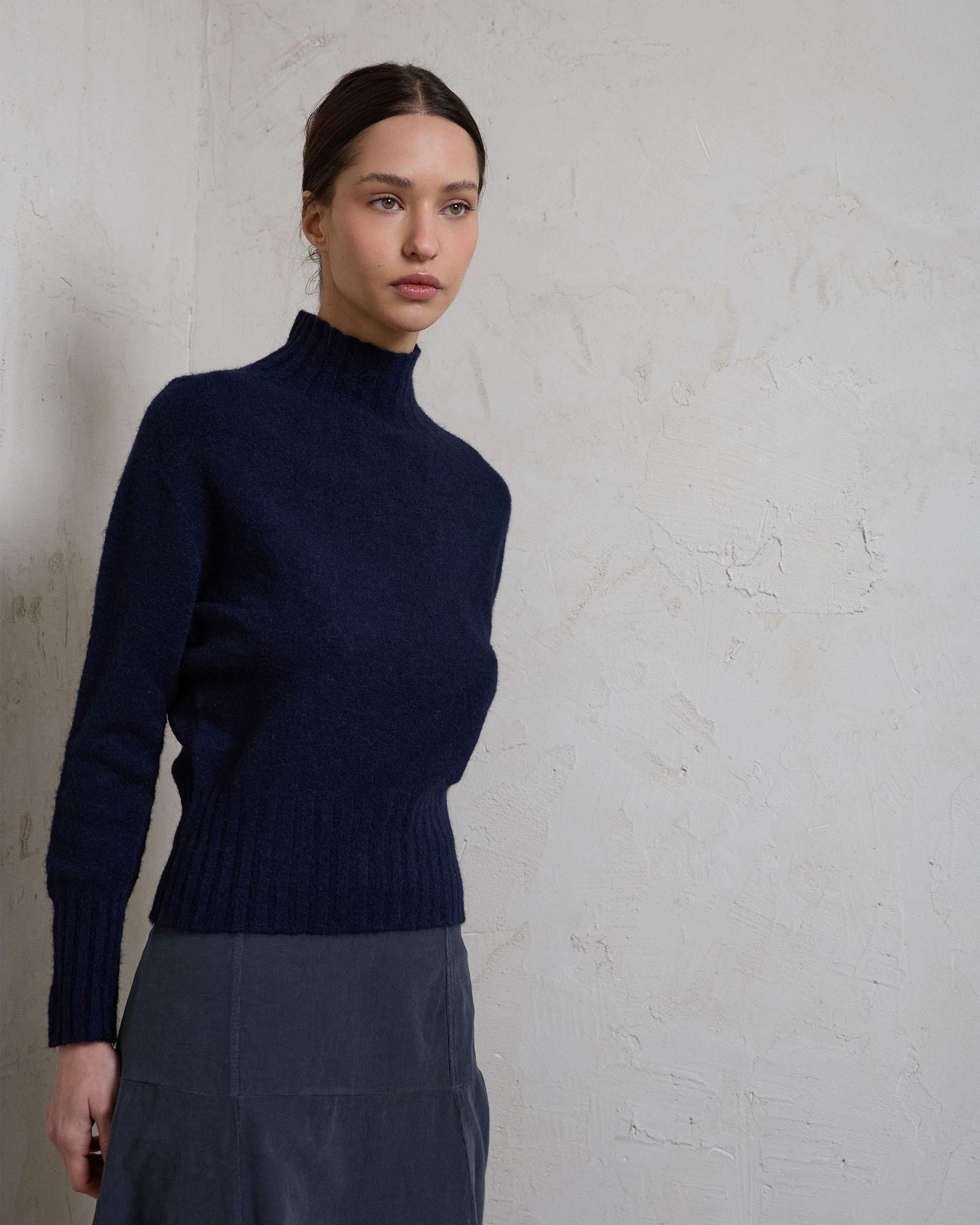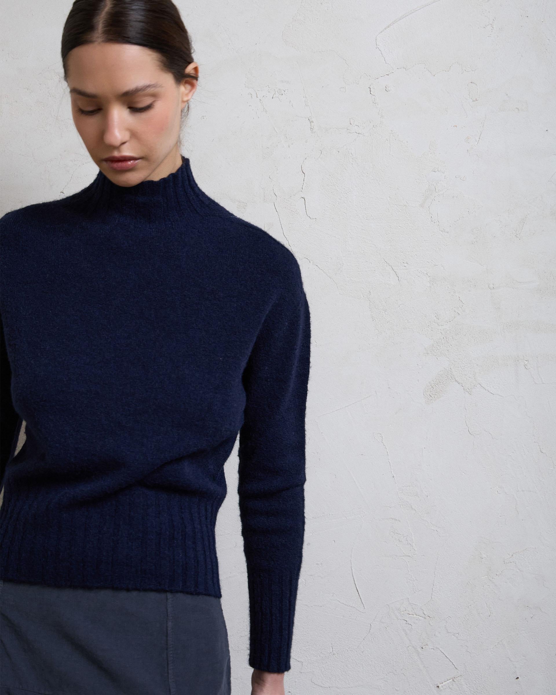 Jersey de punto de cuello alto en color azul marino con detalle de rib en el bajo.