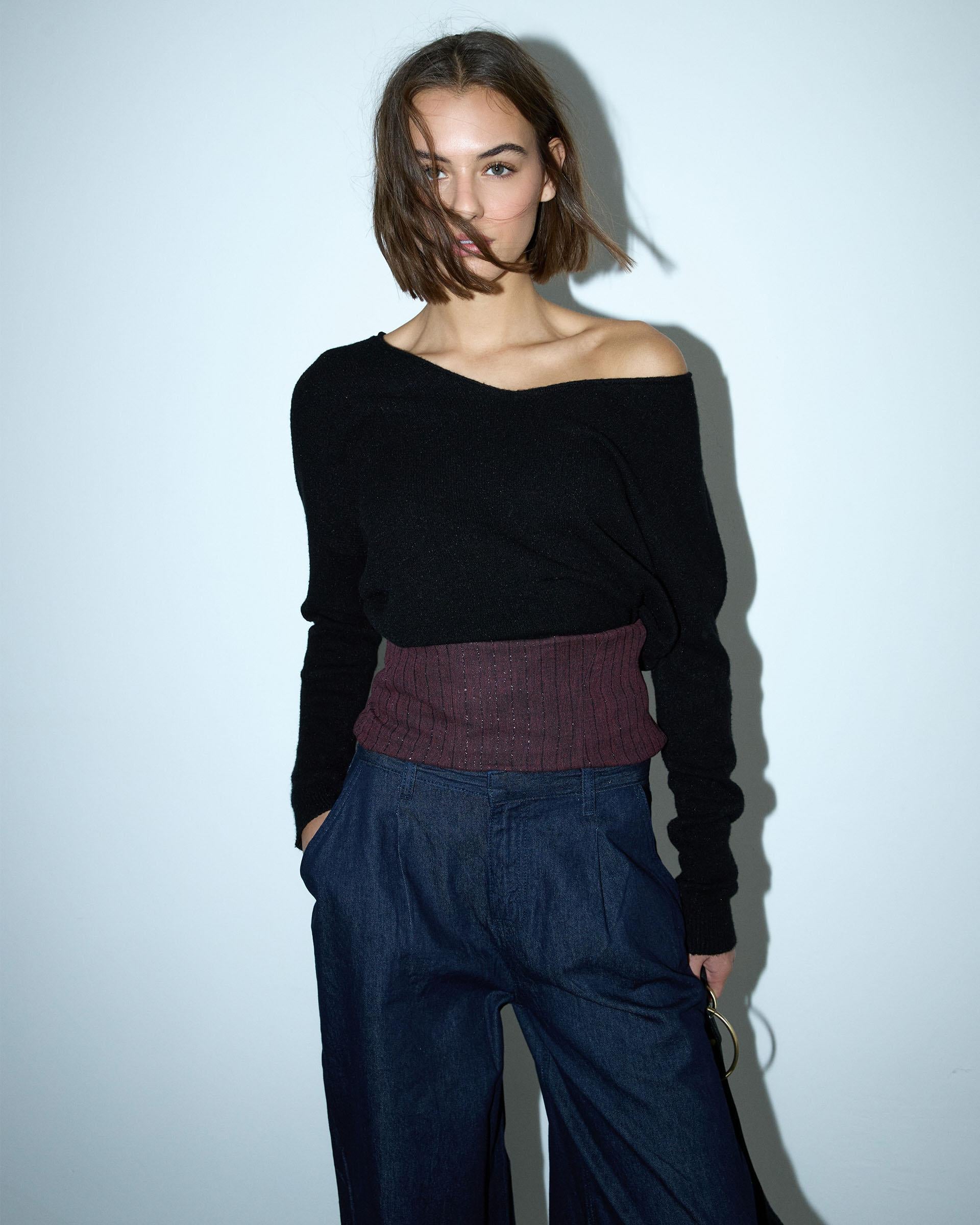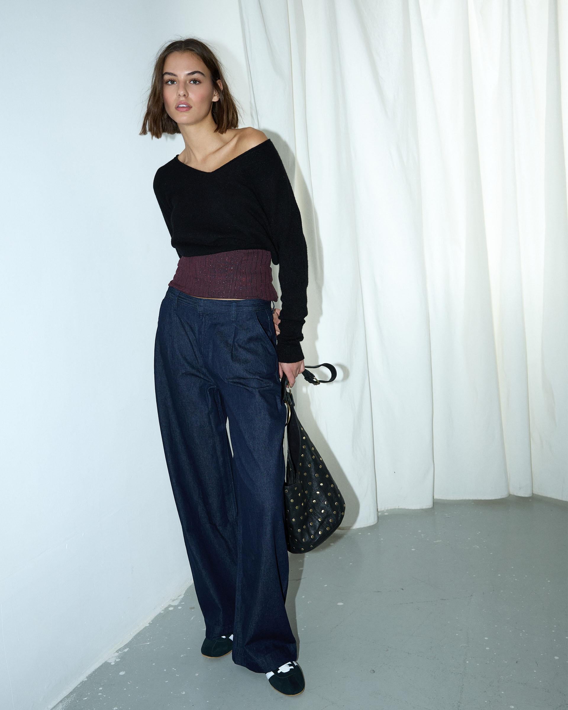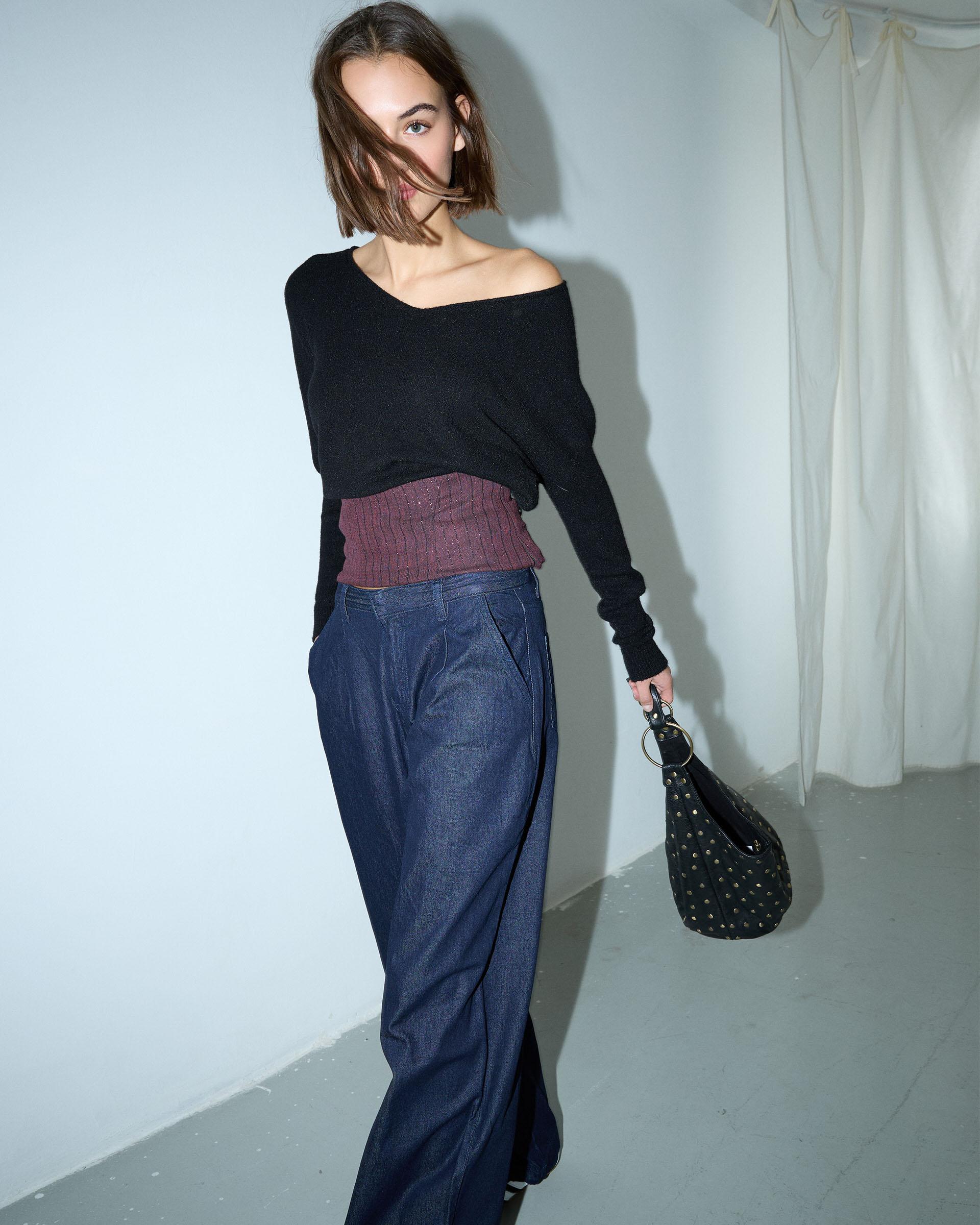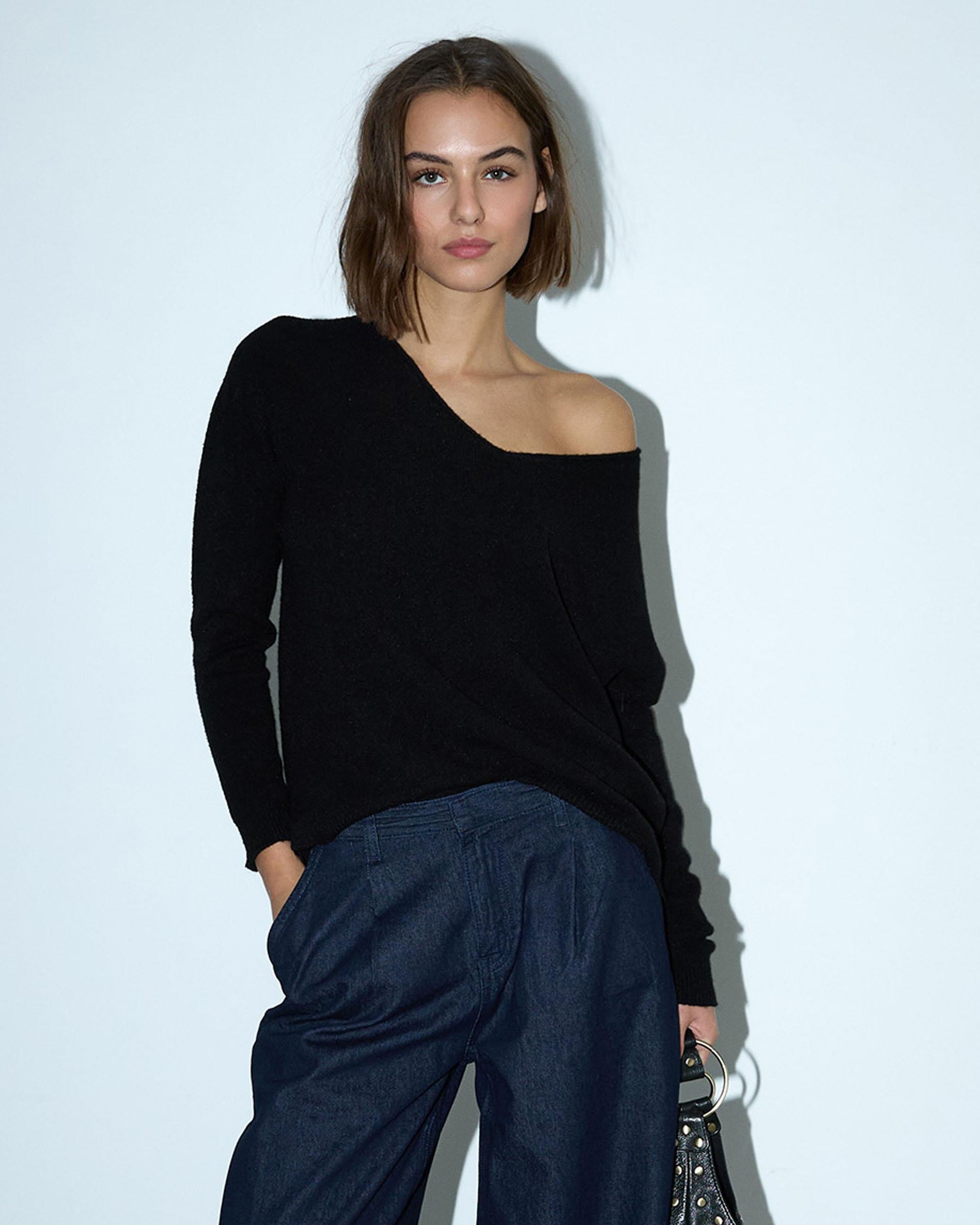 Jersey de punto de color negro estilo oversize, con cuello pico y bajo asimétrico.