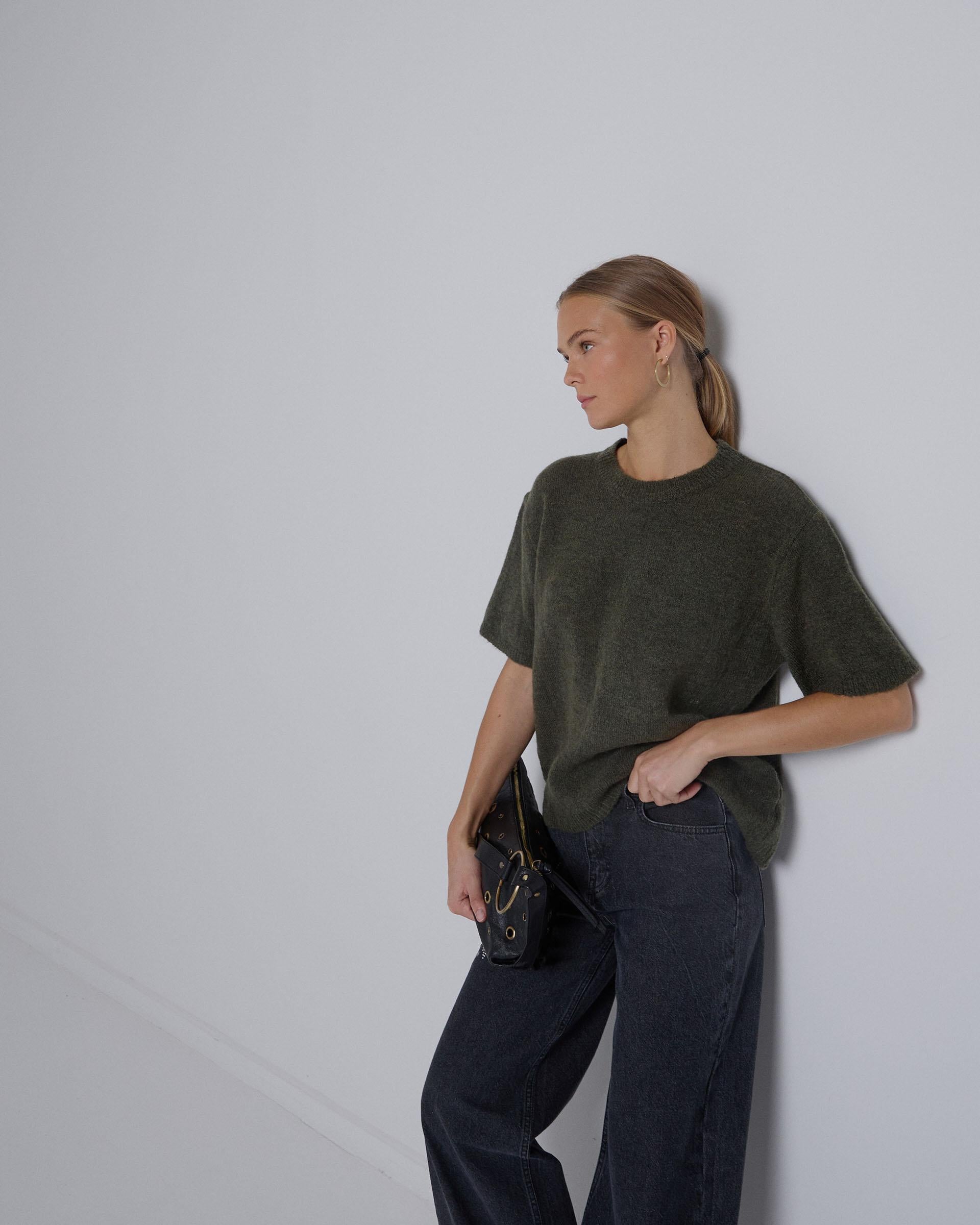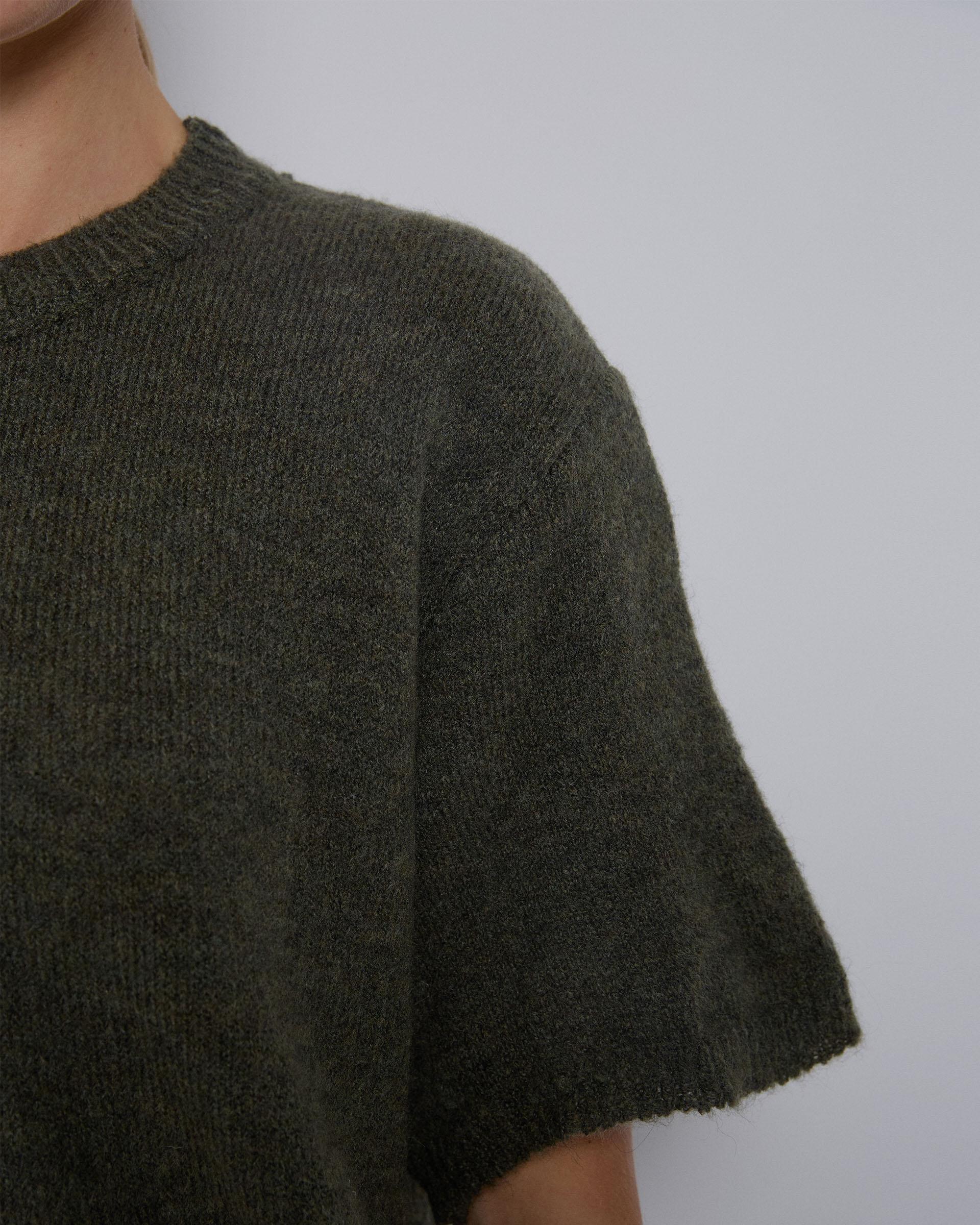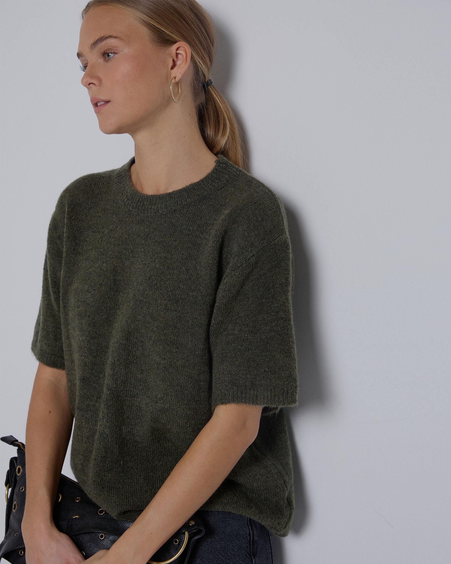Jersey de punto de manga corta y cuello redondo, de color verde oscuro.