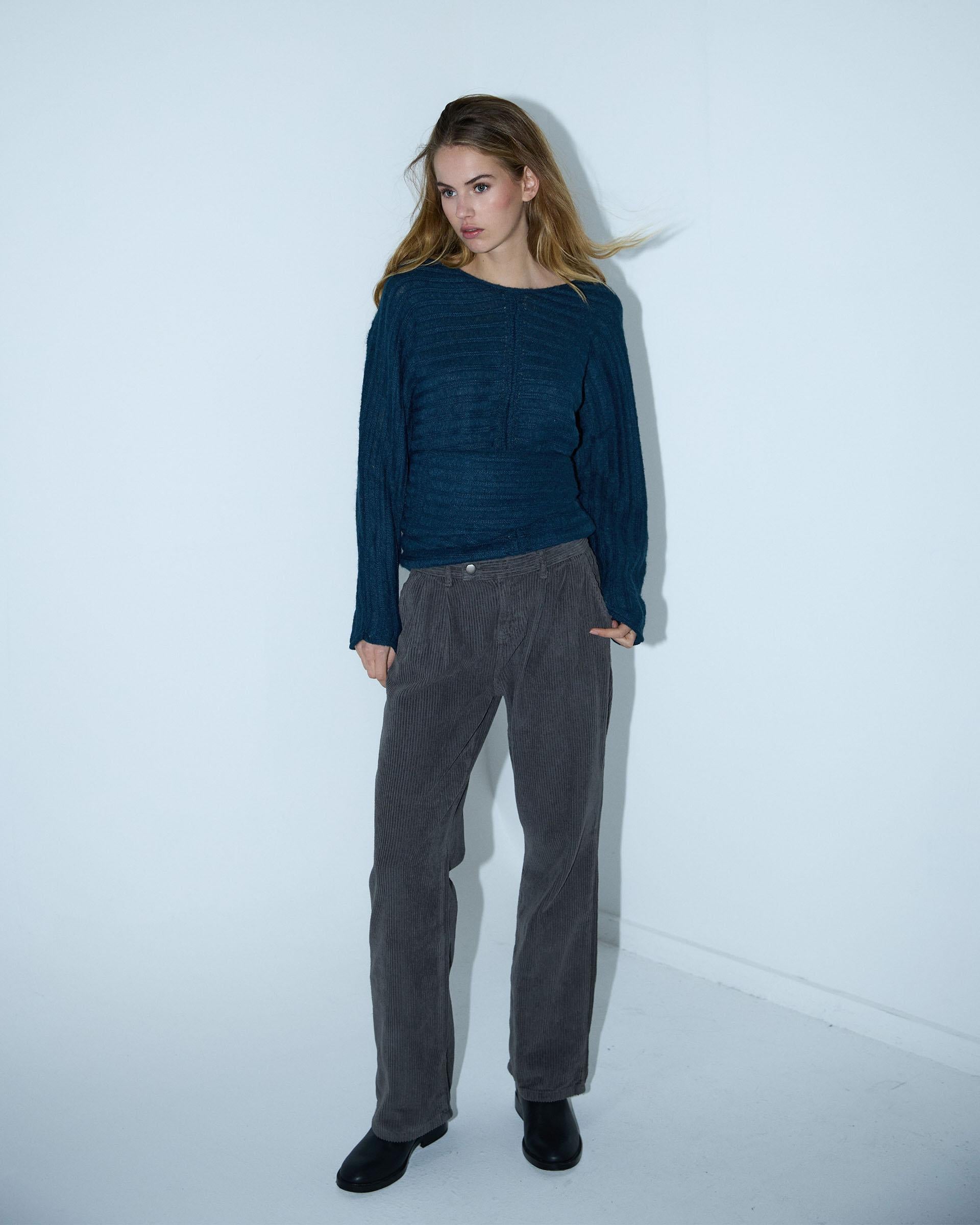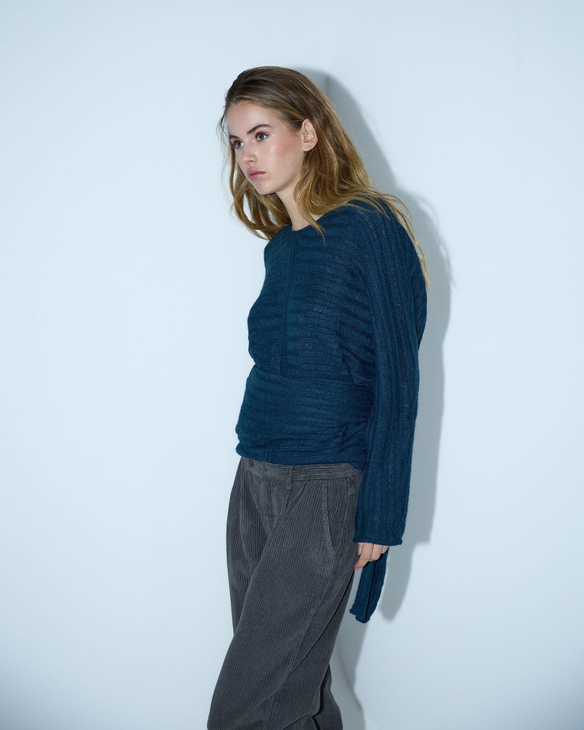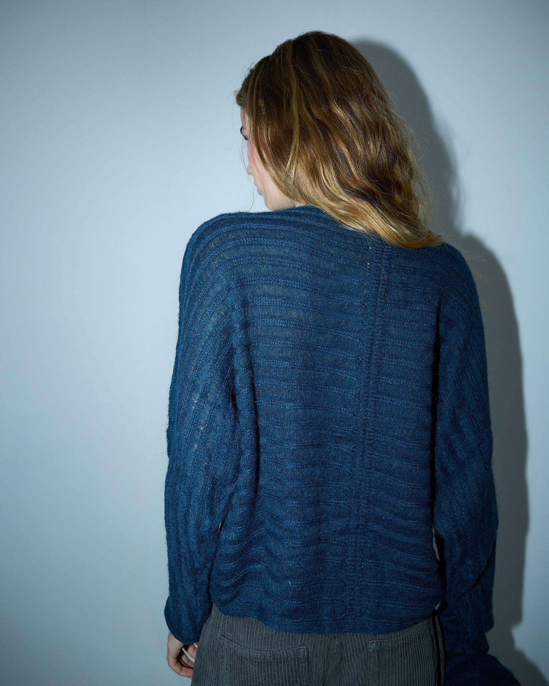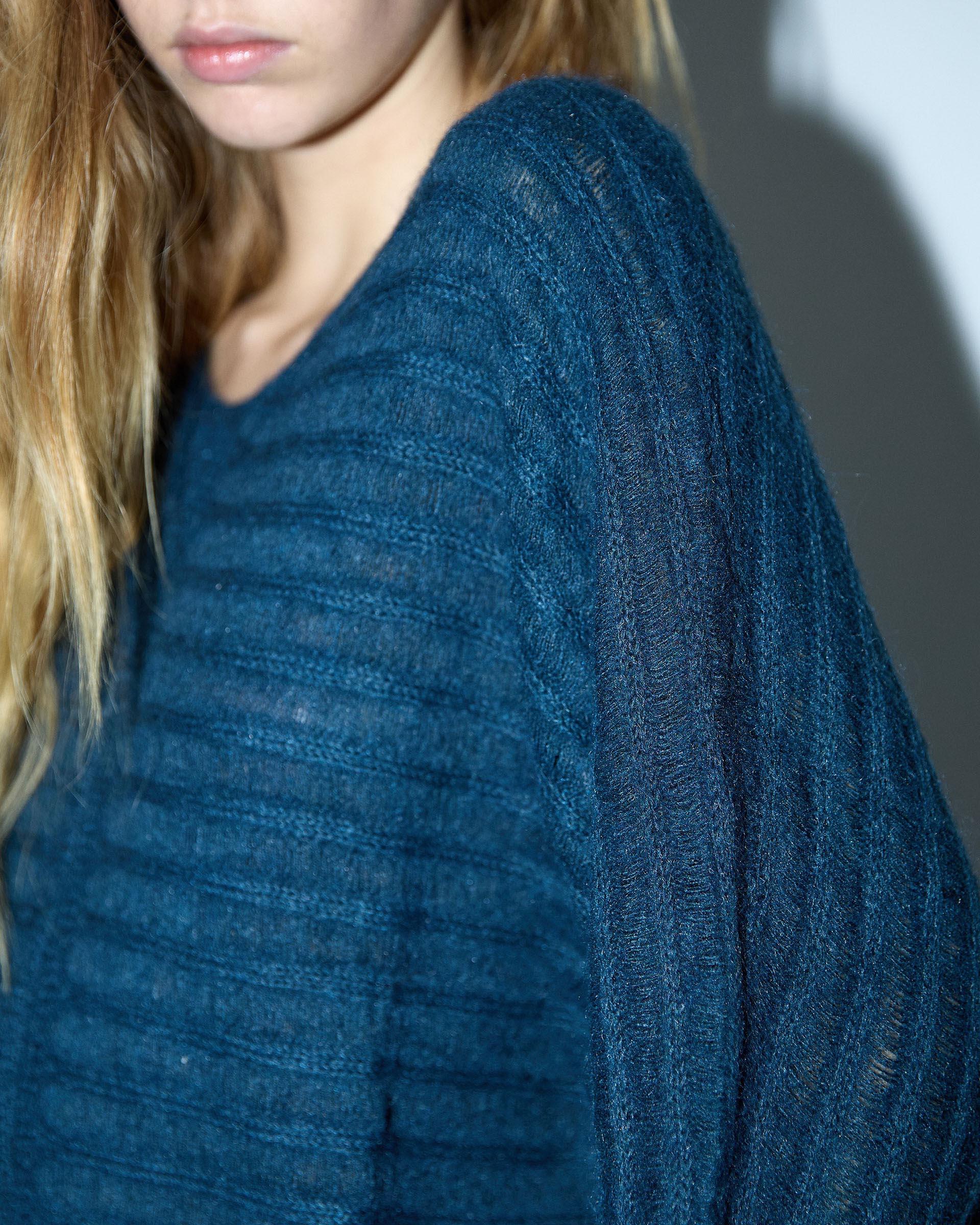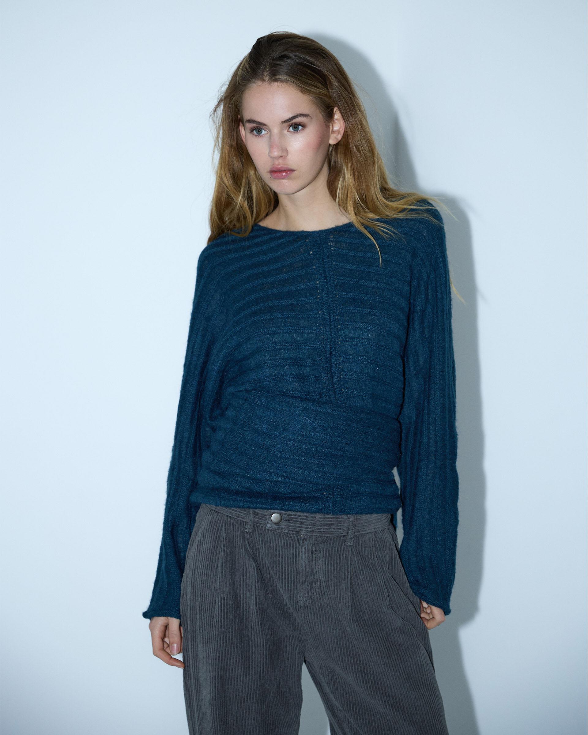Jersey de punto de color petróleo con rayas y costuras centrales en delantero y trasero.