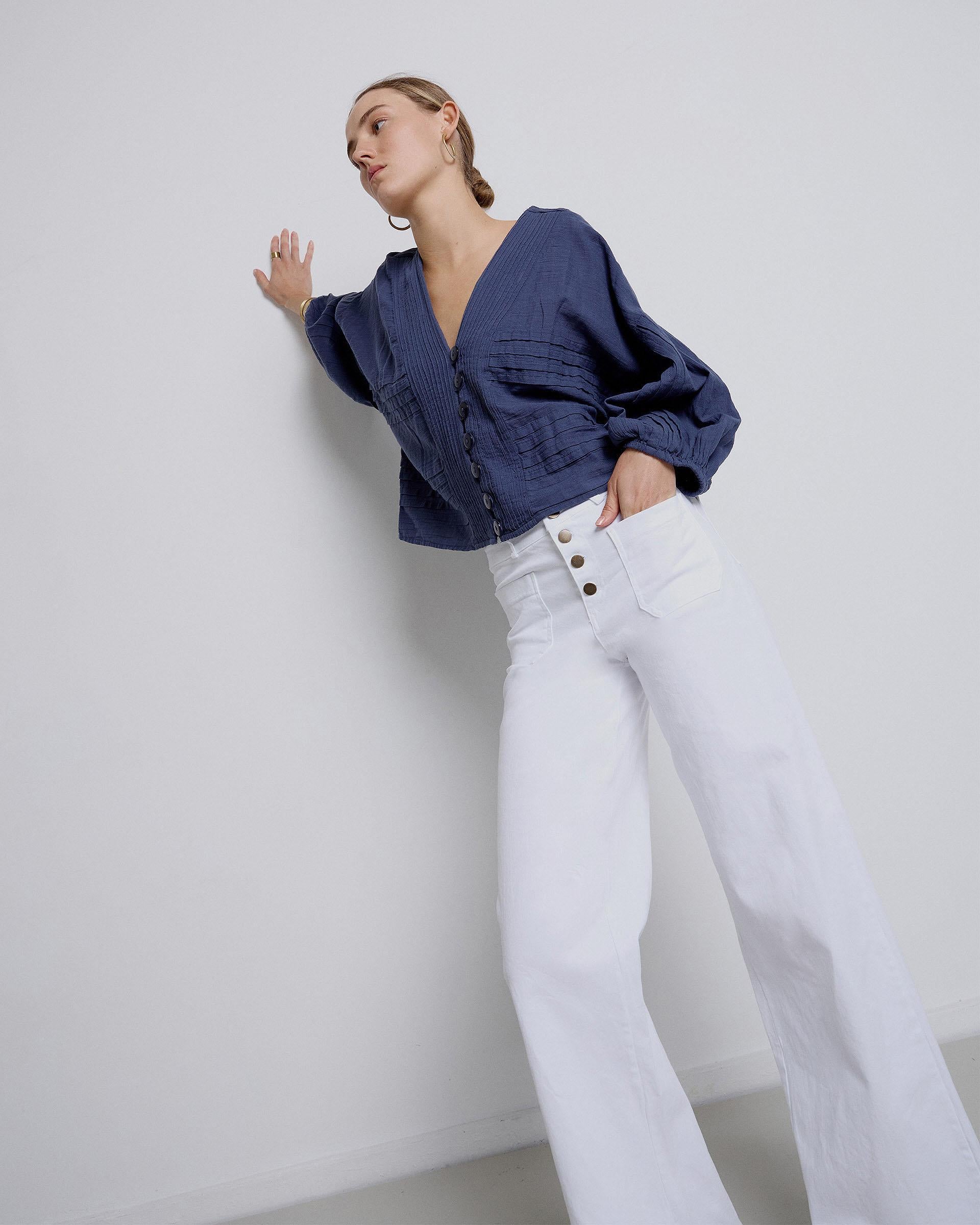 Pantalón con bolsillos de plastón abotonado de corte recto con trabillas en la cintura de color blanco.