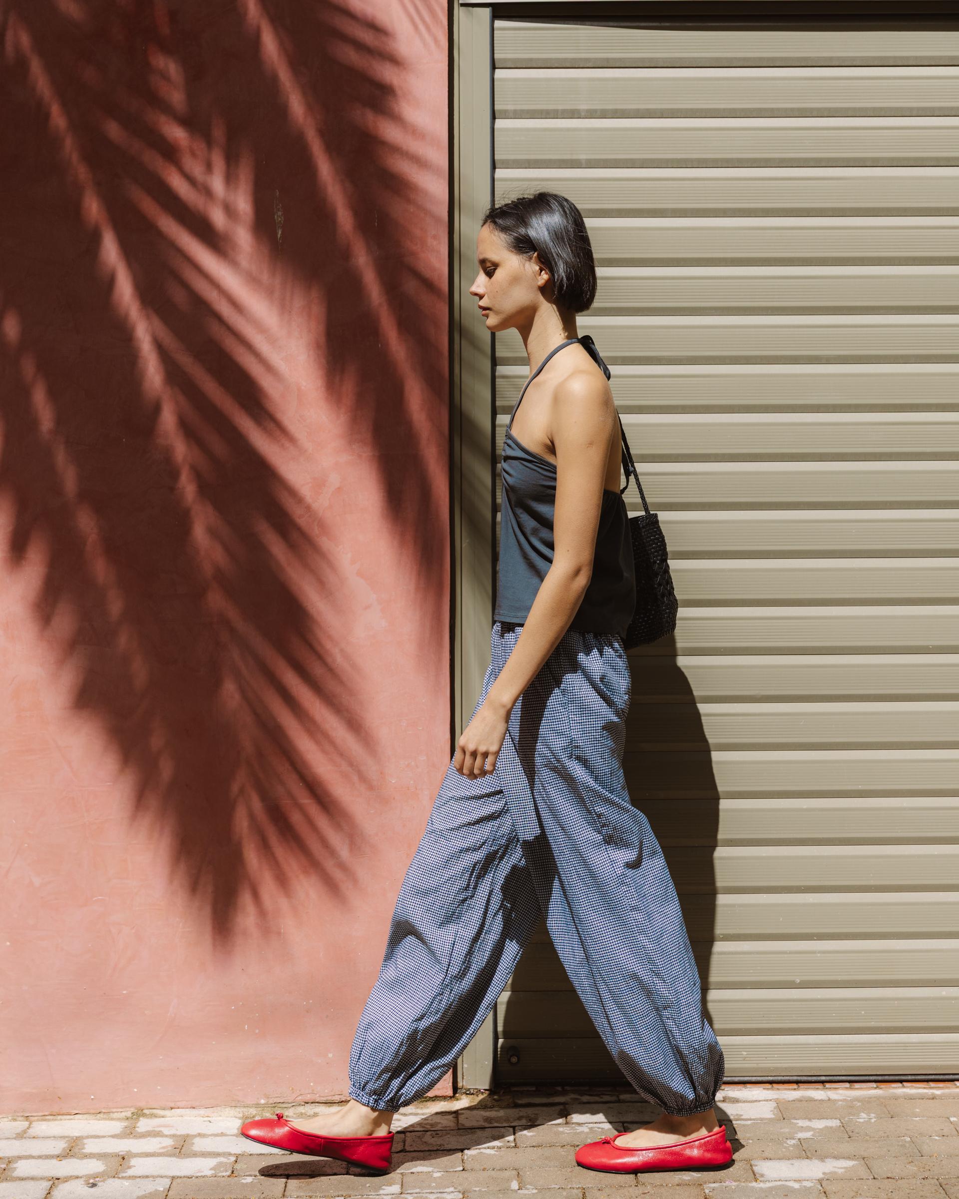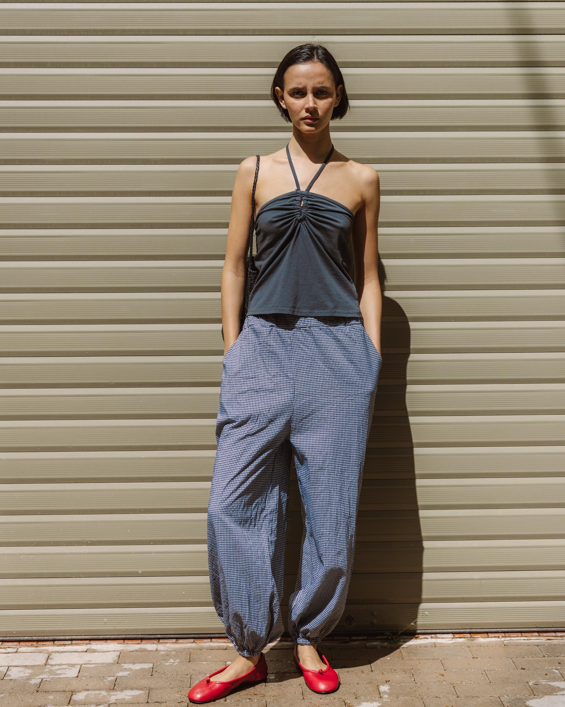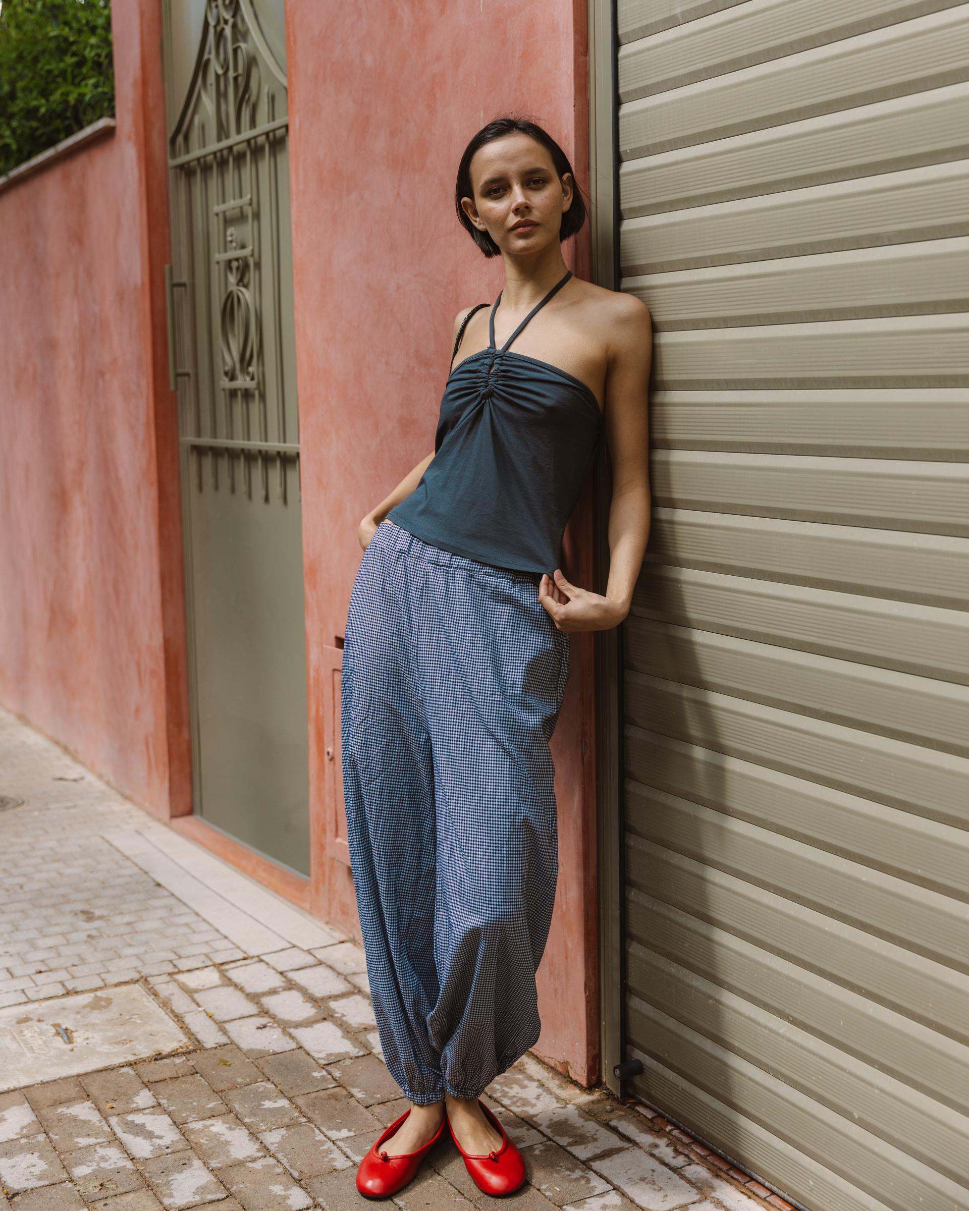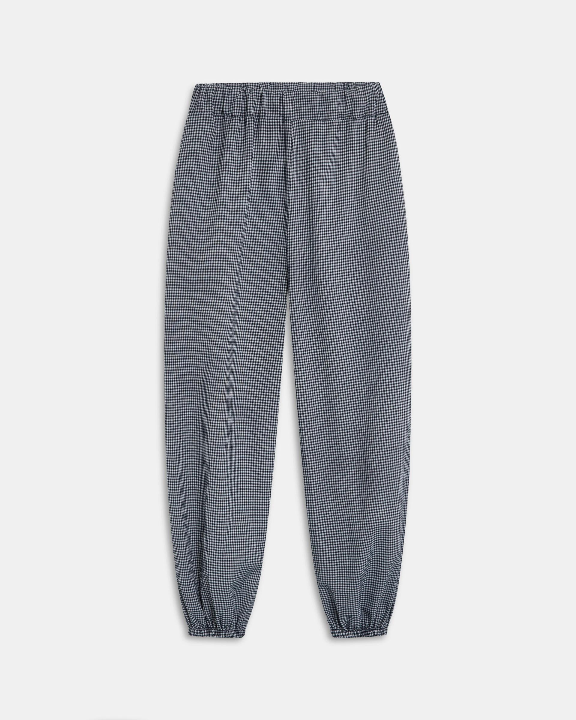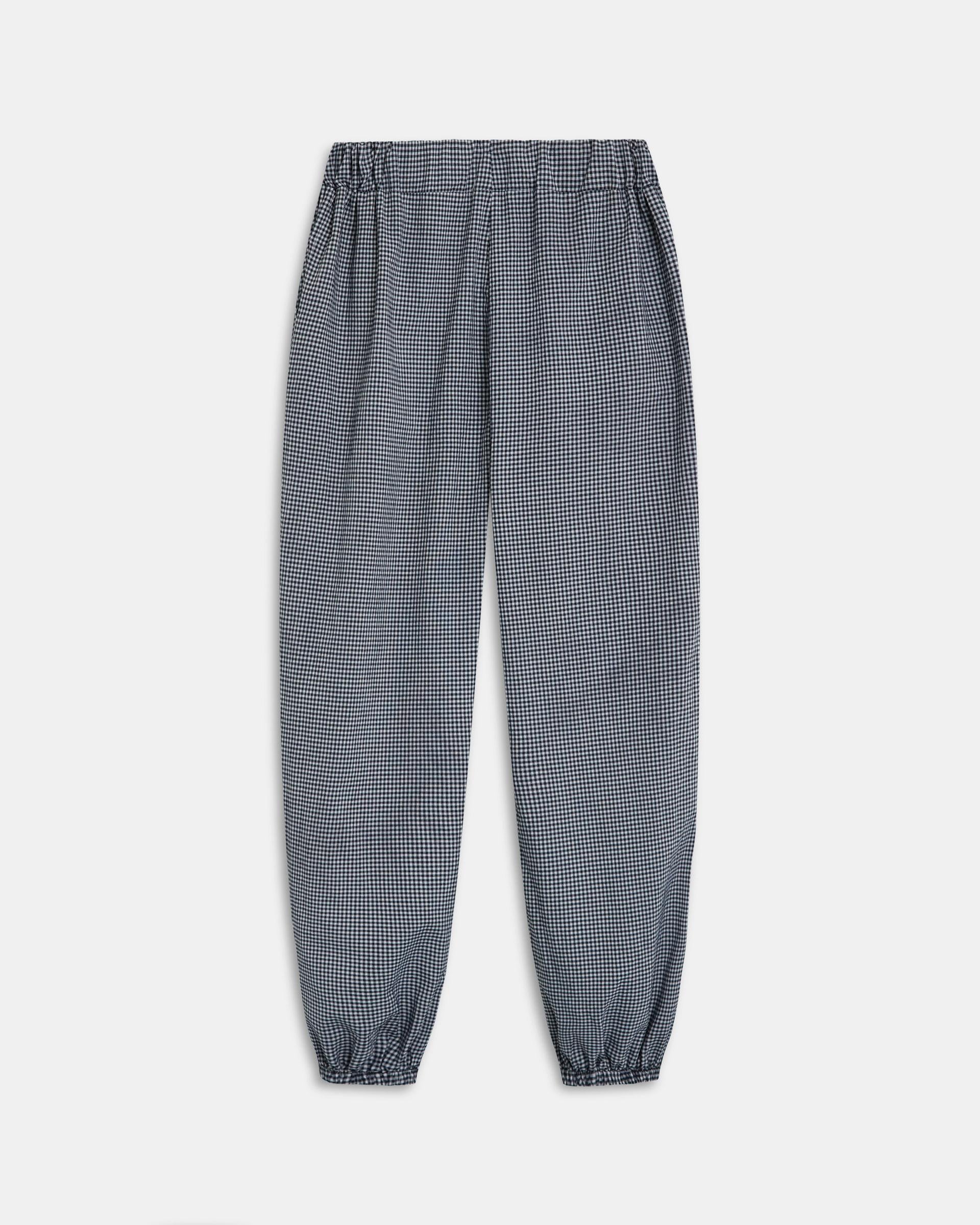 Pantalón bombacho con cuadros vichy en color azul oscuro y detalle de goma en cinturilla.