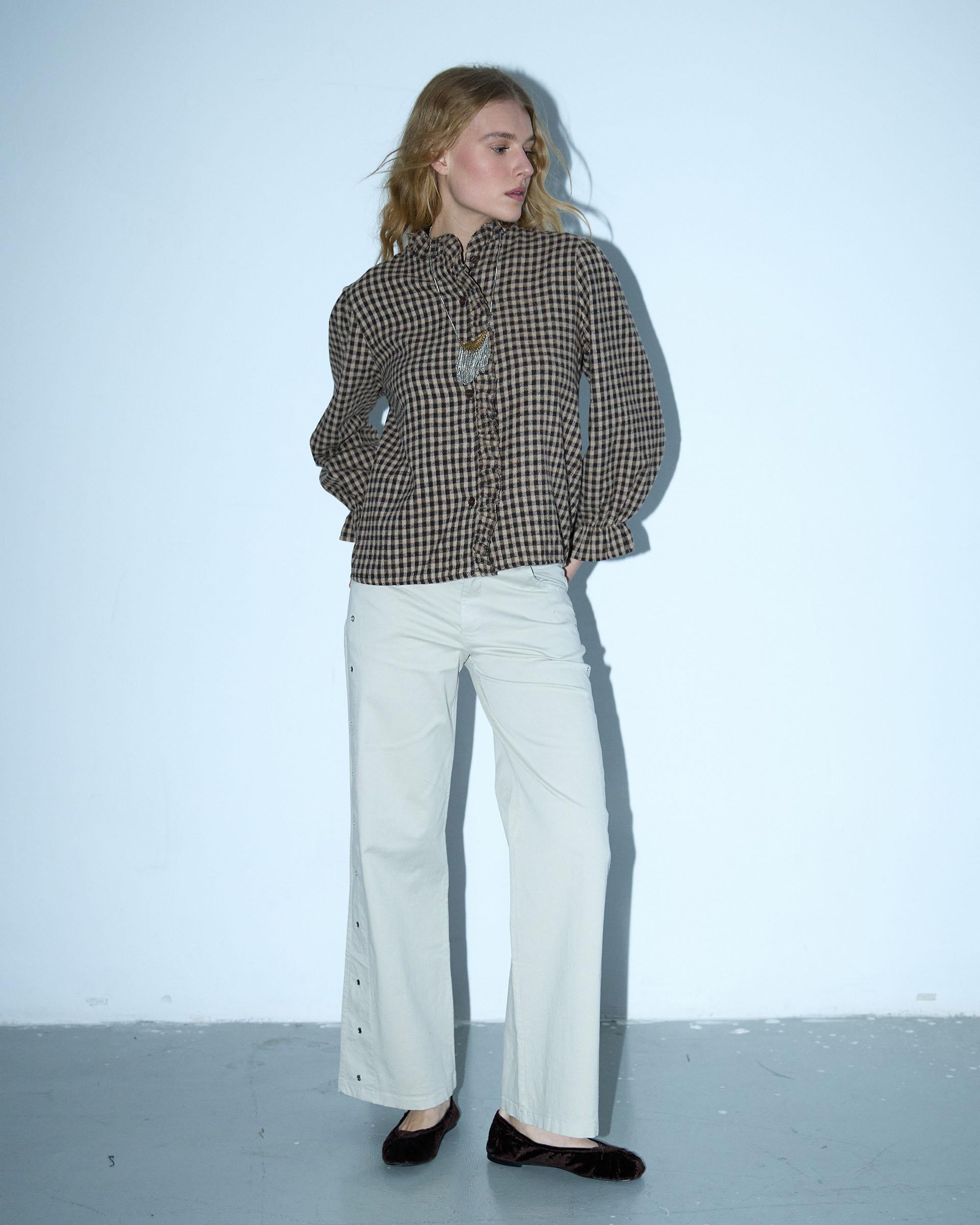 Pantalón largo tipo denim en color crudo con detalle de eyelets en laterales y cierre con cremallera y botón en delantero.