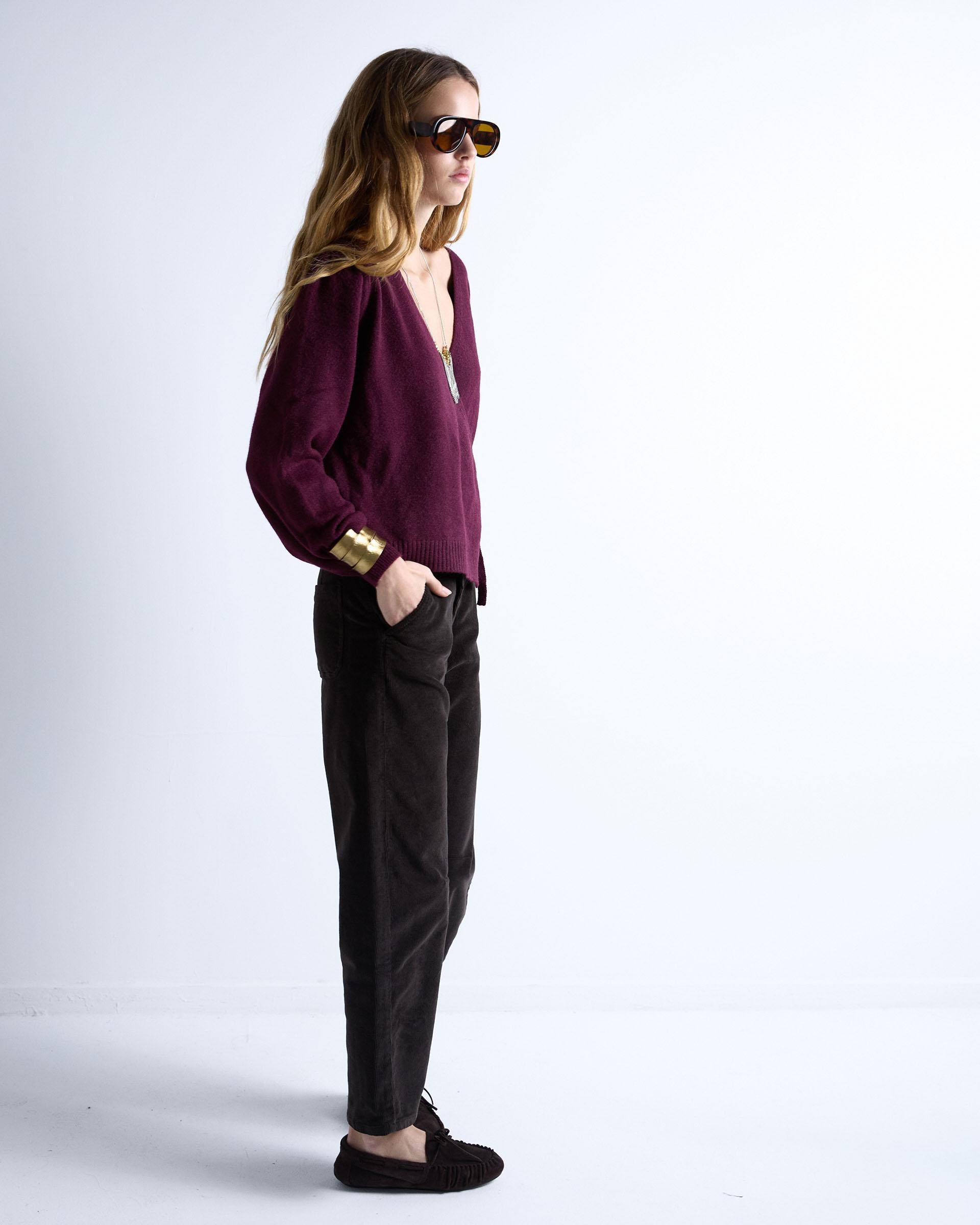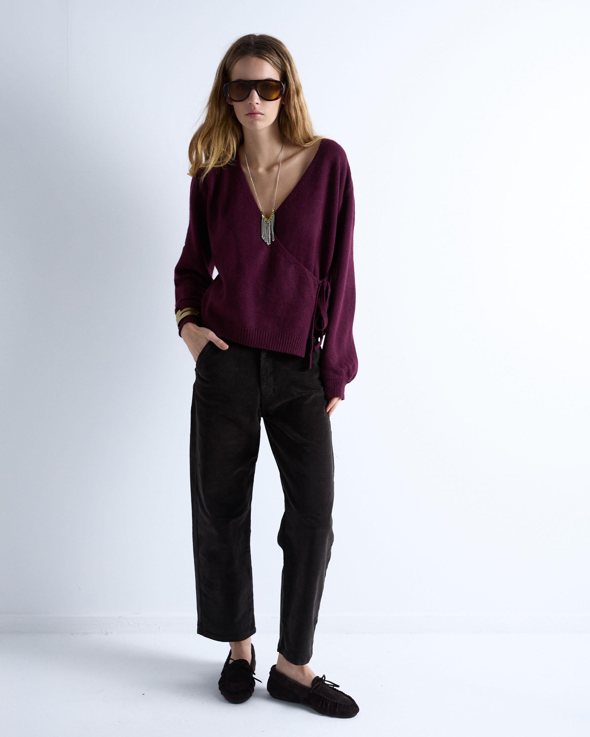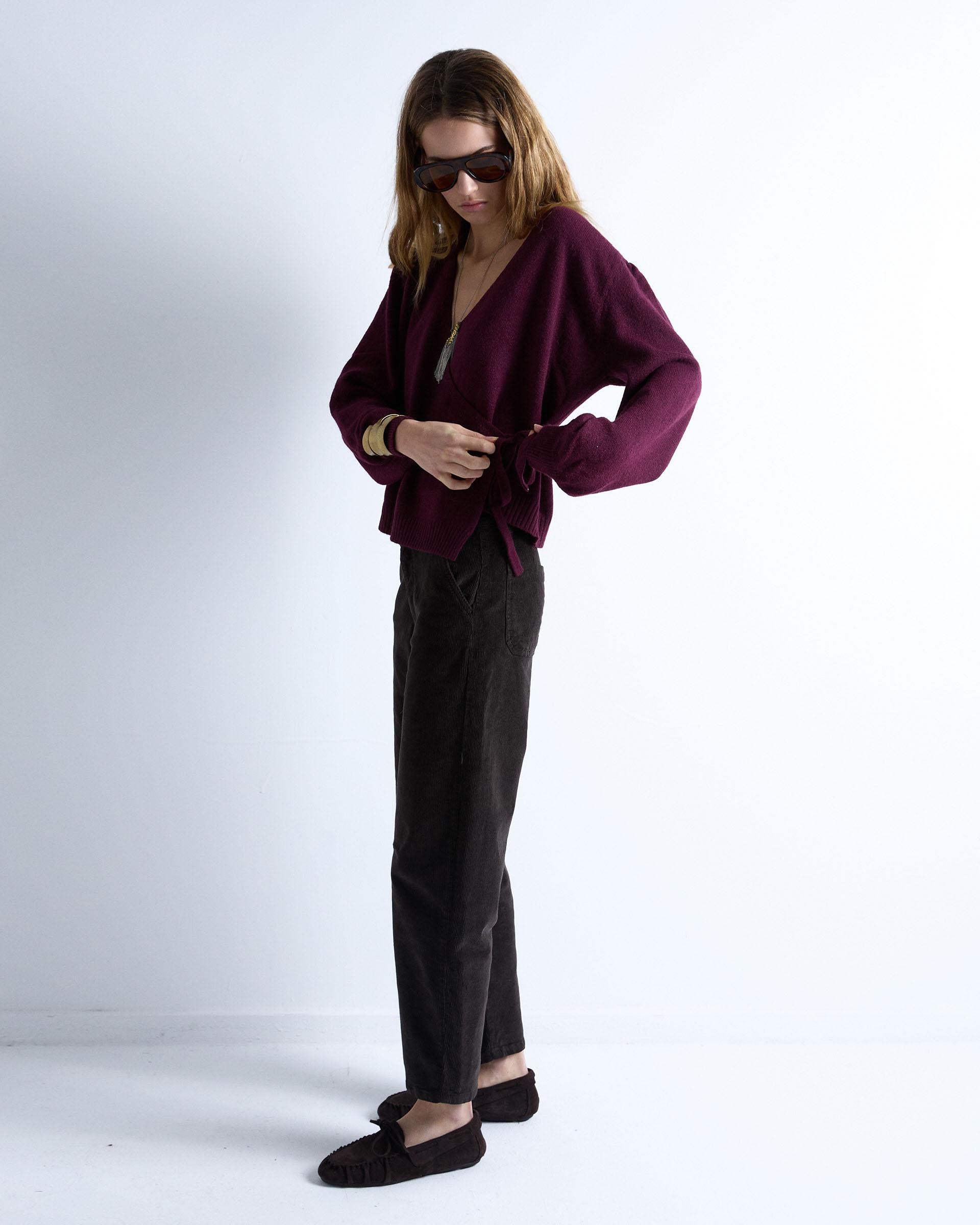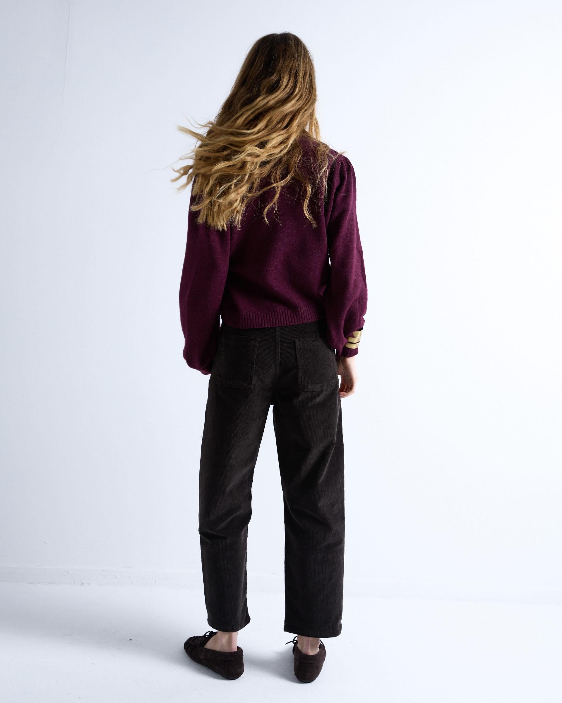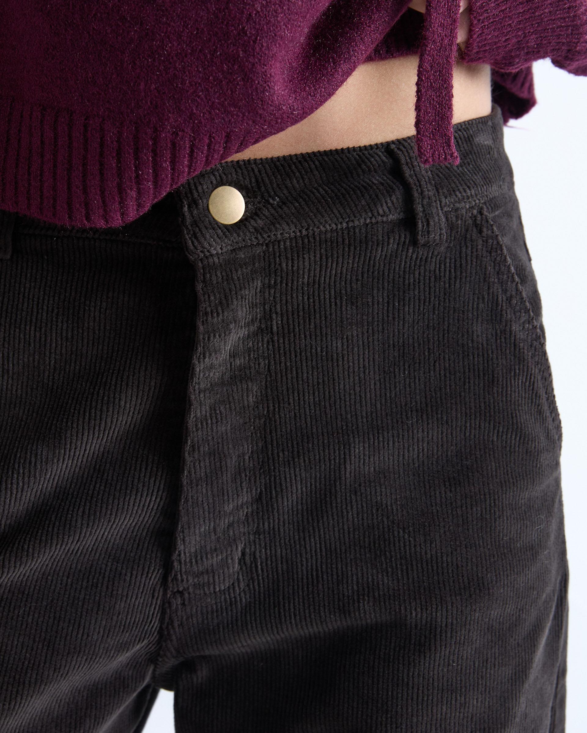 Pantalón largo de pana estilo balloon, botón y cremallera a modo de cierre, de color marrón.