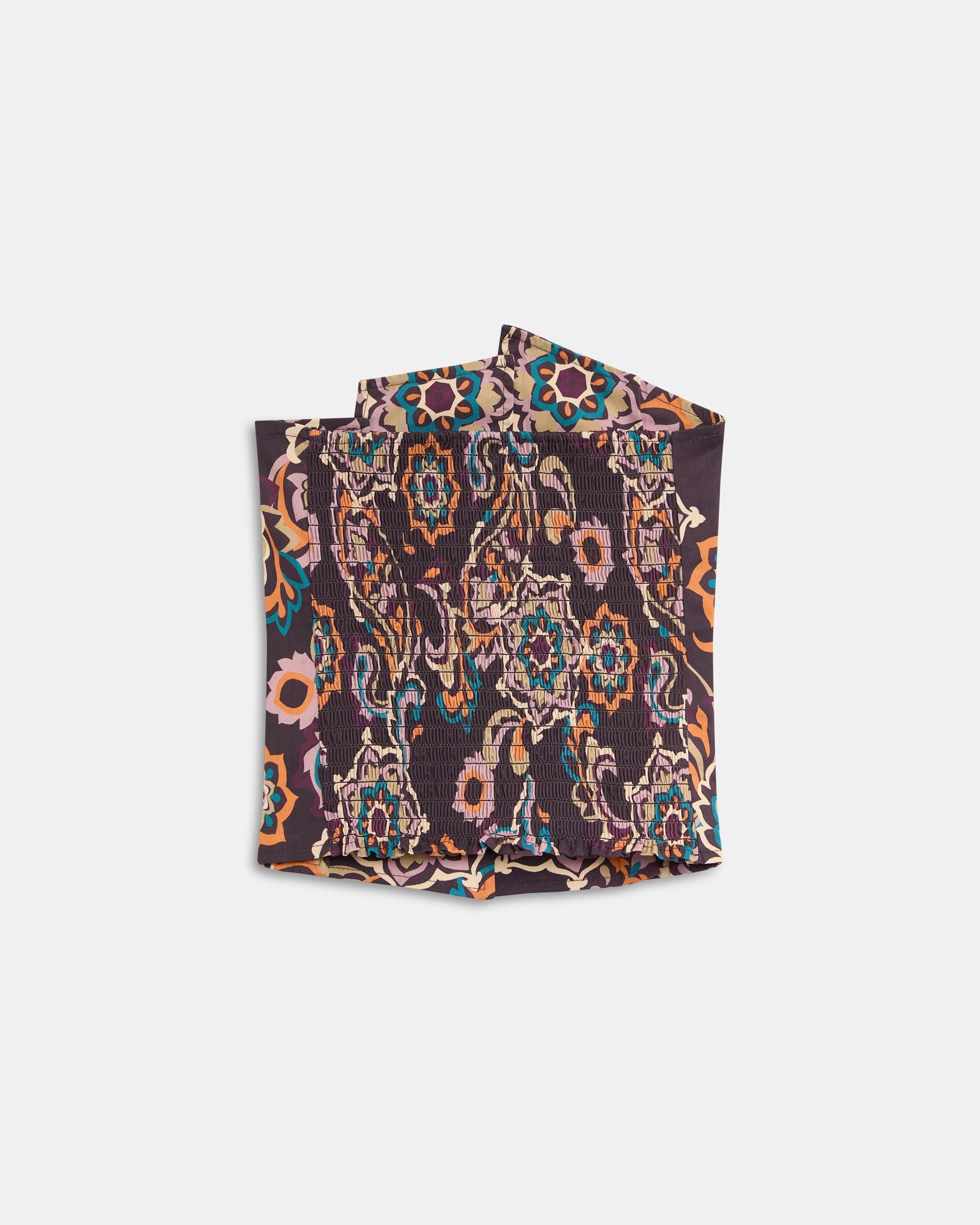 Top tipo corsetero palabra de honor con estampado floral en color morado y detalle de cortes.