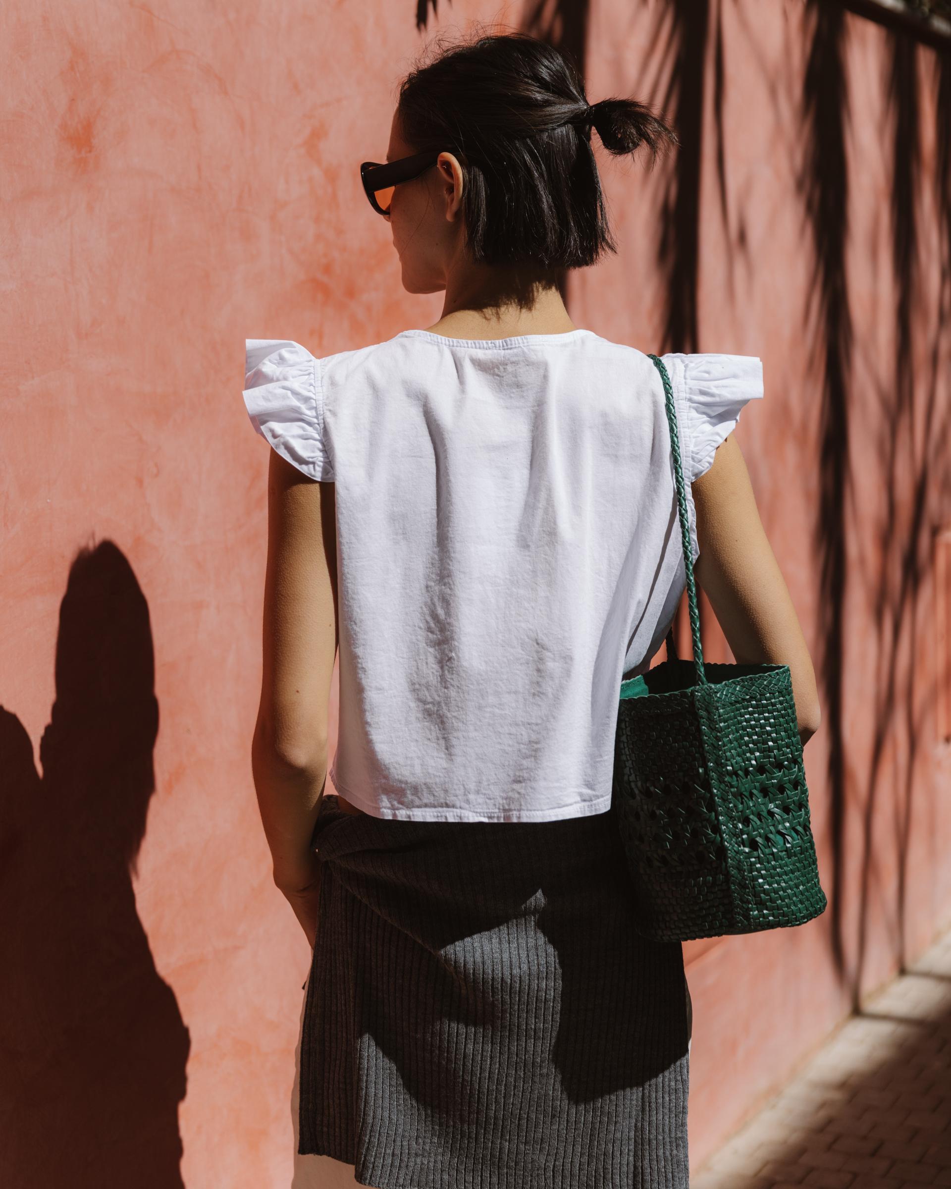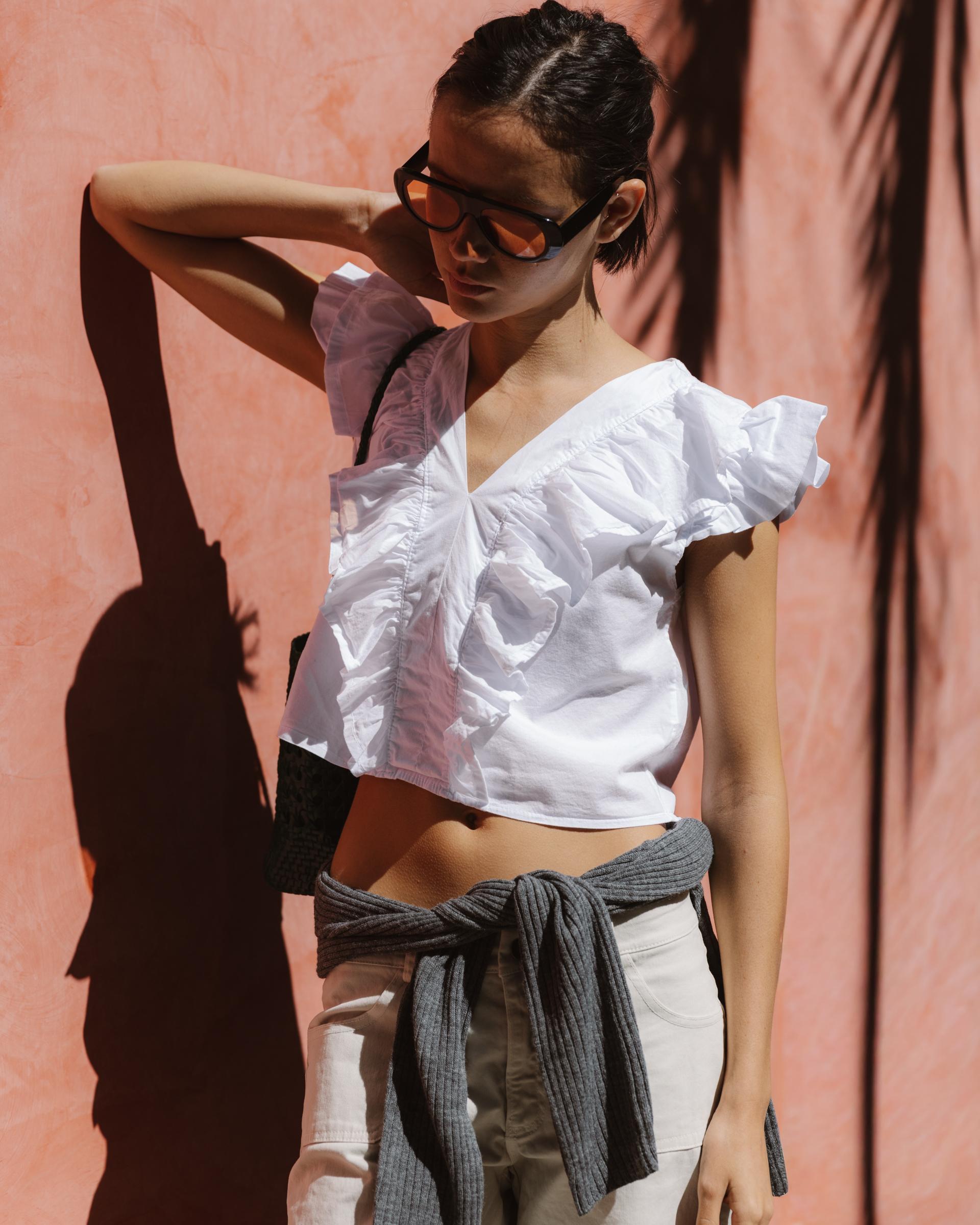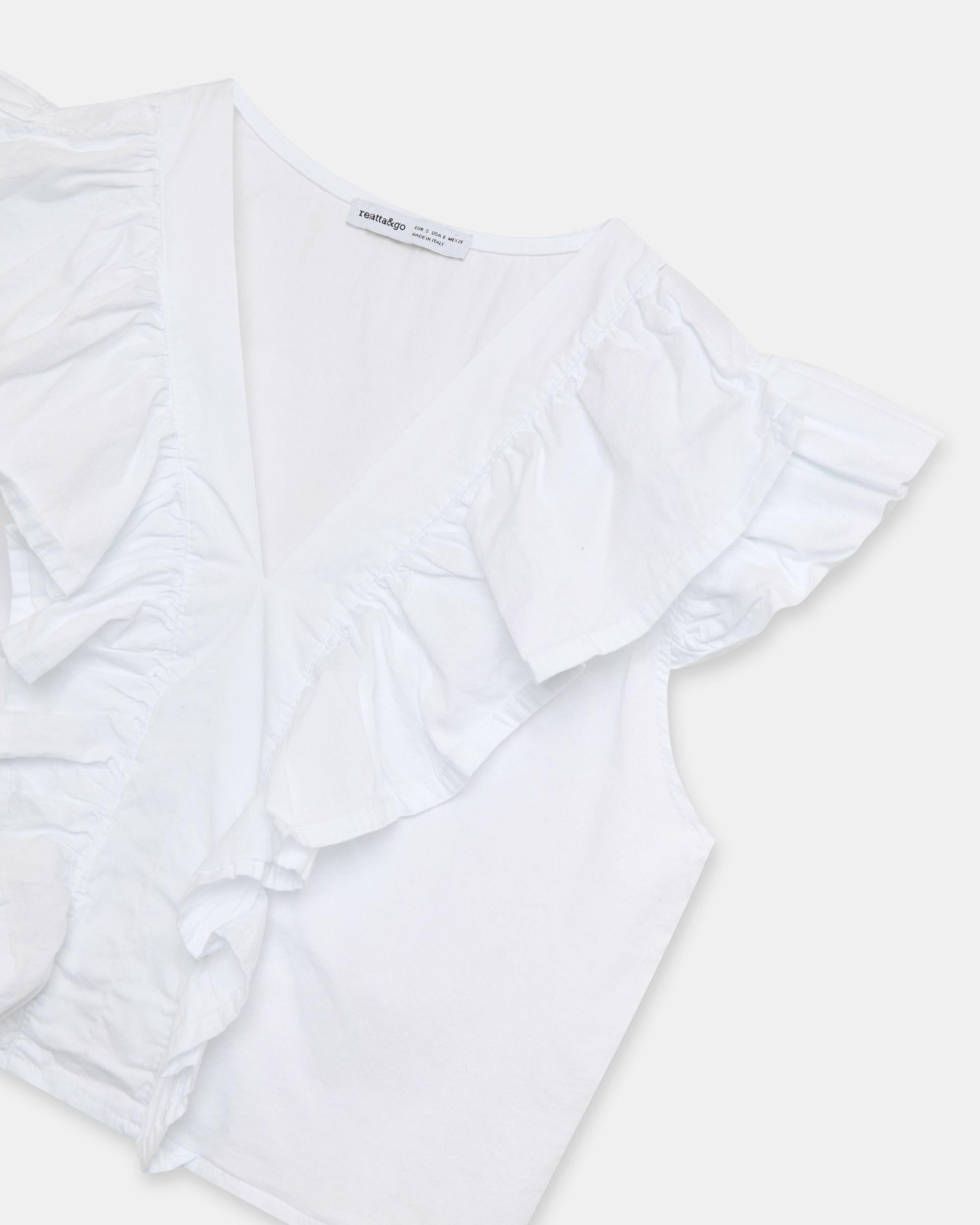 Top de color blanco con escote en pico y detalle de volantes en delantero y mangas.
