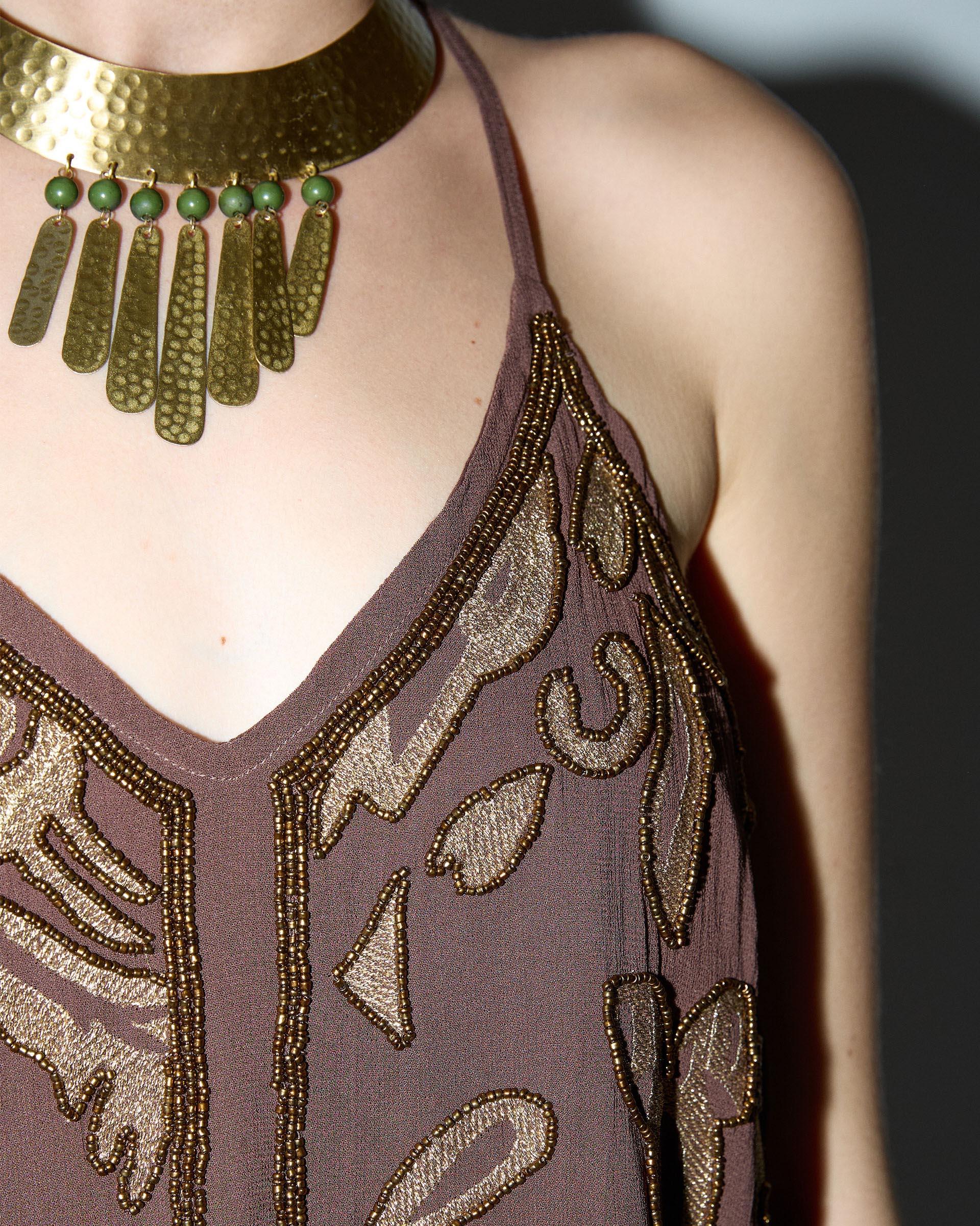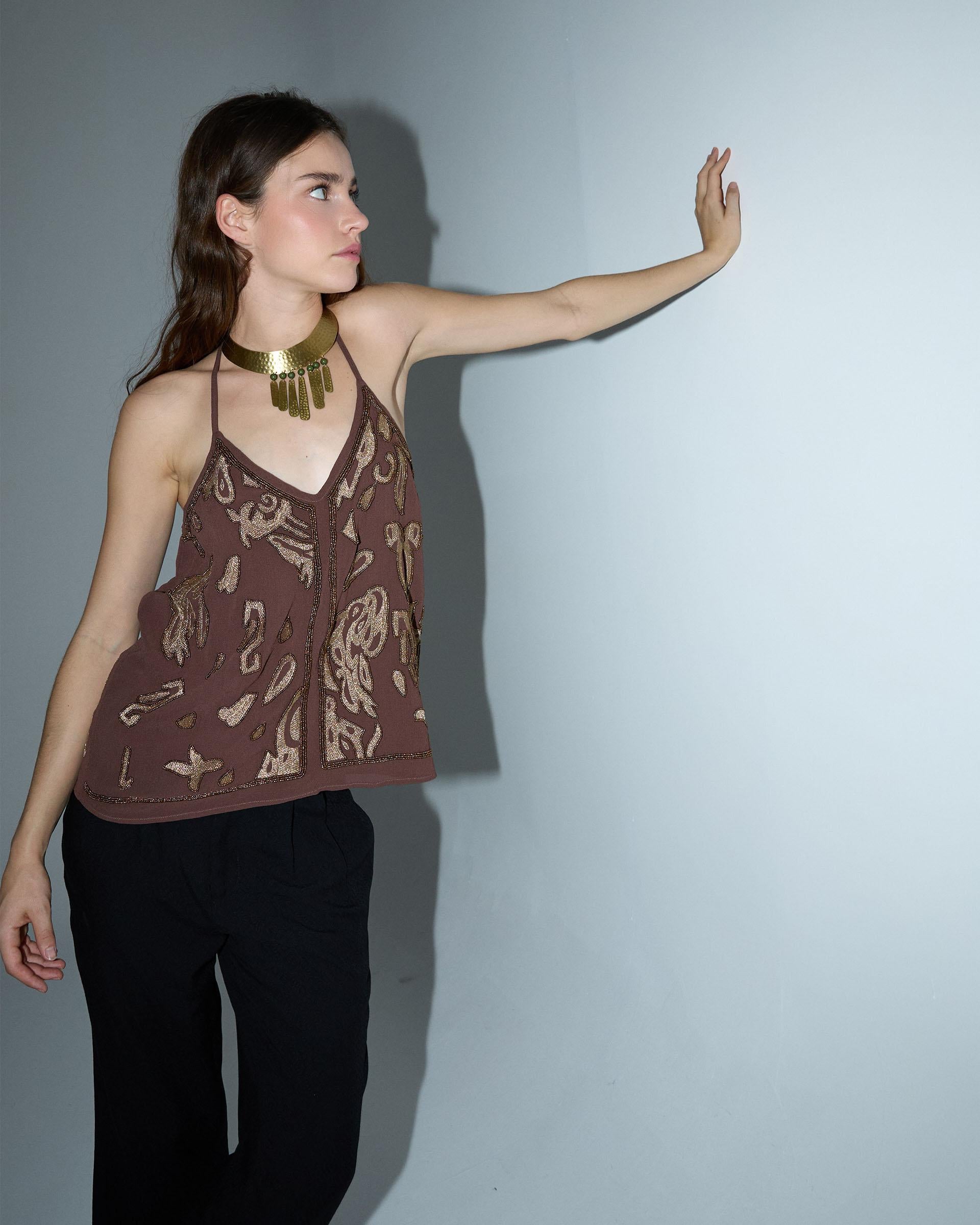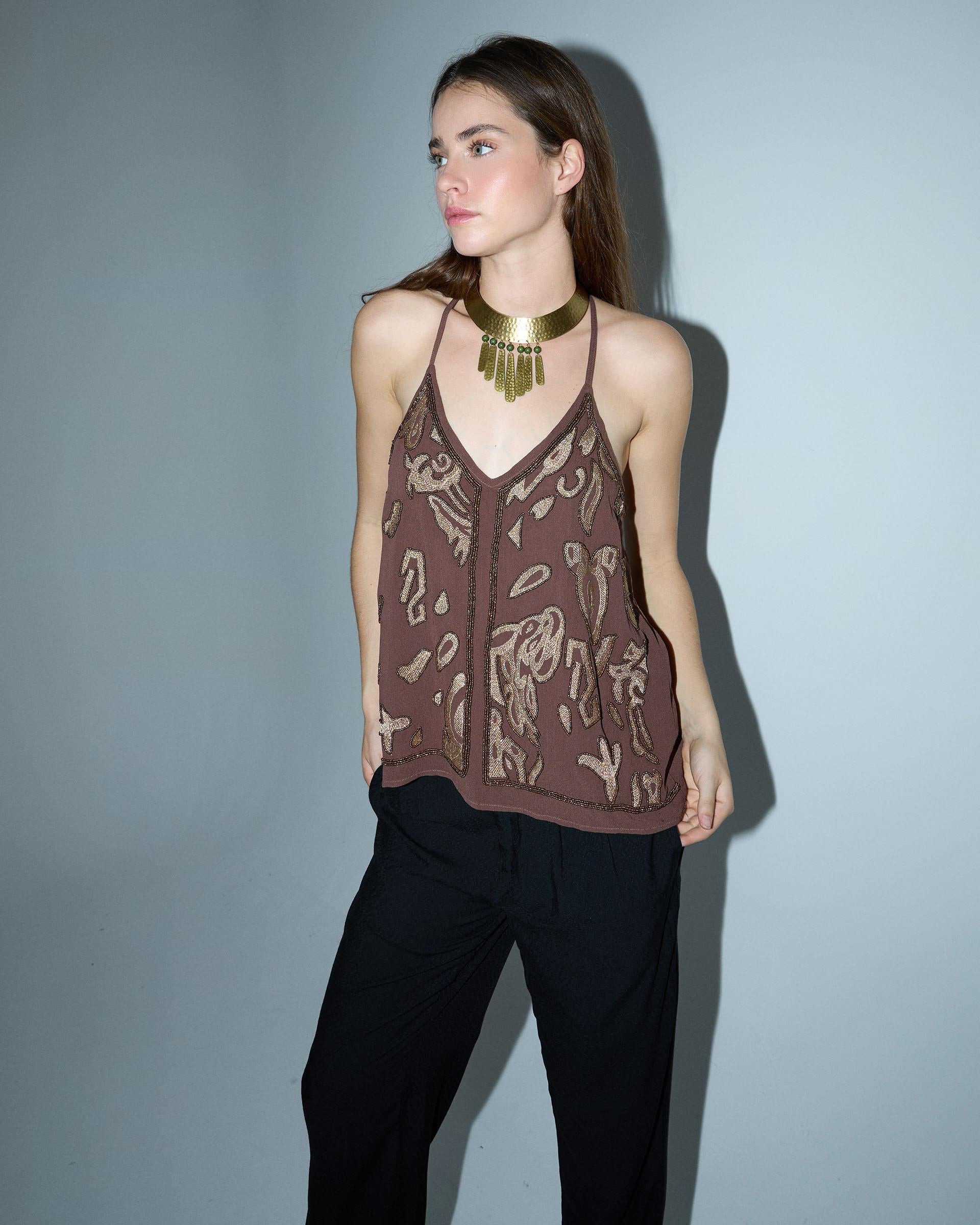 Top halter de color marrón con bordados y abalorios en dorado y escote en espalda.