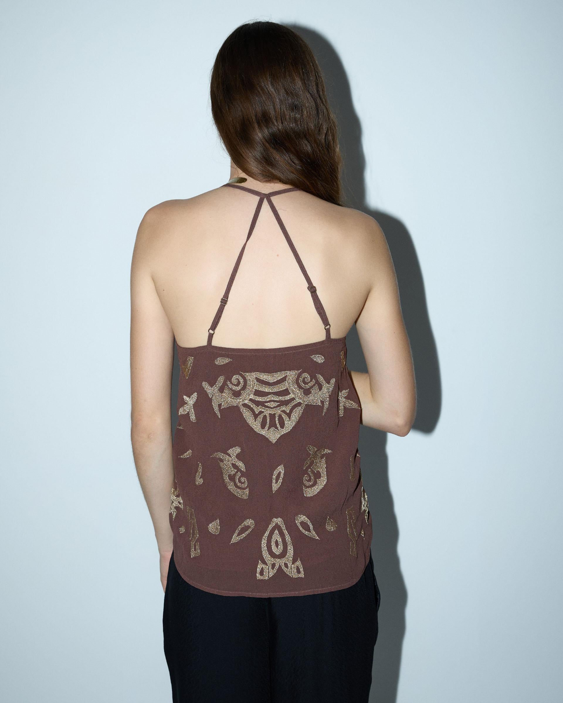 Top Espalda Cruzada Bordados Abalorios Marrón