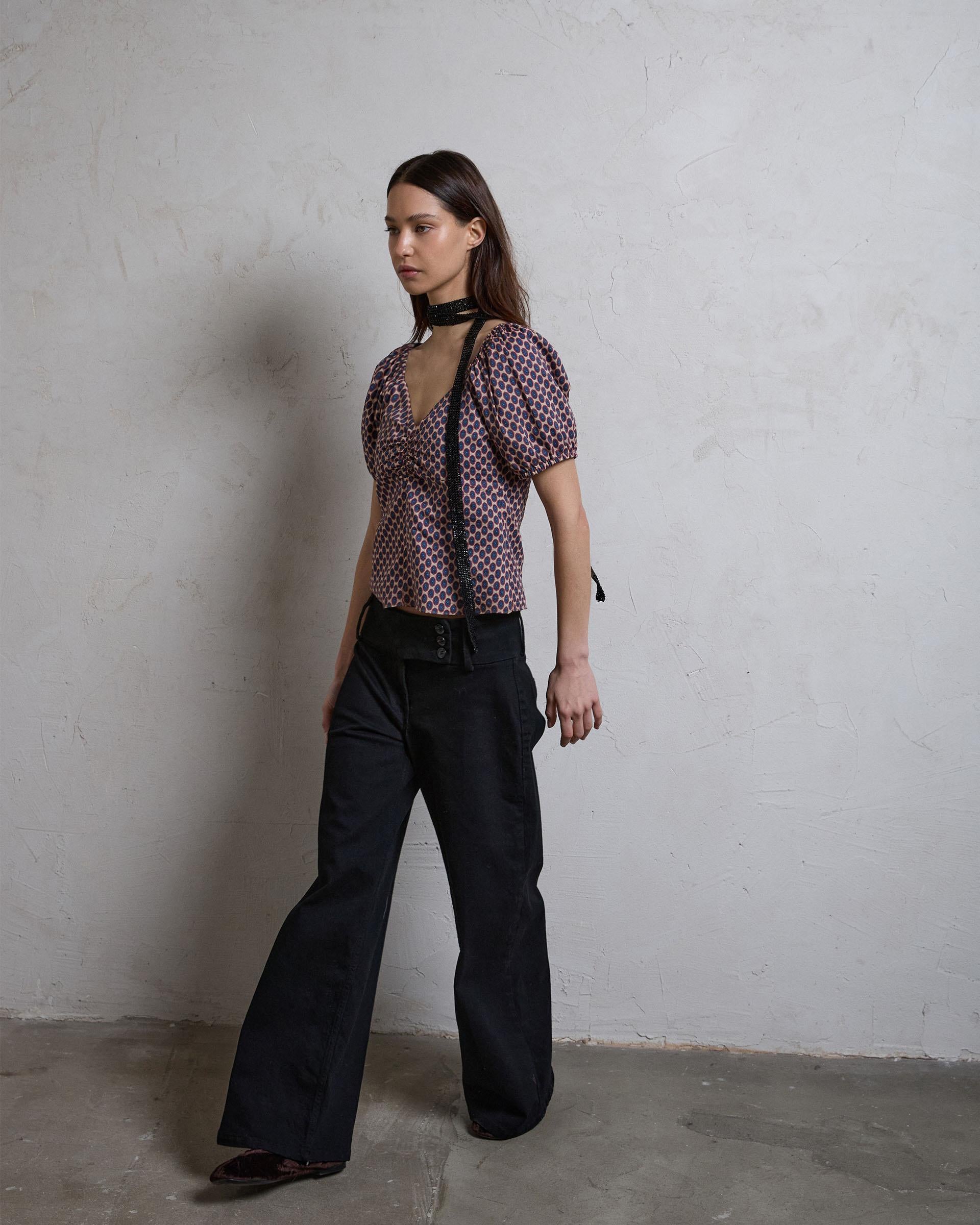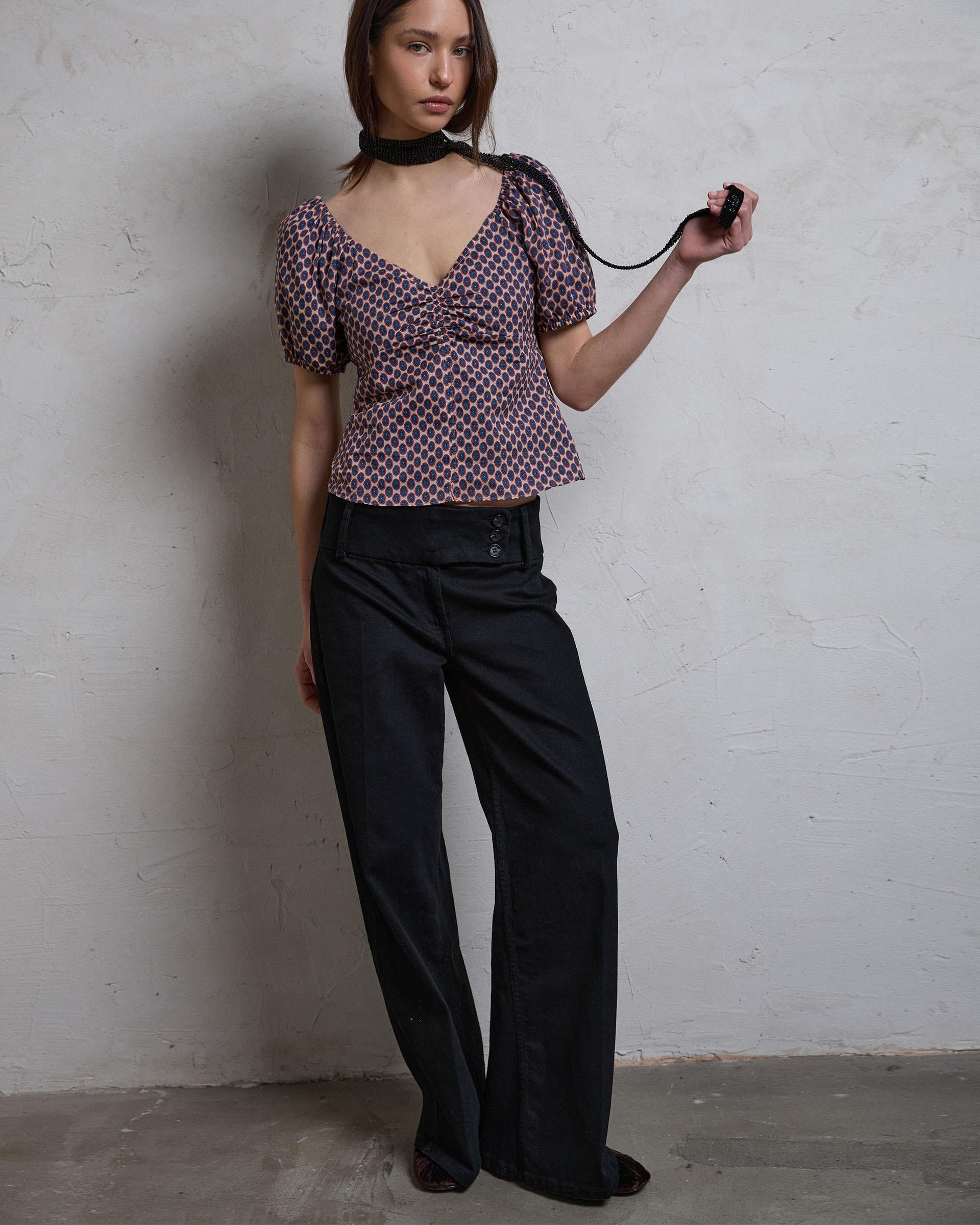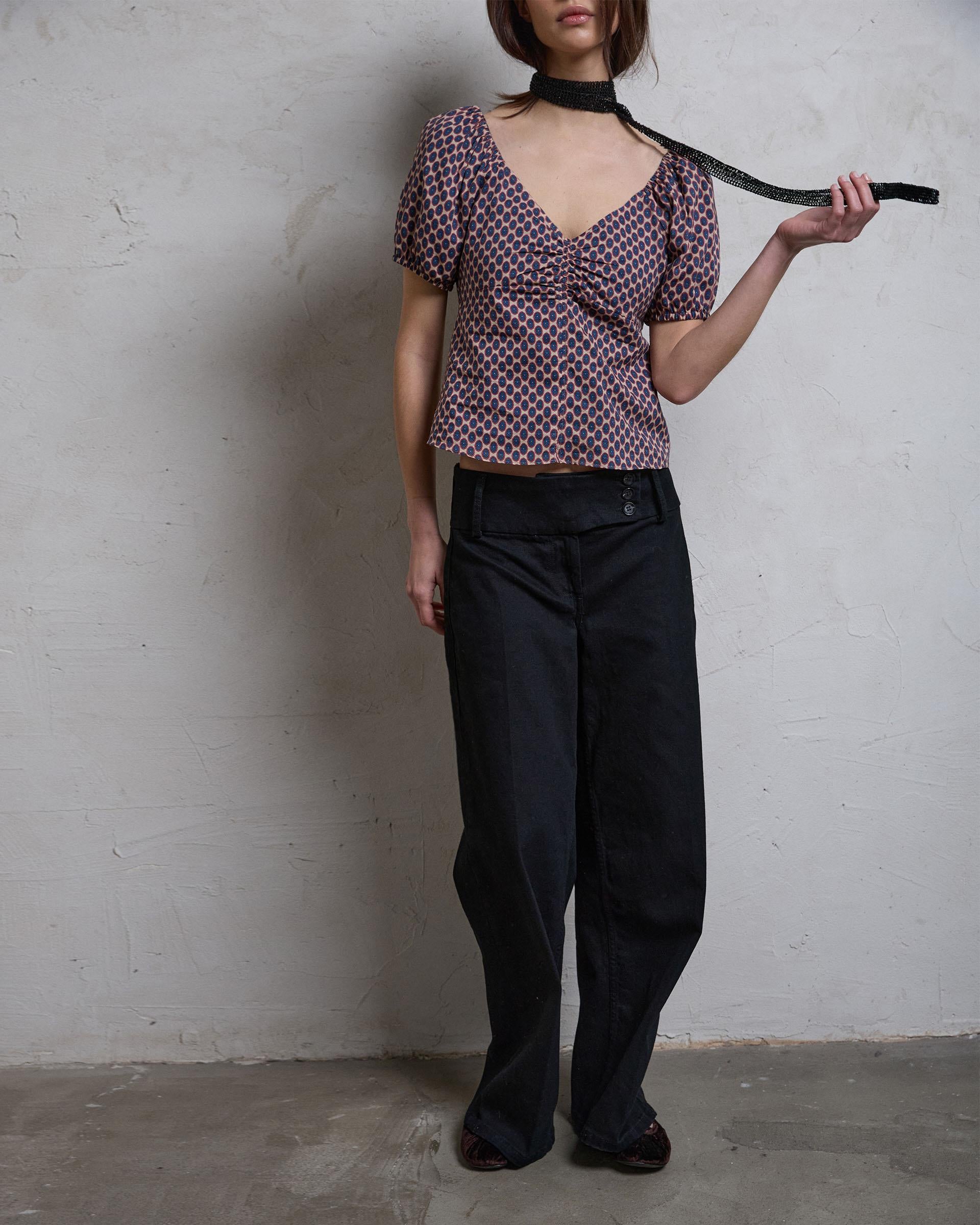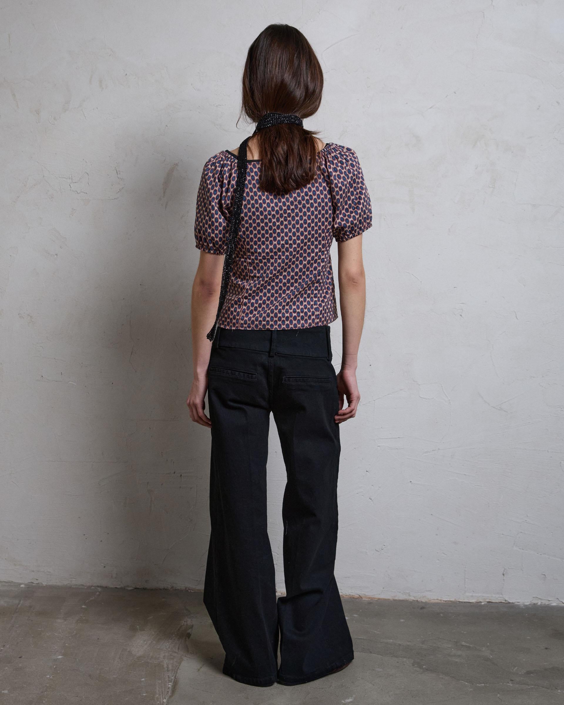Top de manga corta abullonada con detalle de fruncido en escote, con estampado de amebas de colores.