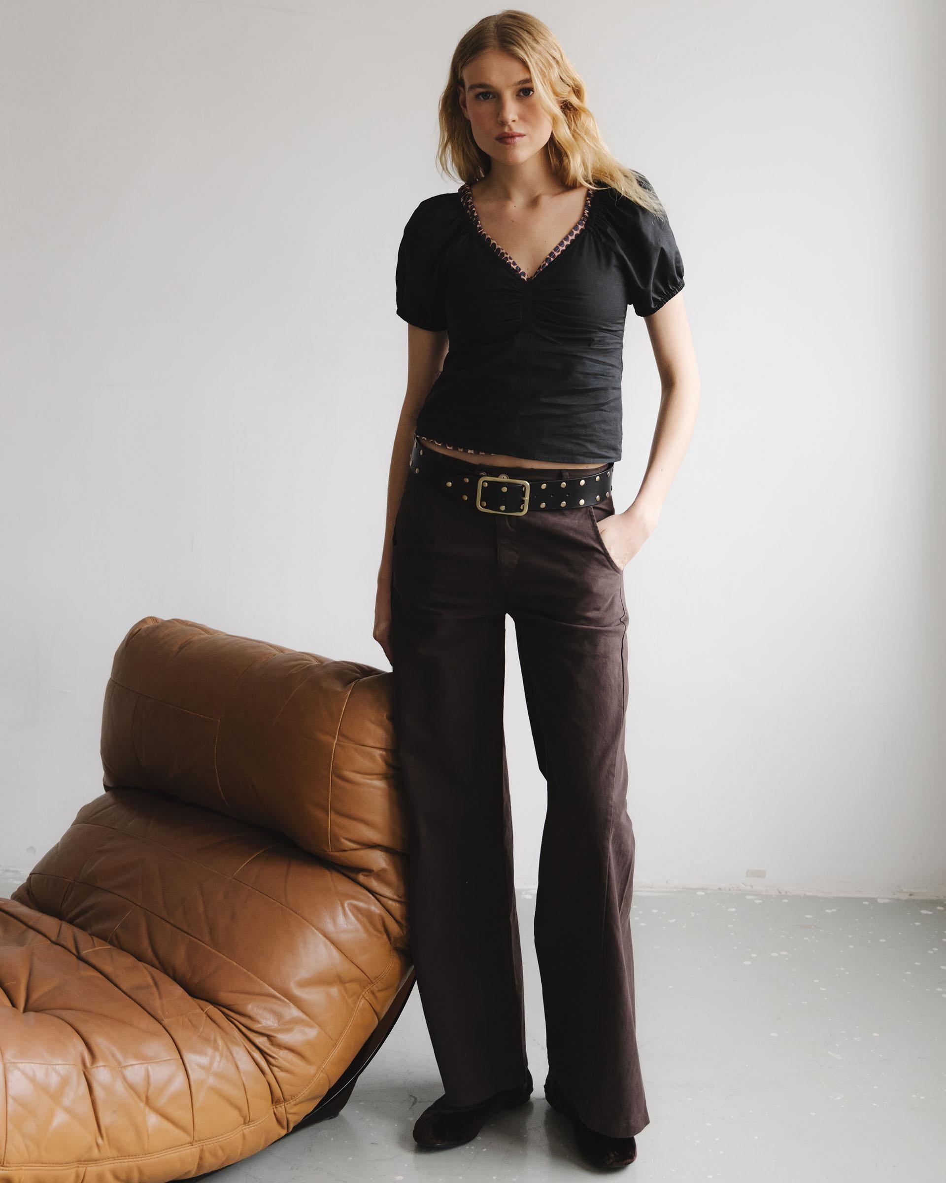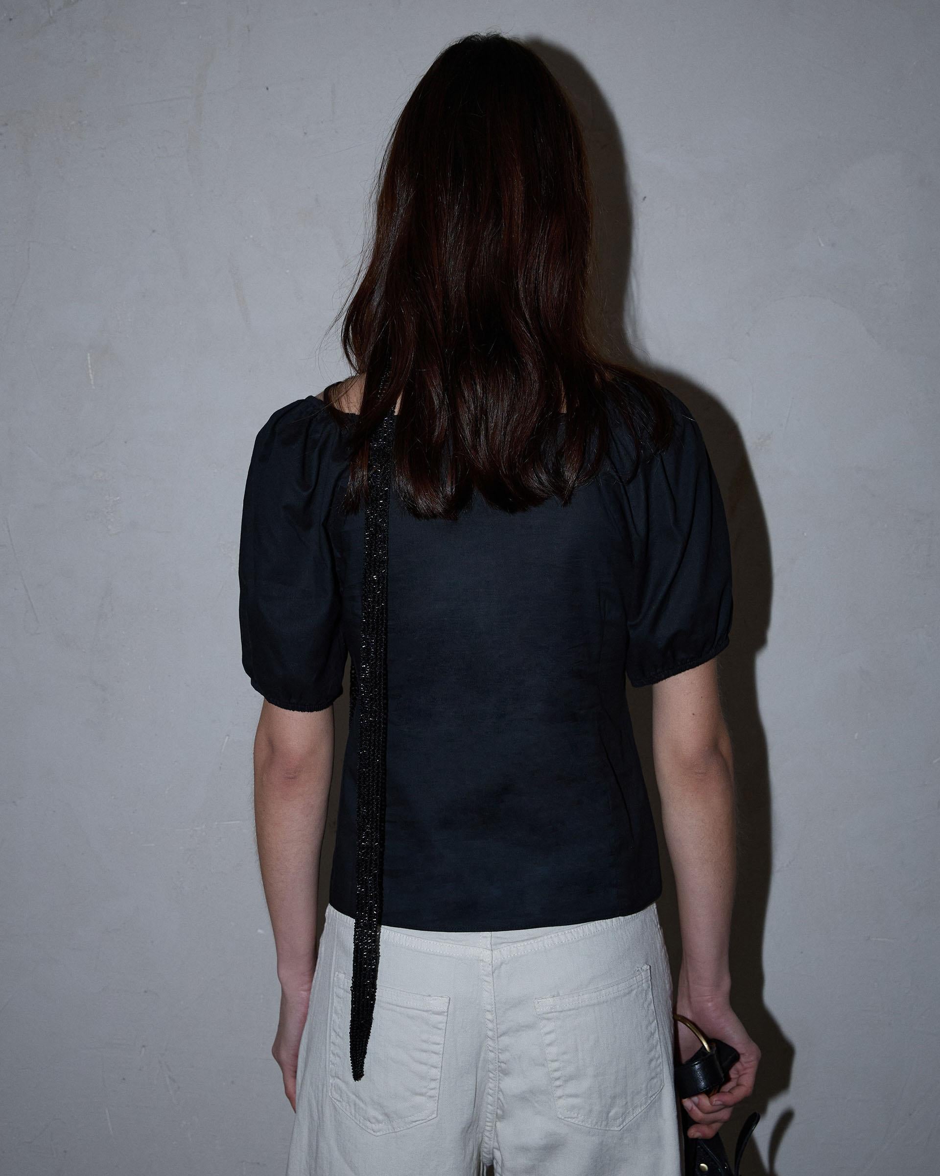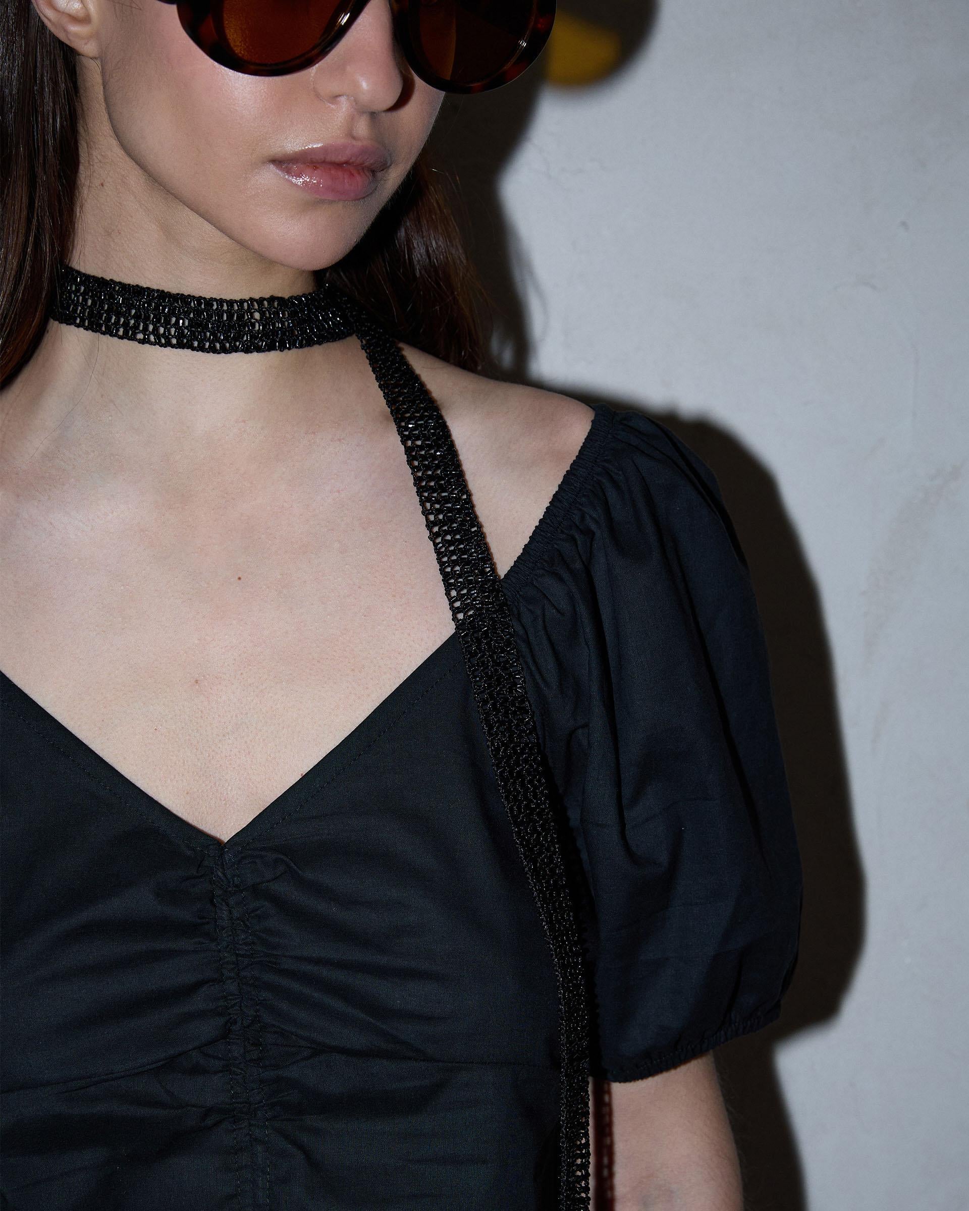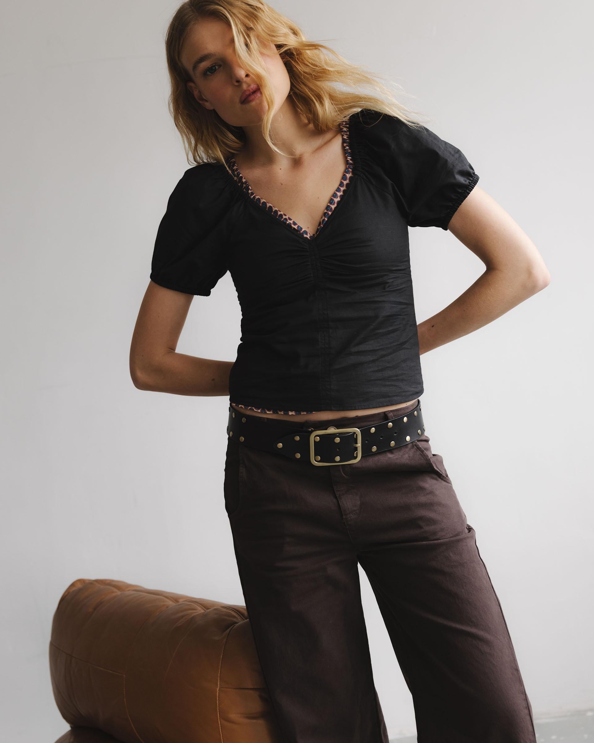 Top de manga corta abullonada con detalle de fruncido en escote, de color negro.