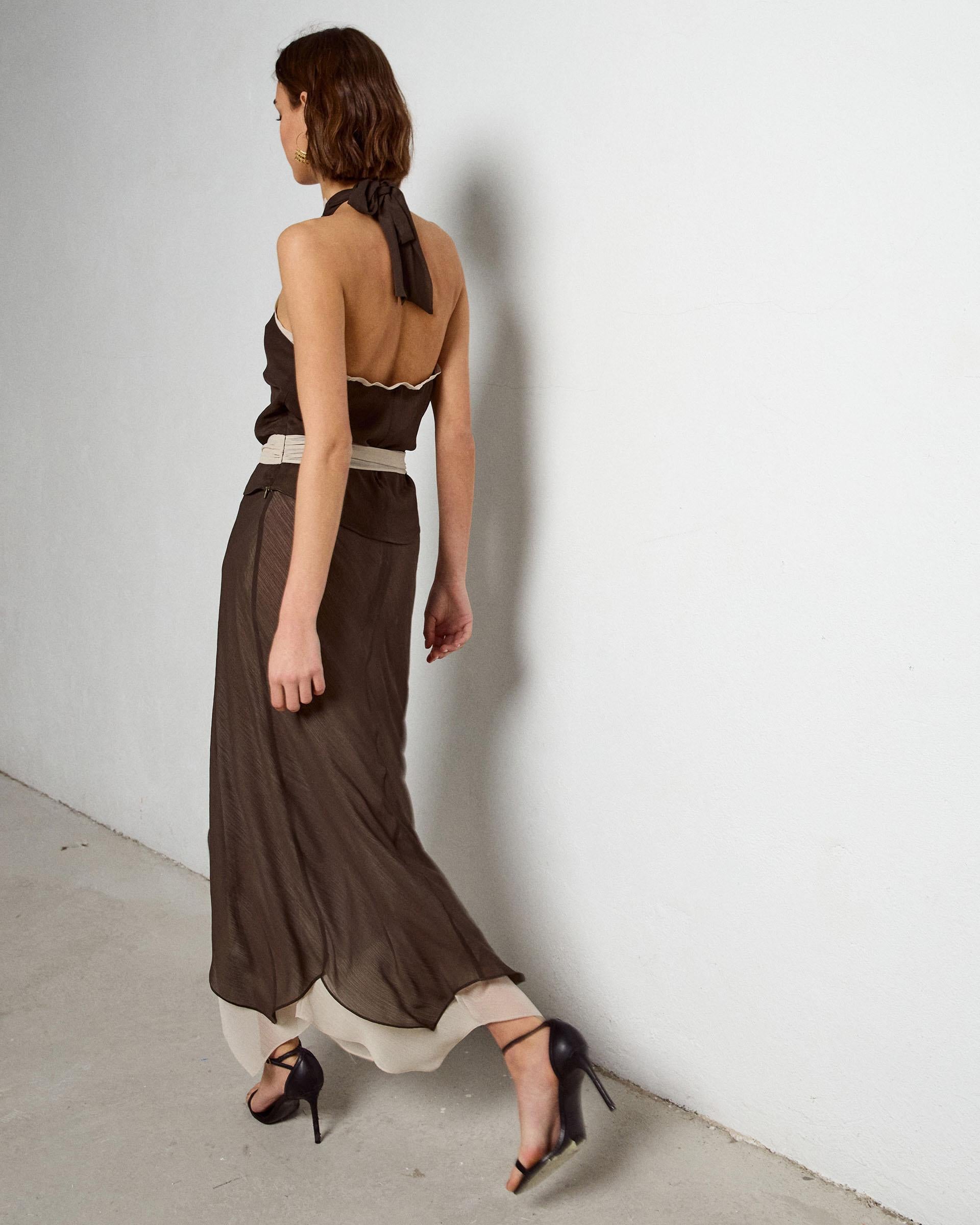 Top halter con tejido de gasa en color verde oscuro y contraste con color crudo, detalle de fajín y lazada en trasero.