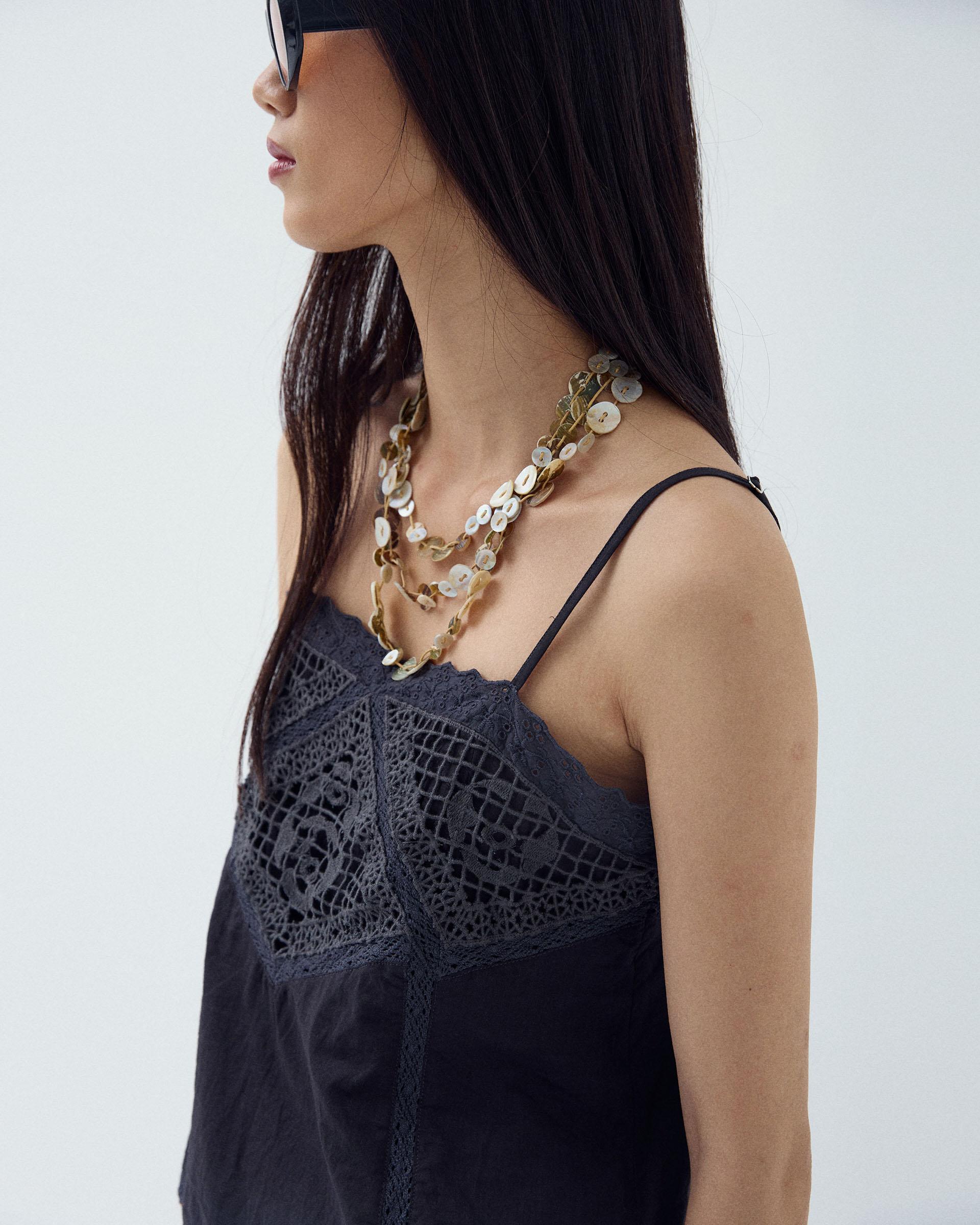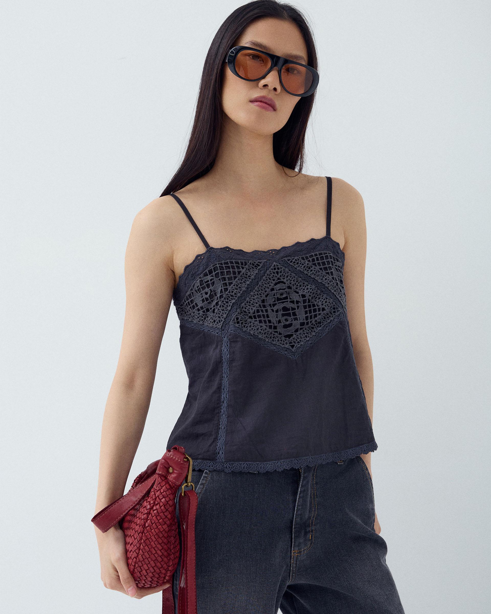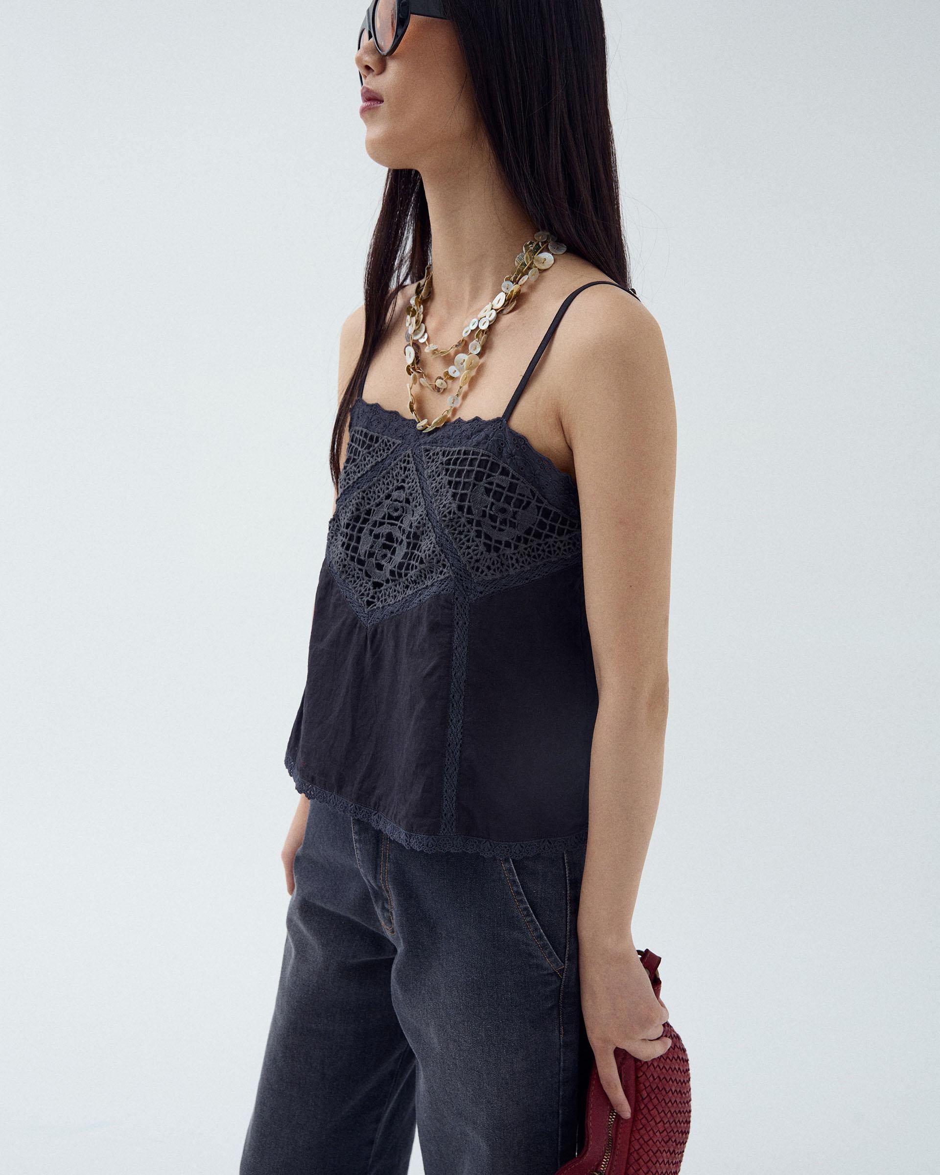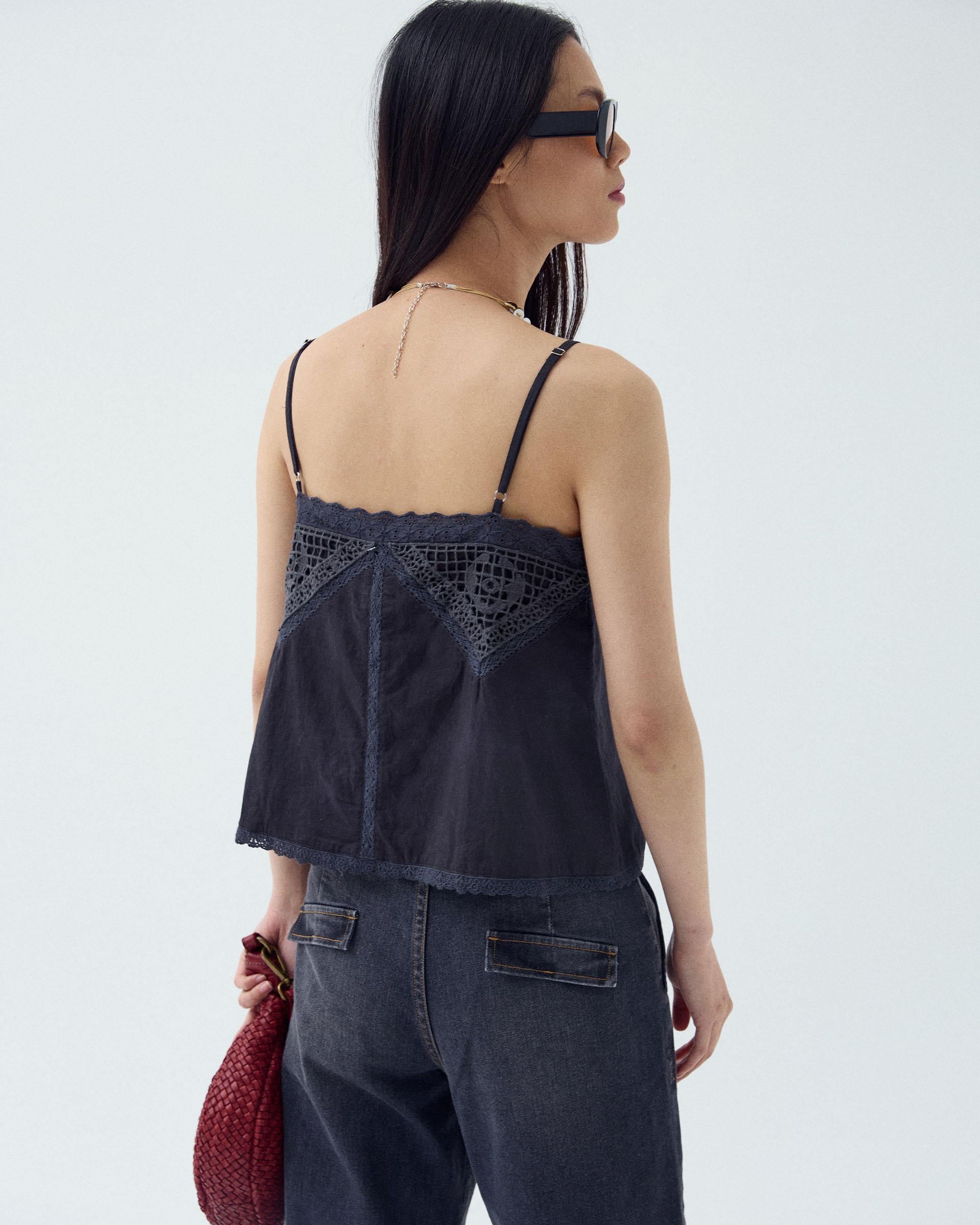 Top de color antracita estilo lencero, con tirantes finos y detalle de encaje a tono.