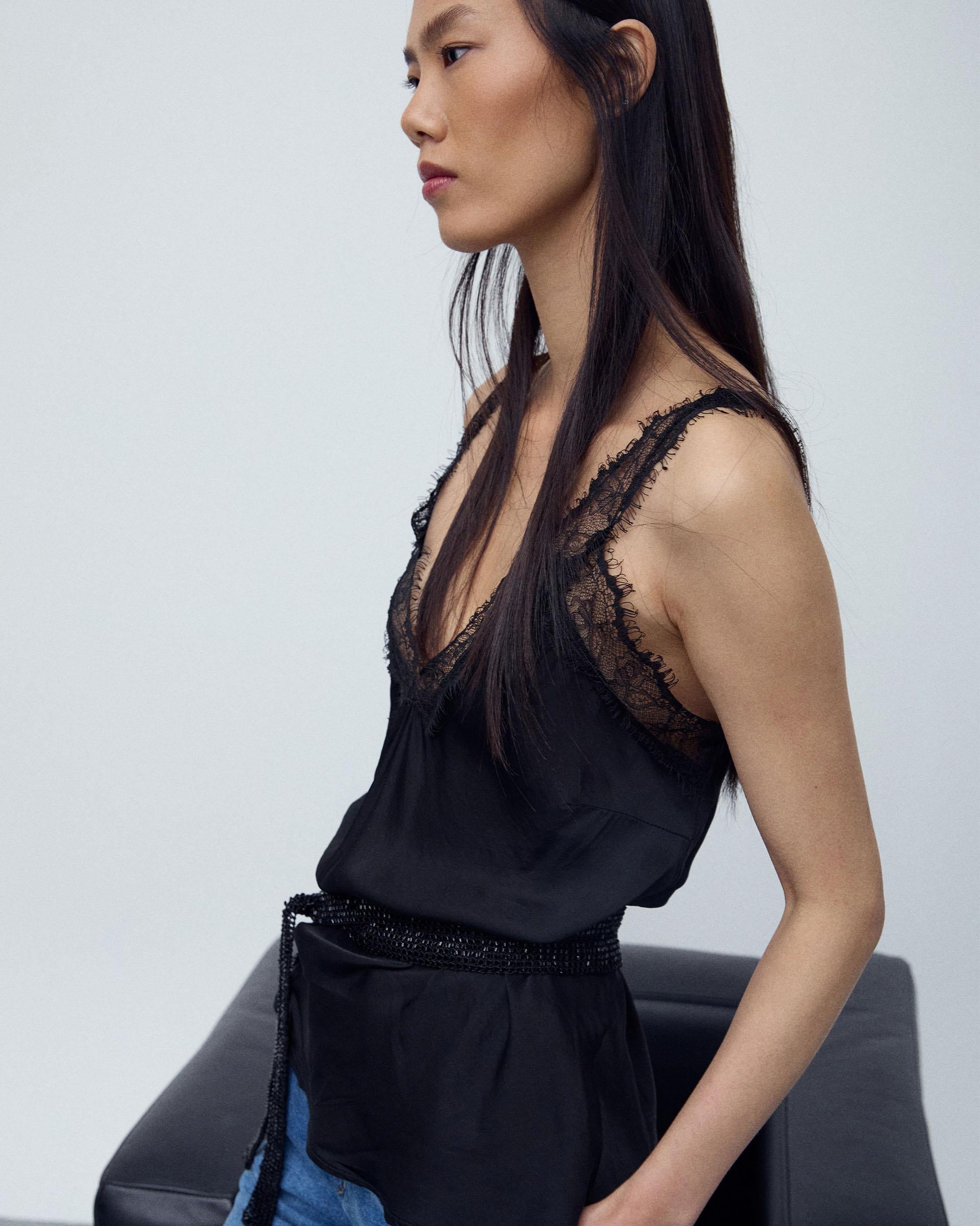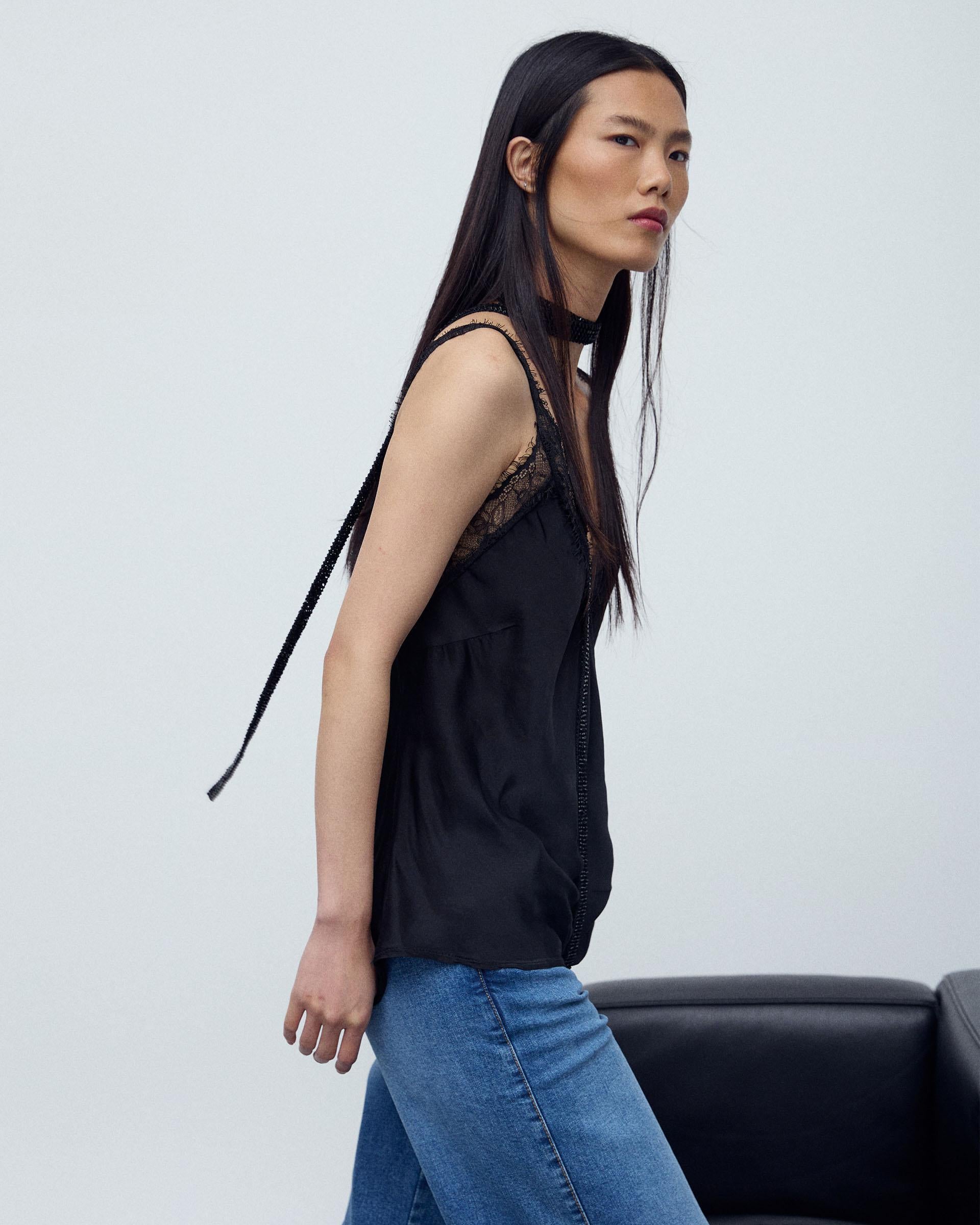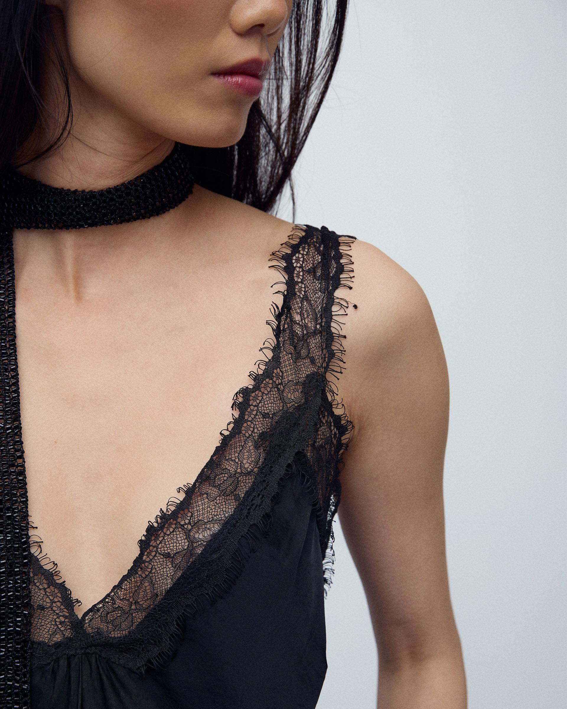 Top de tirantes tipo lencero en color negro con detalle de encaje a tono.