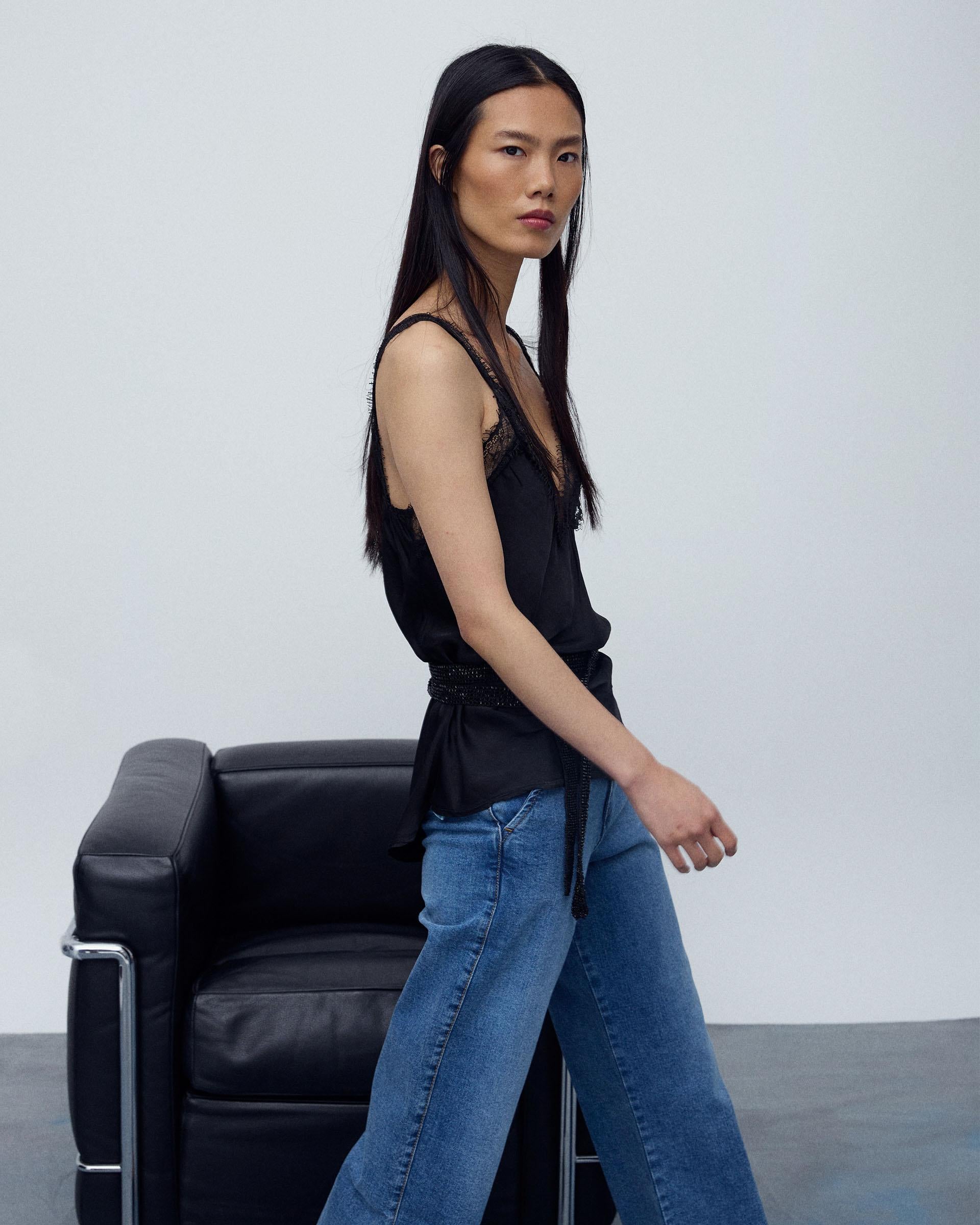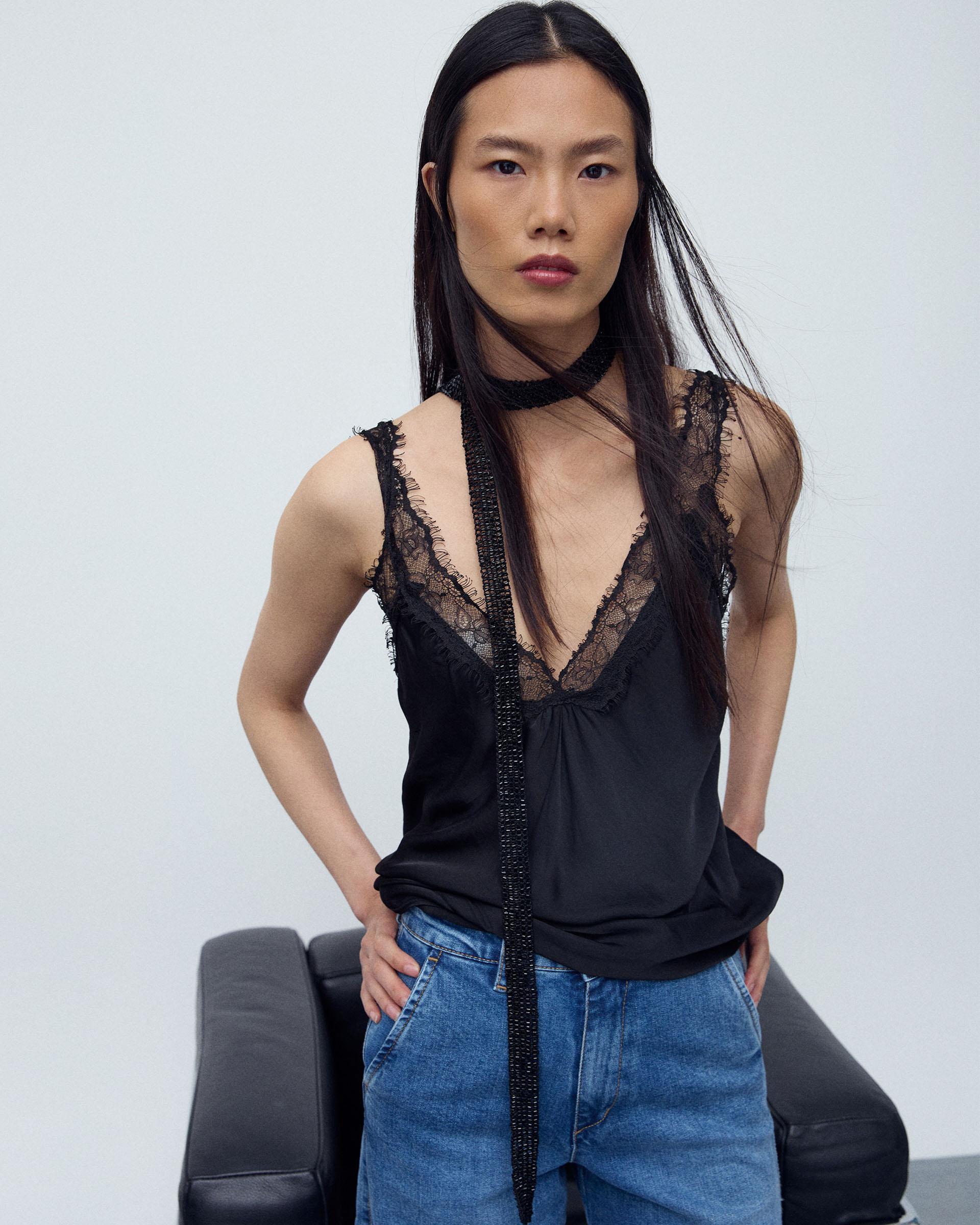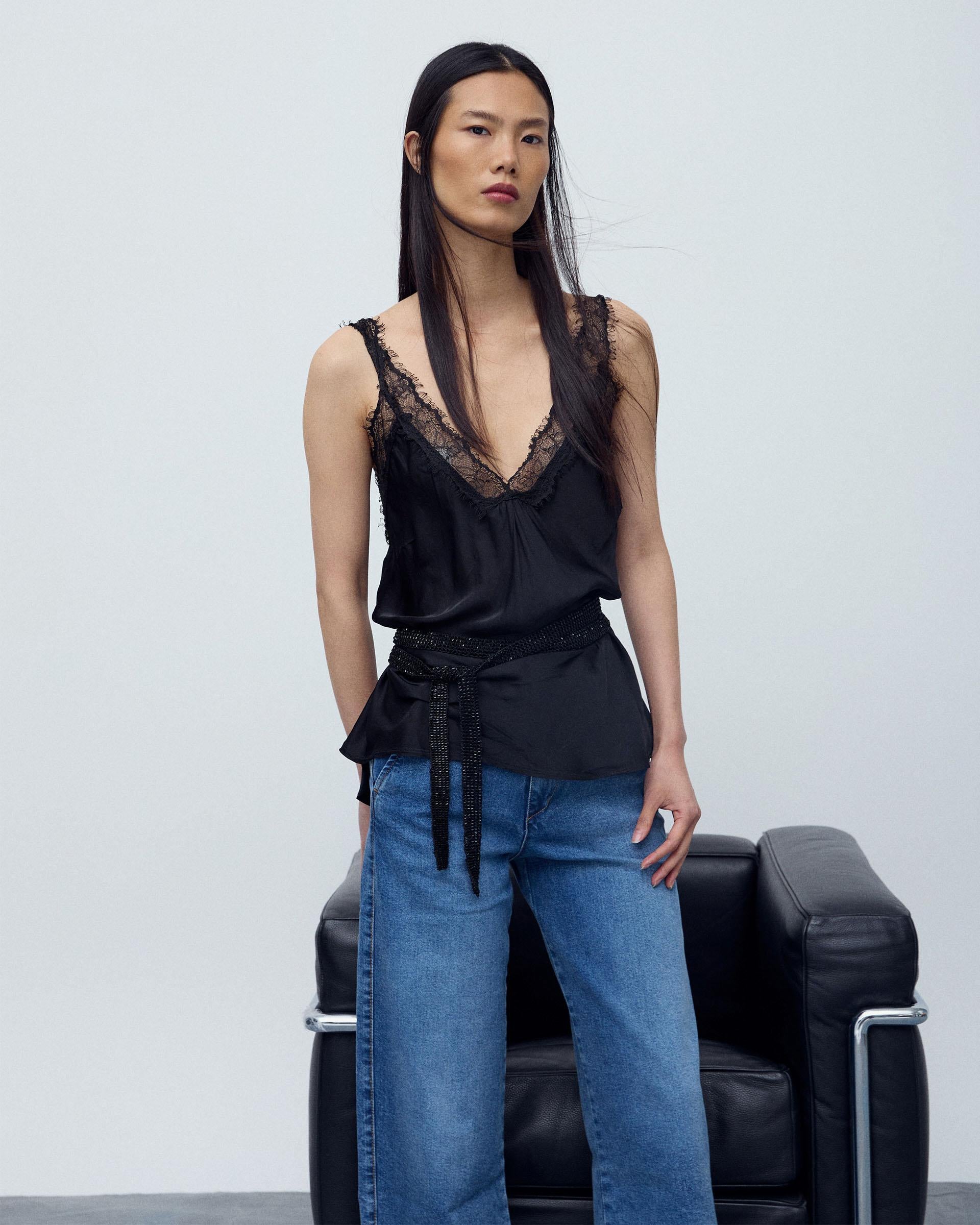 Top de tirantes tipo lencero en color negro con detalle de encaje a tono.