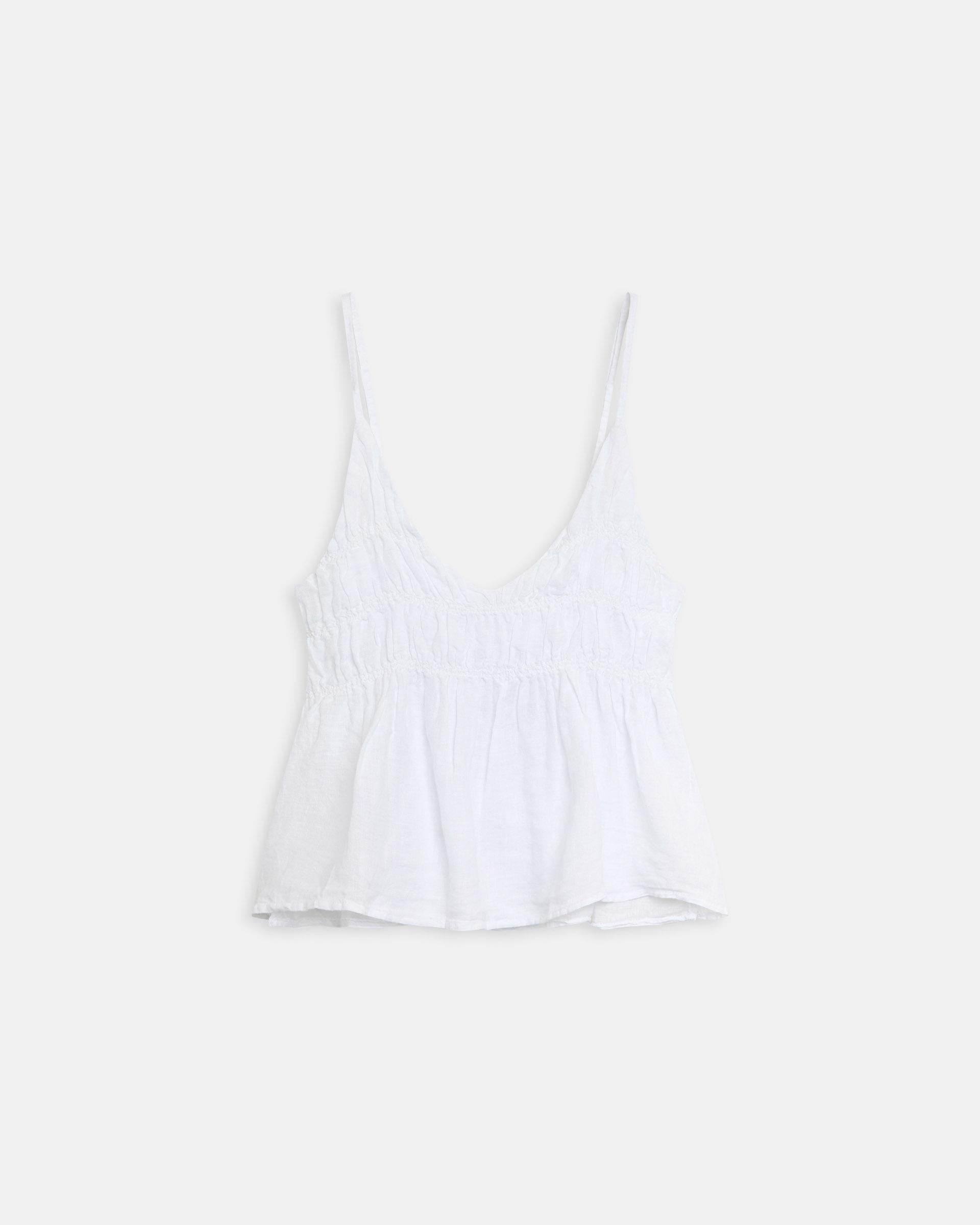 Top de tirante fino en color blanco con detalle de gomas y escote en pico.