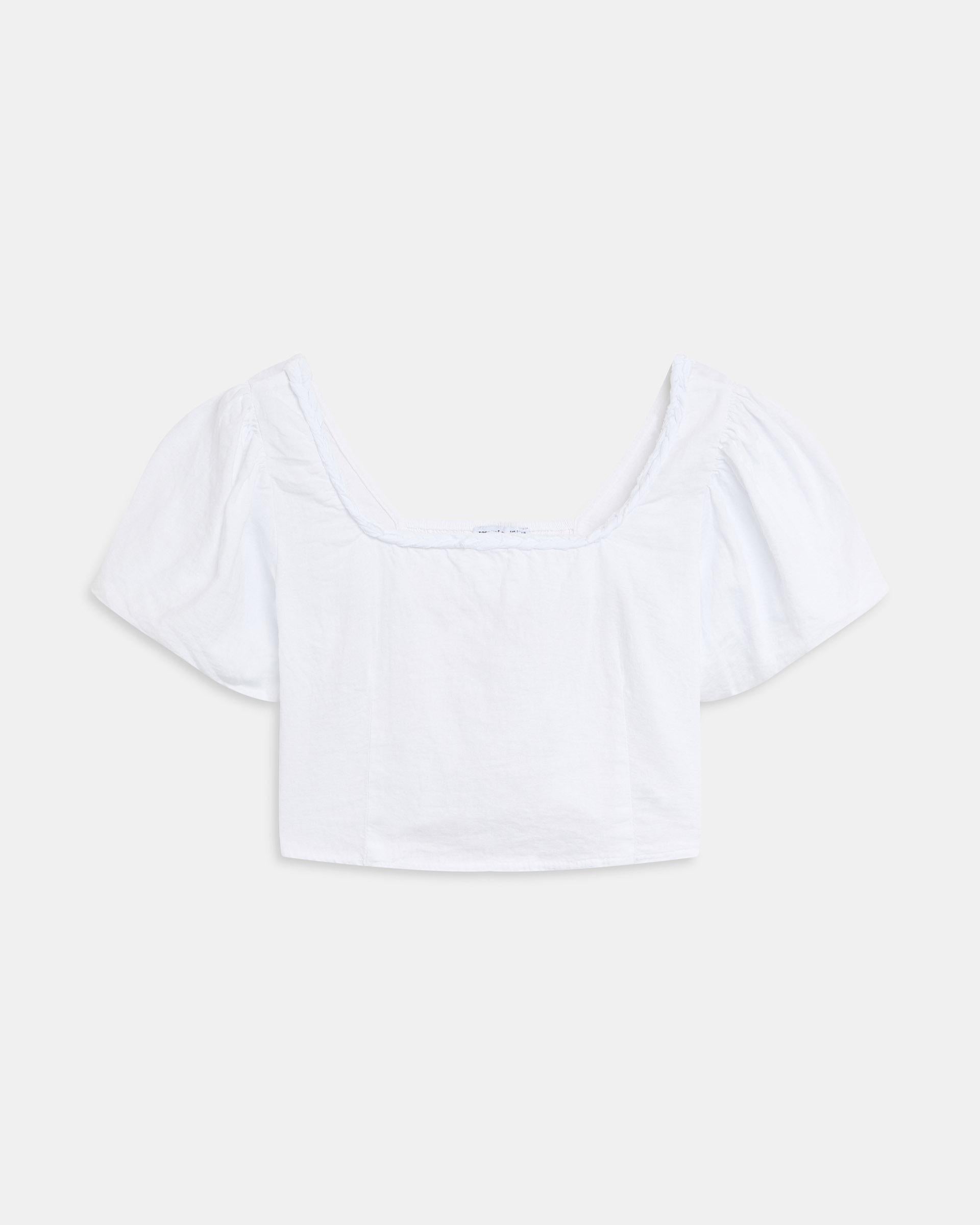Top tipo cropped con manga corta abullonada y detalle de escote en espalda con lazada, de color blanco.