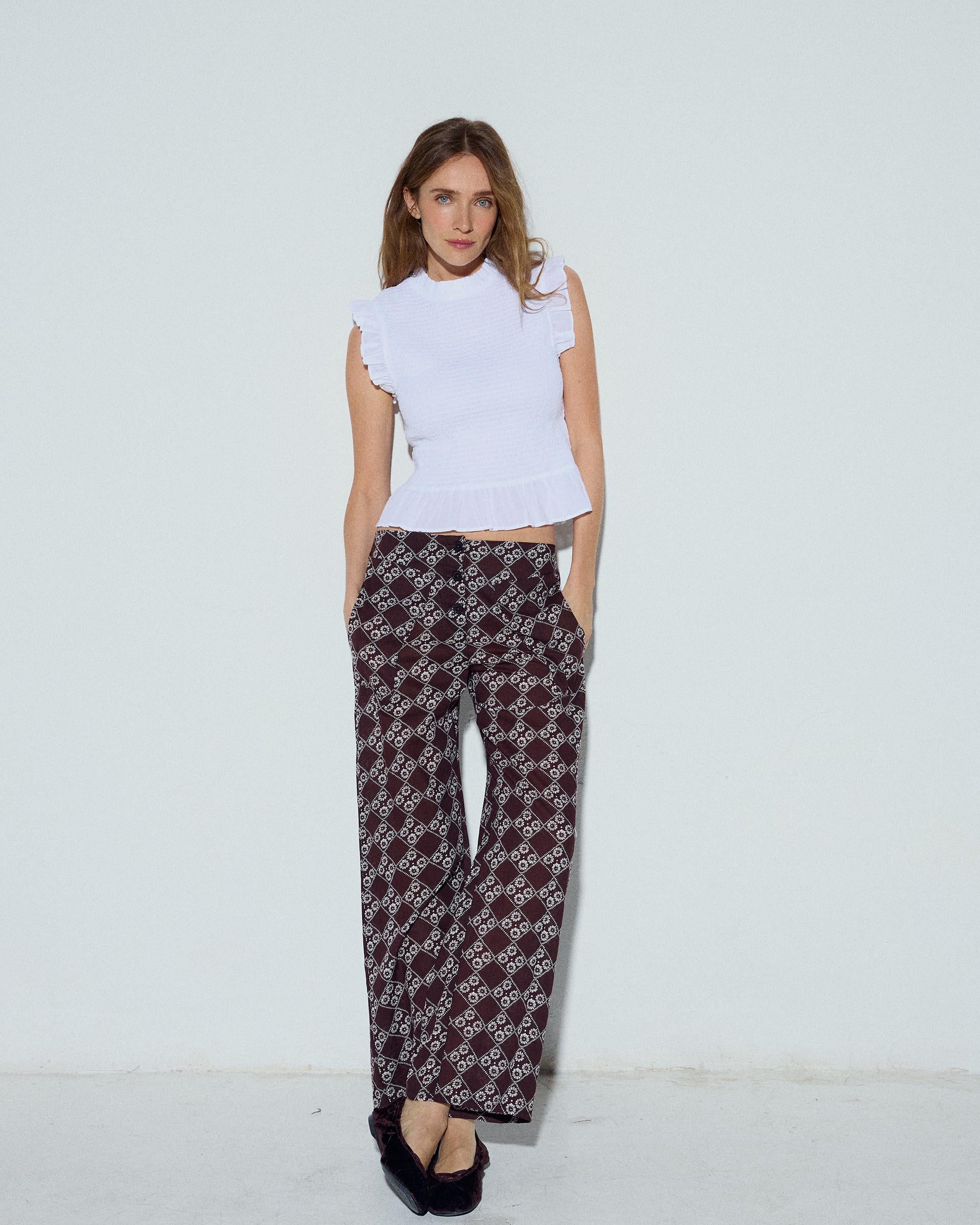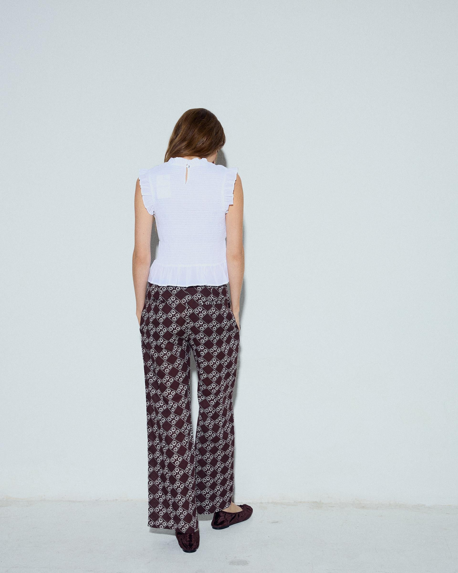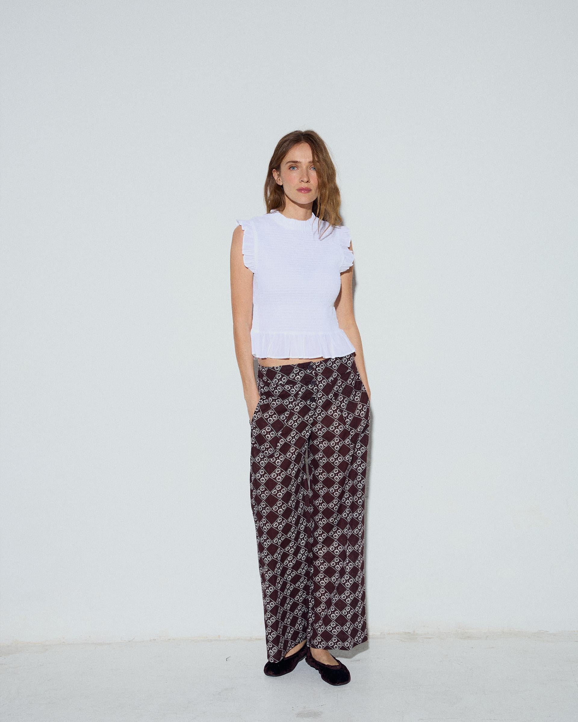 Top de color blanco con nido de abeja y manga corta con volante.