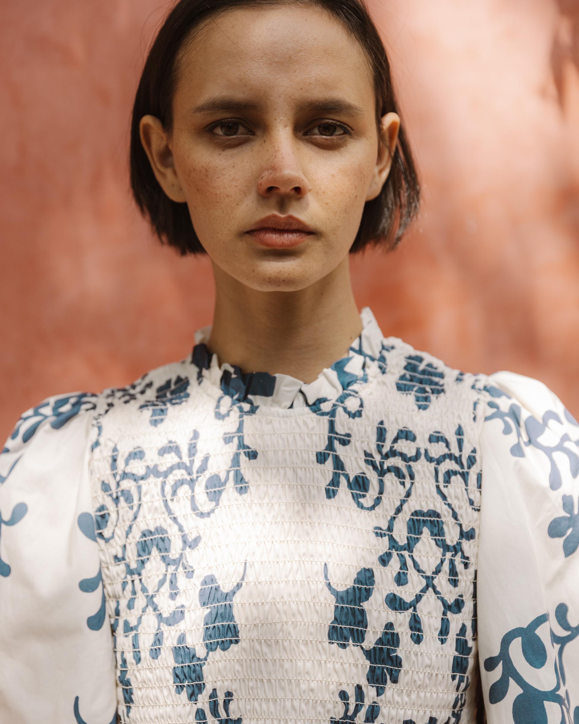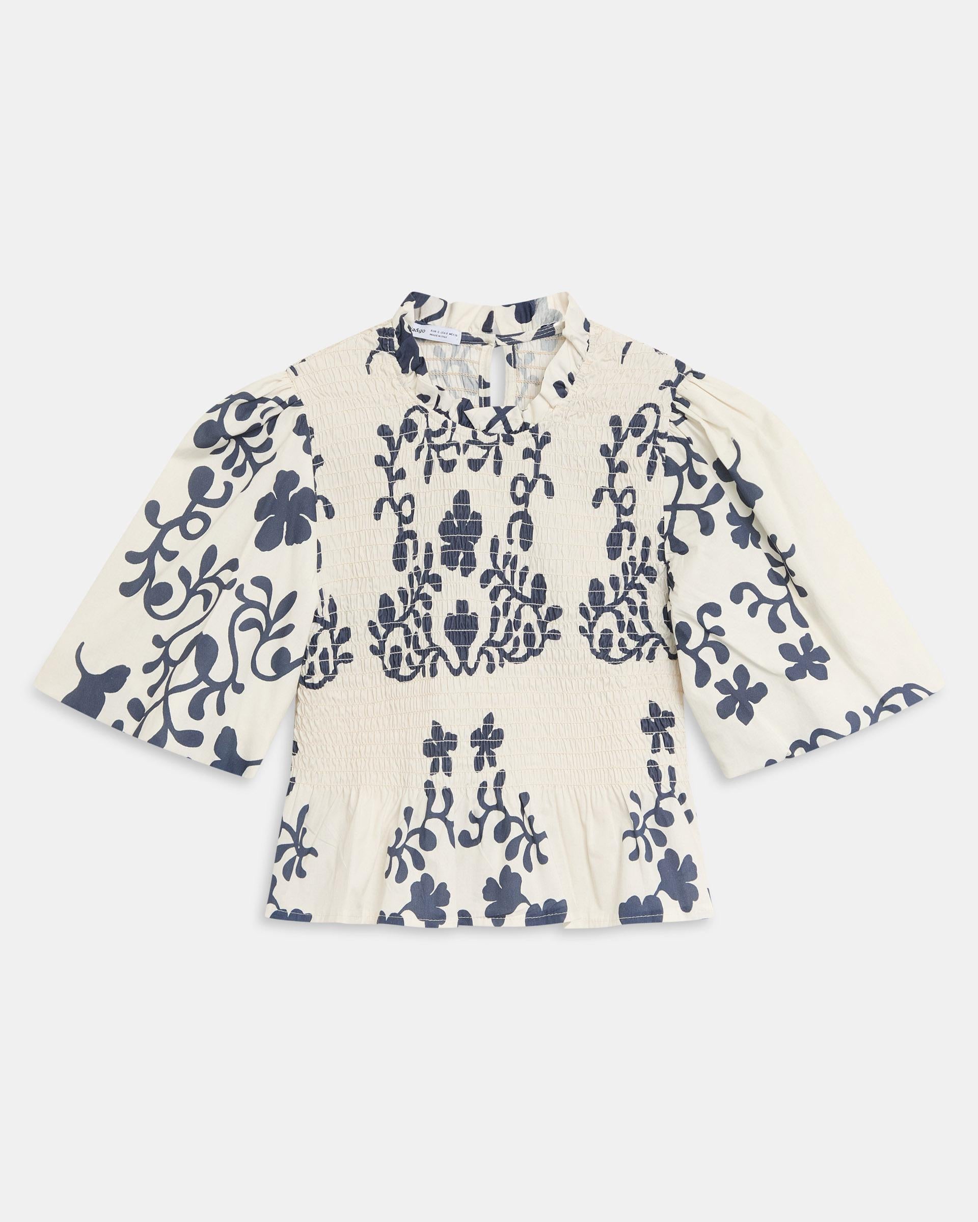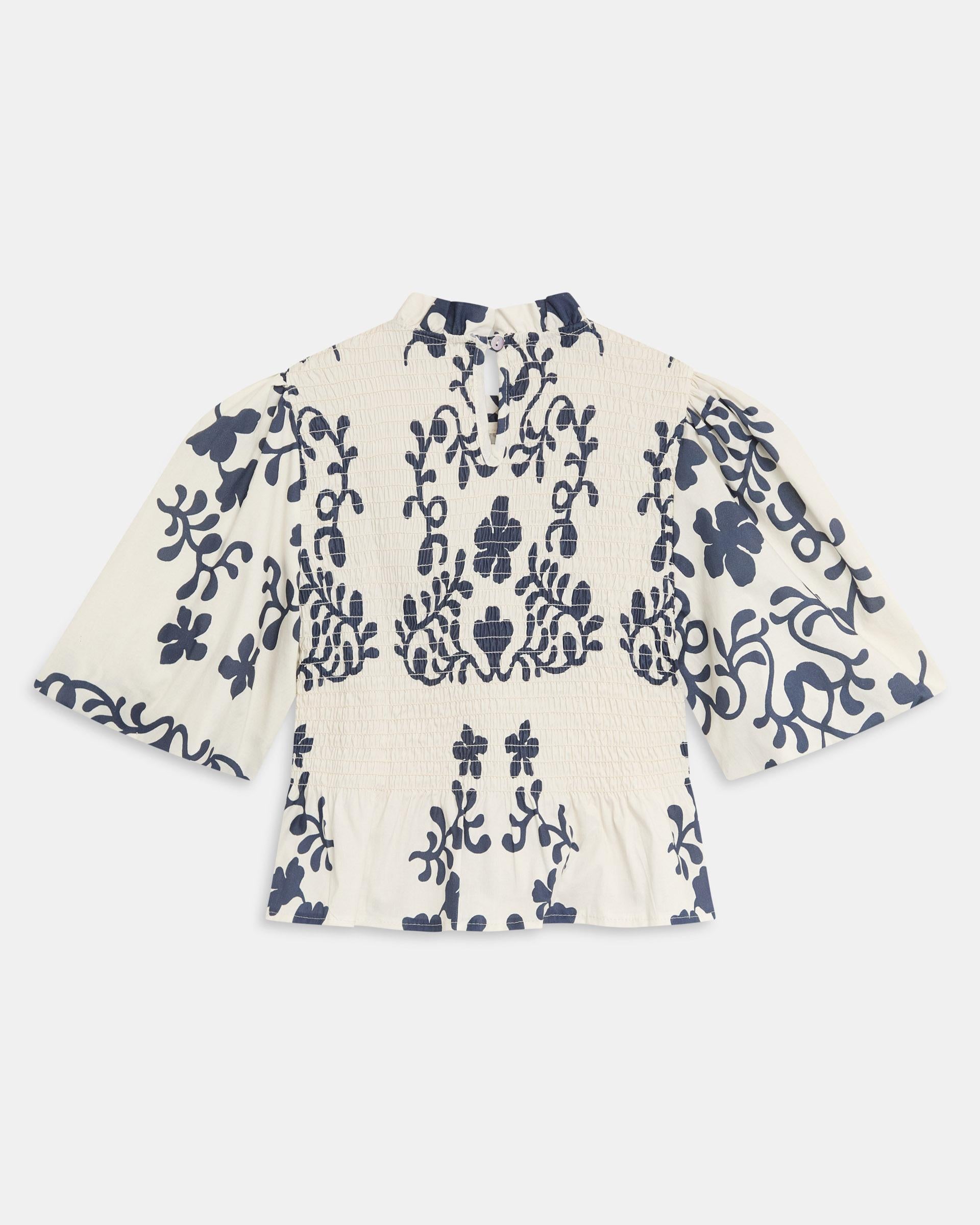 Top de color blanco con estampado floral, detalle de nido de abeja y manga corta abullonada.