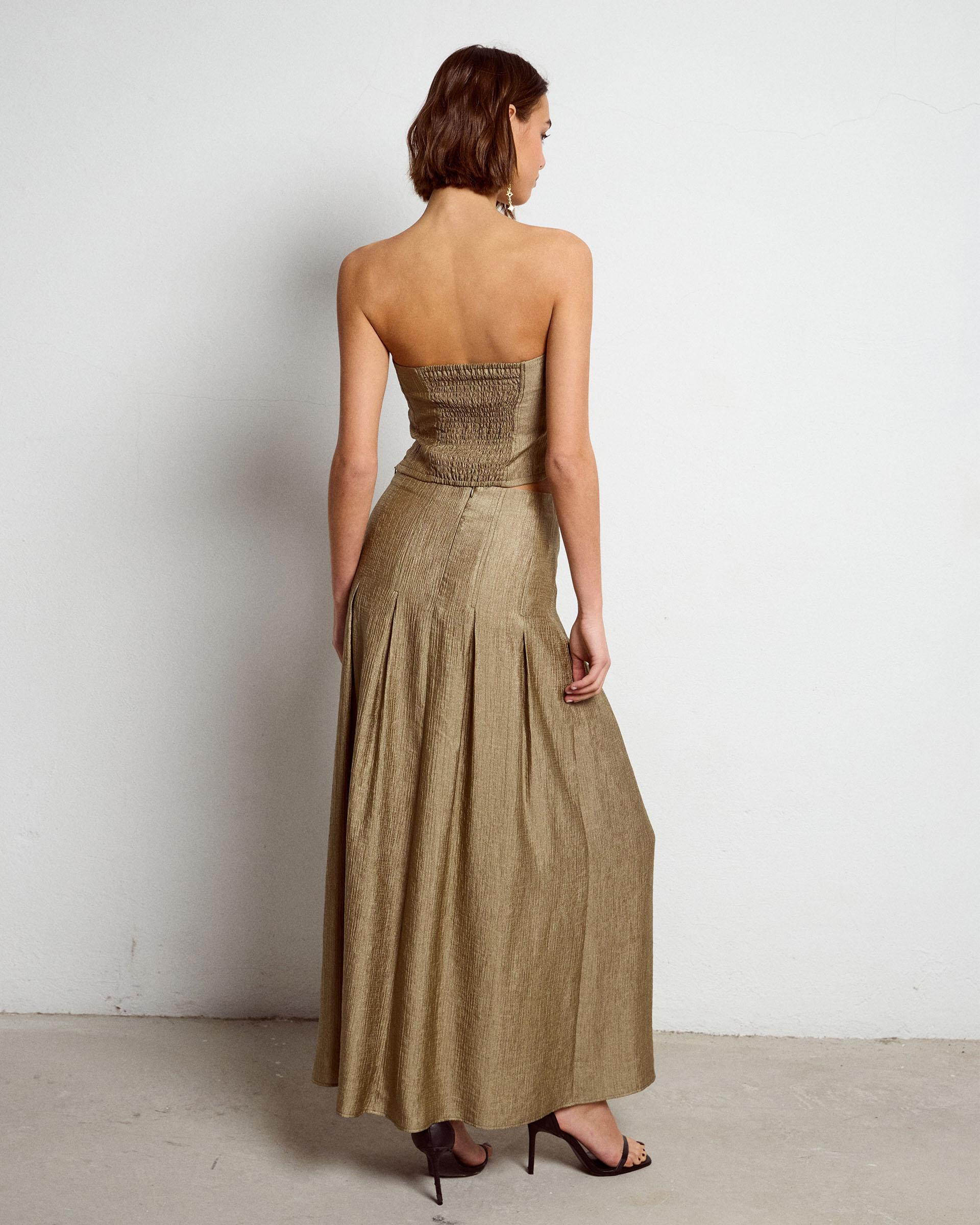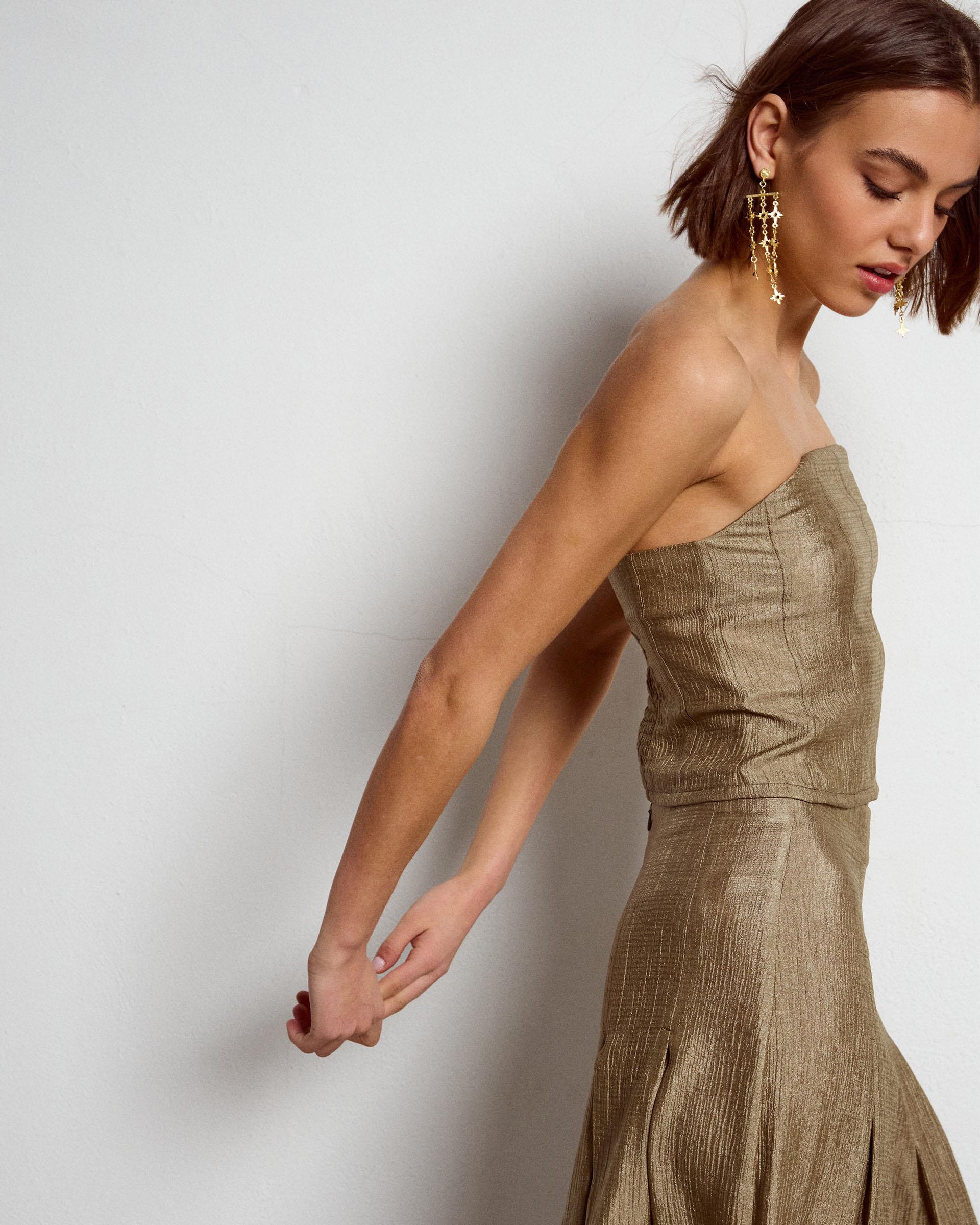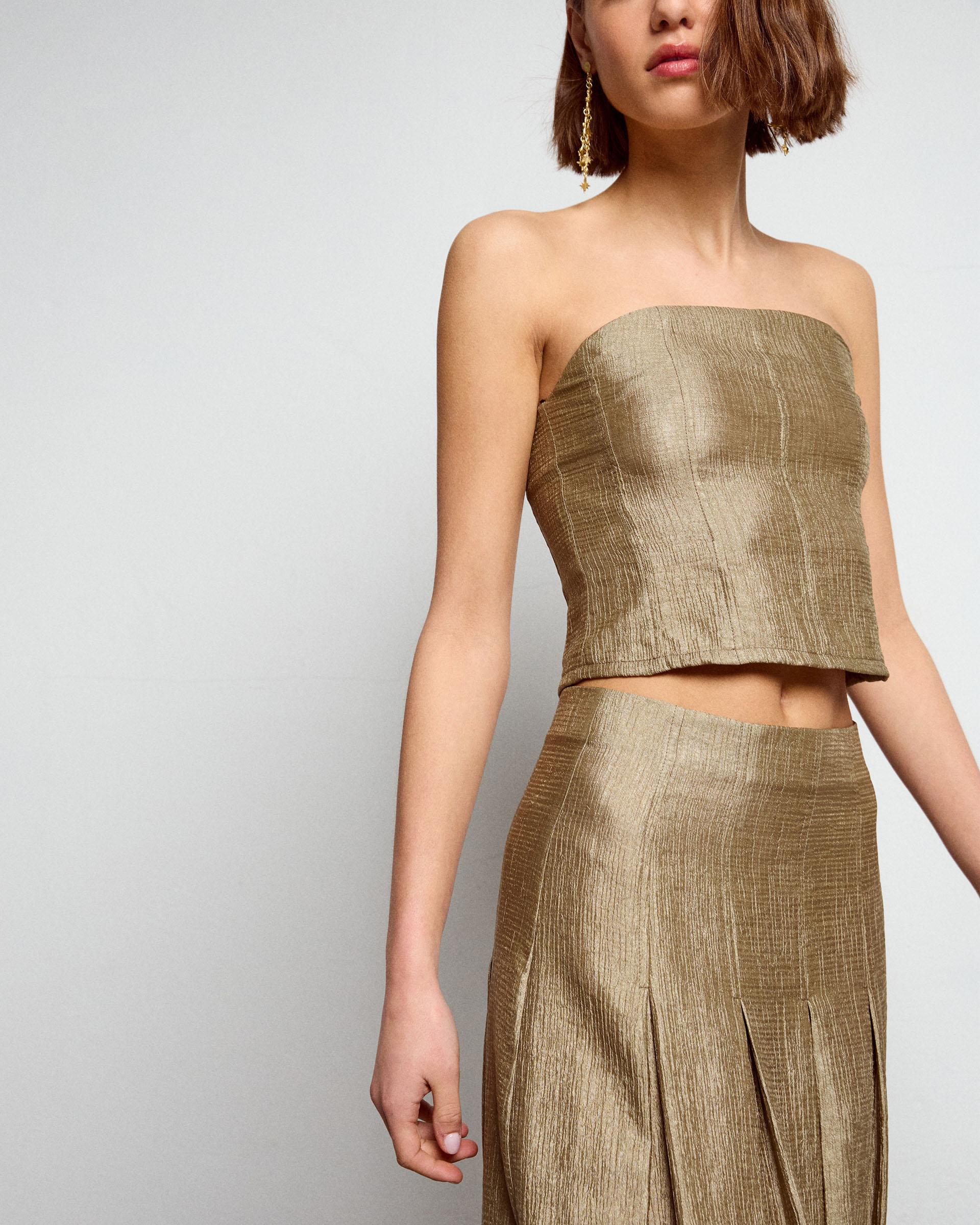 Top tipo palabra de honor en color verde con brillo, detalle de costuras y goma en trasero.