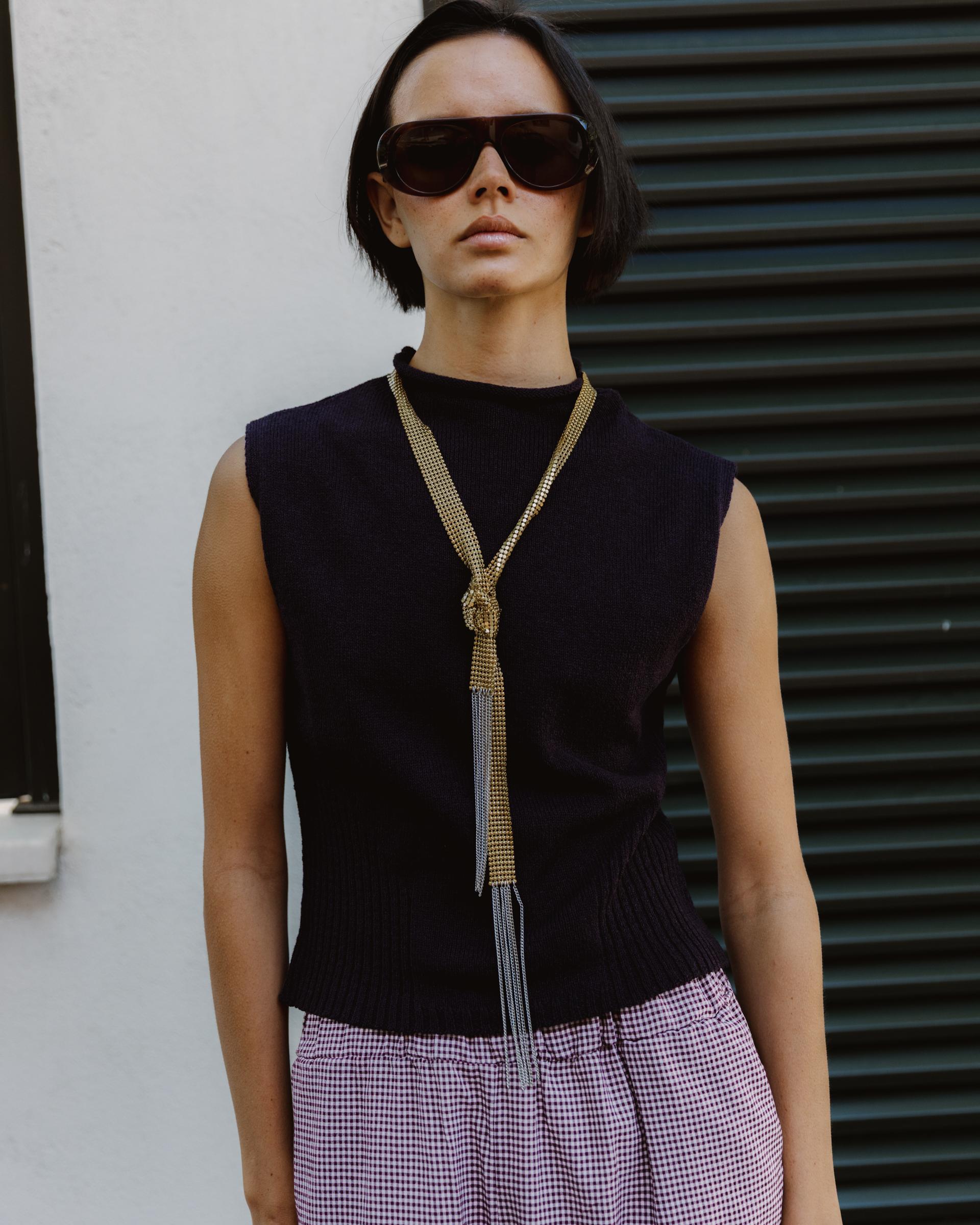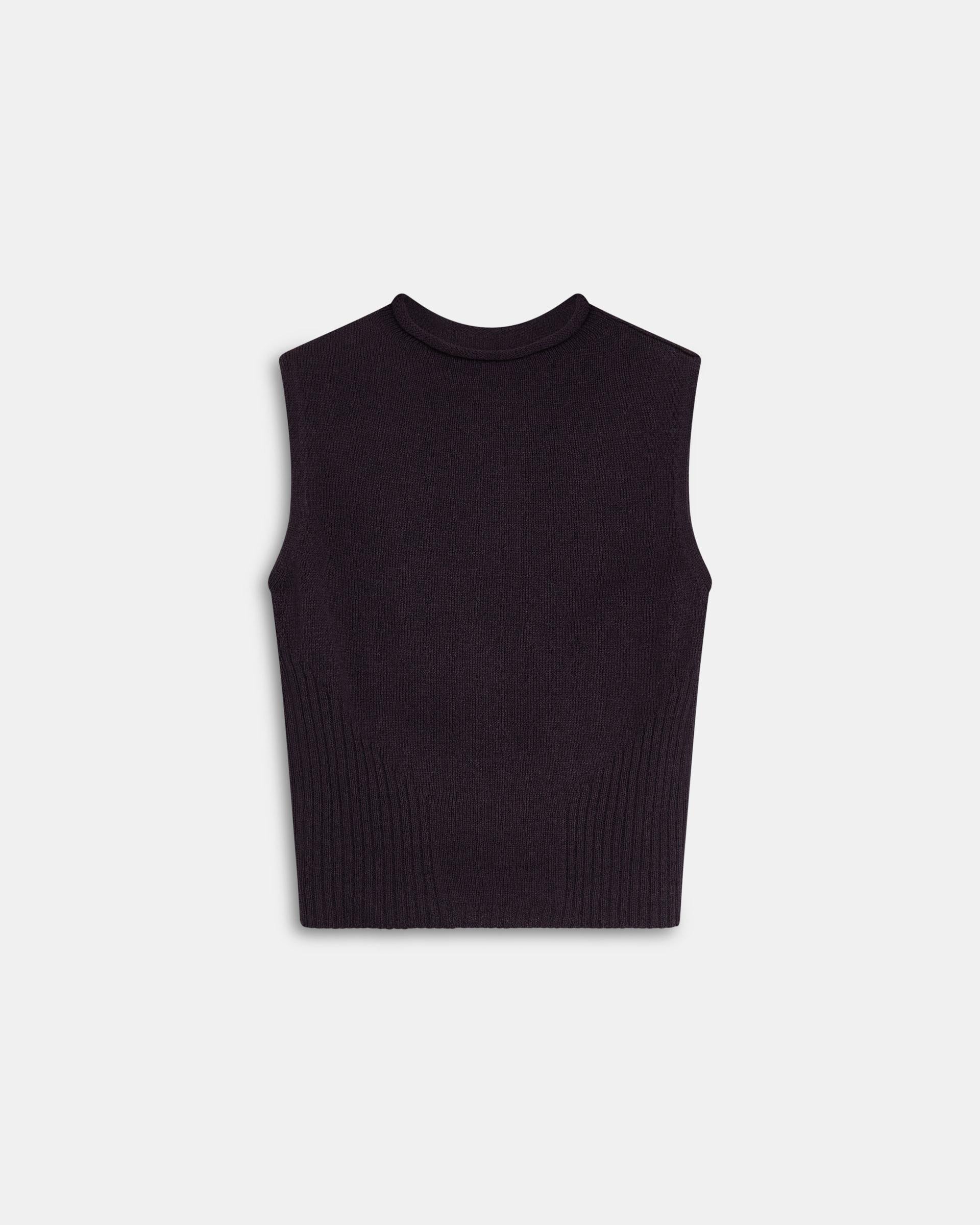 Top de punto sin mangas con escote redondo y detalle de rib, en color morado.
