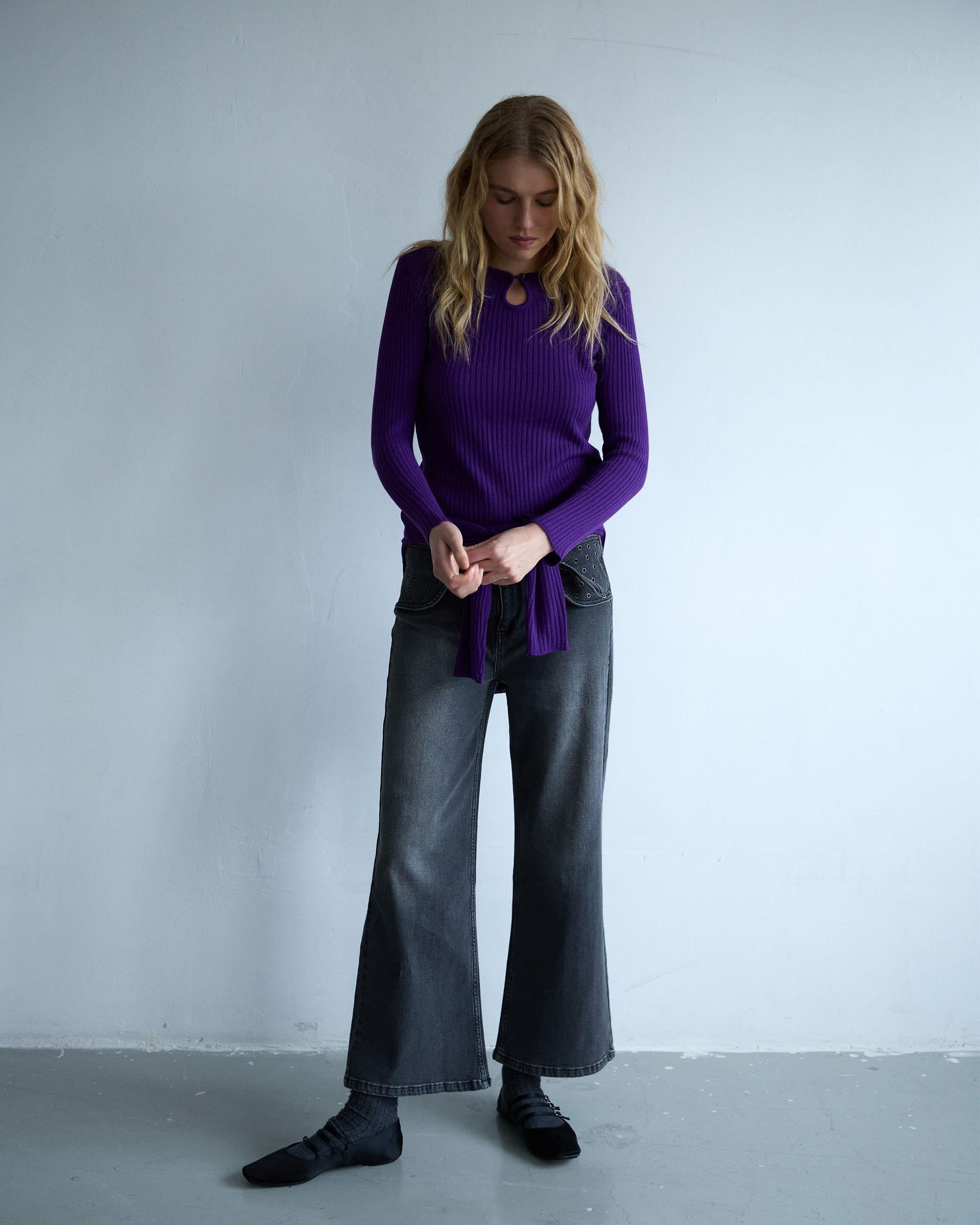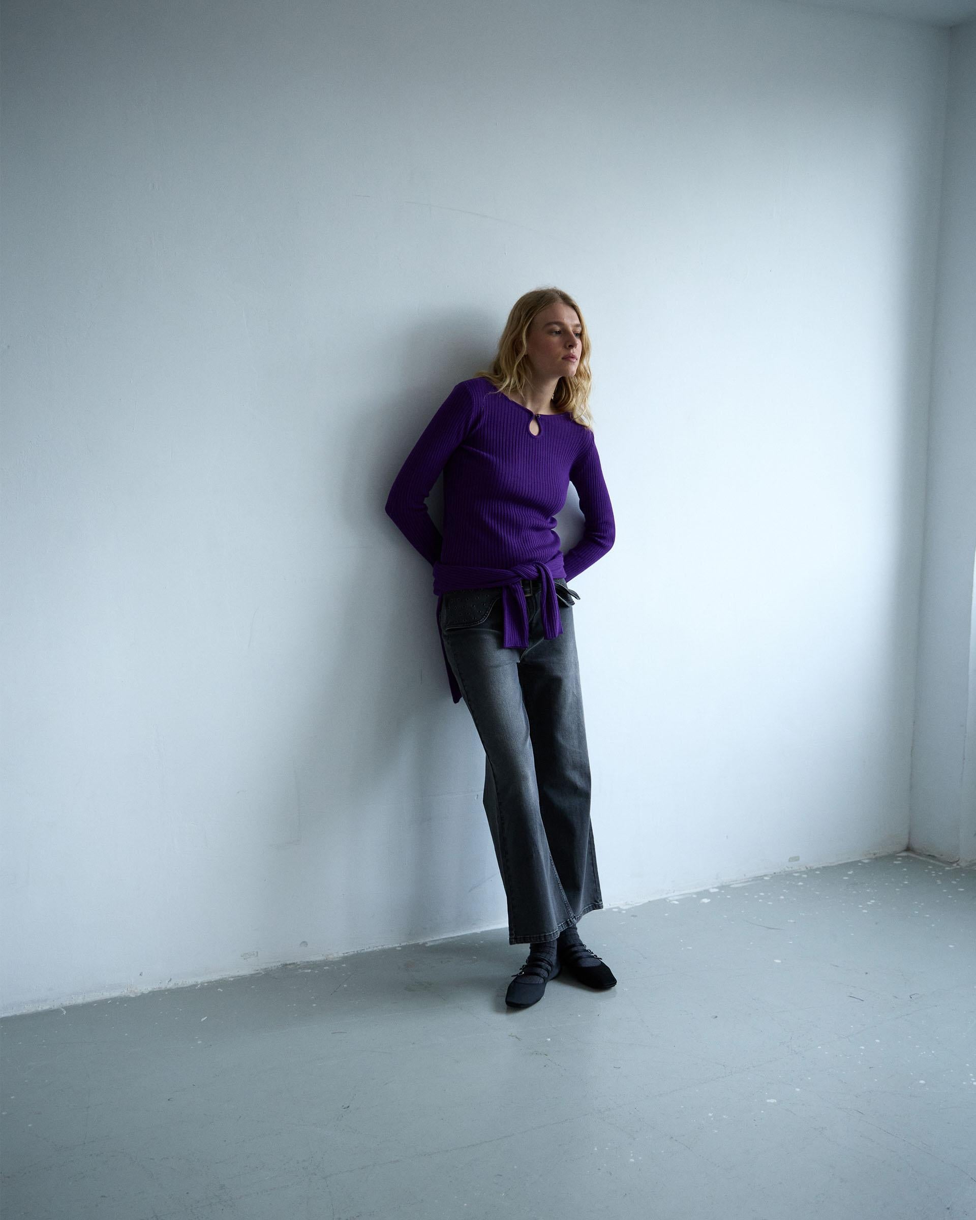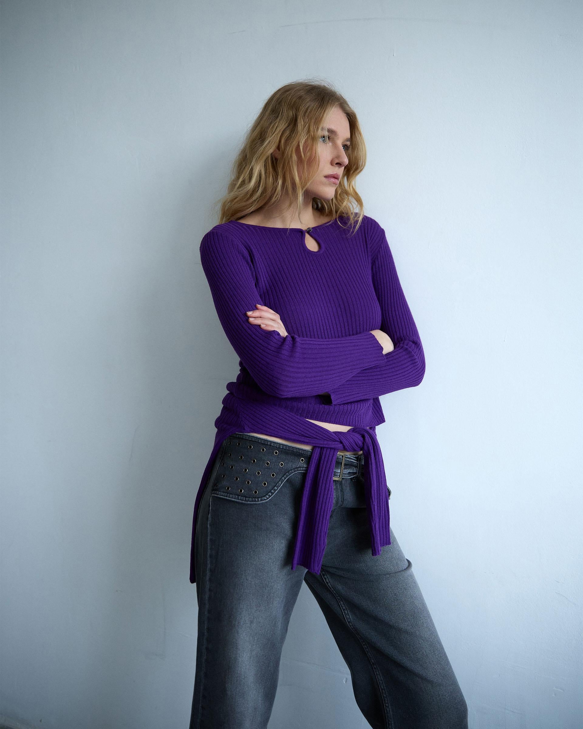 Top de manga larga con detalle de lágrima y botón en delantero, de color morado.