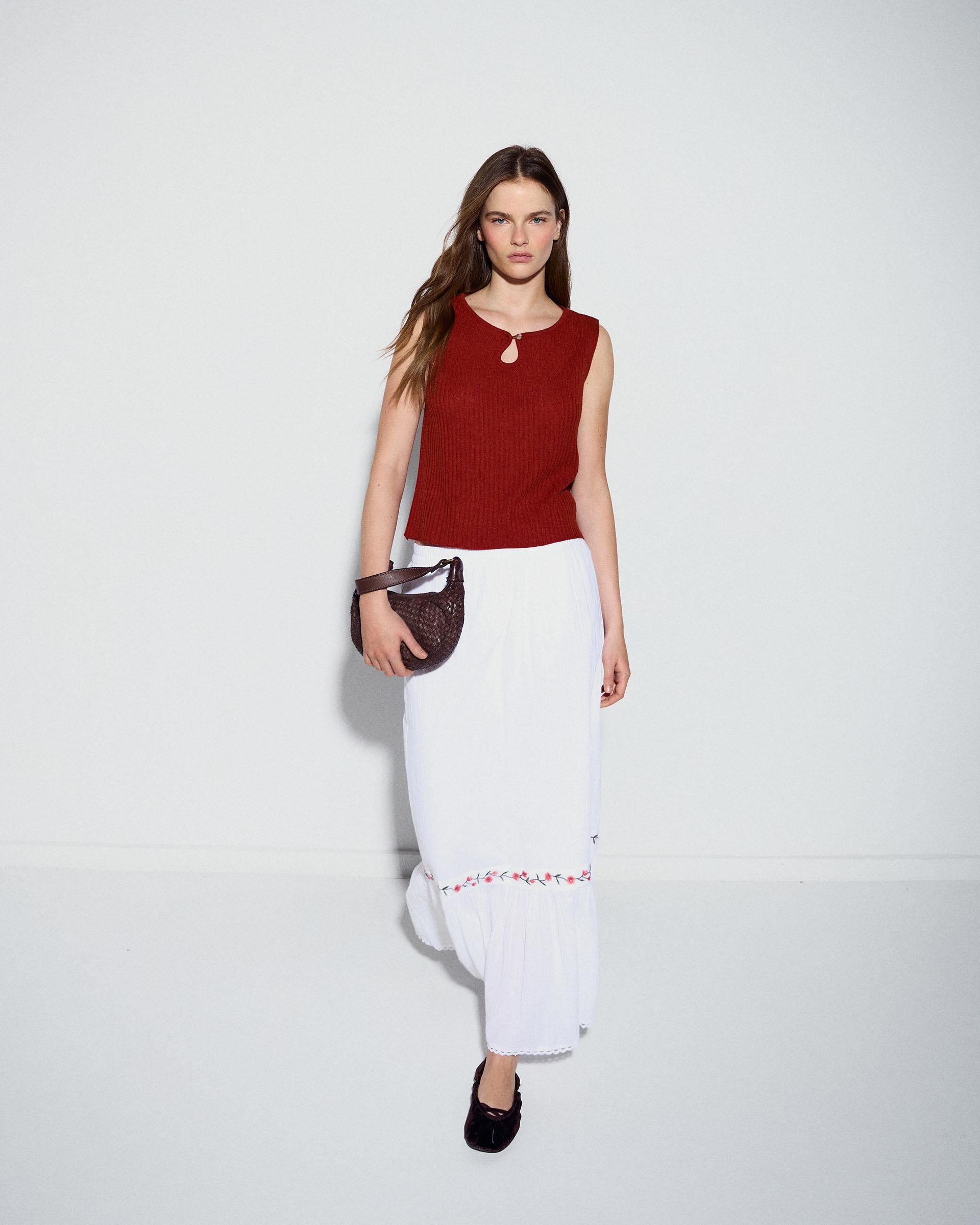 Top de punto sin mangas con detalle de lágrima y botón en delantero, de color naranja.