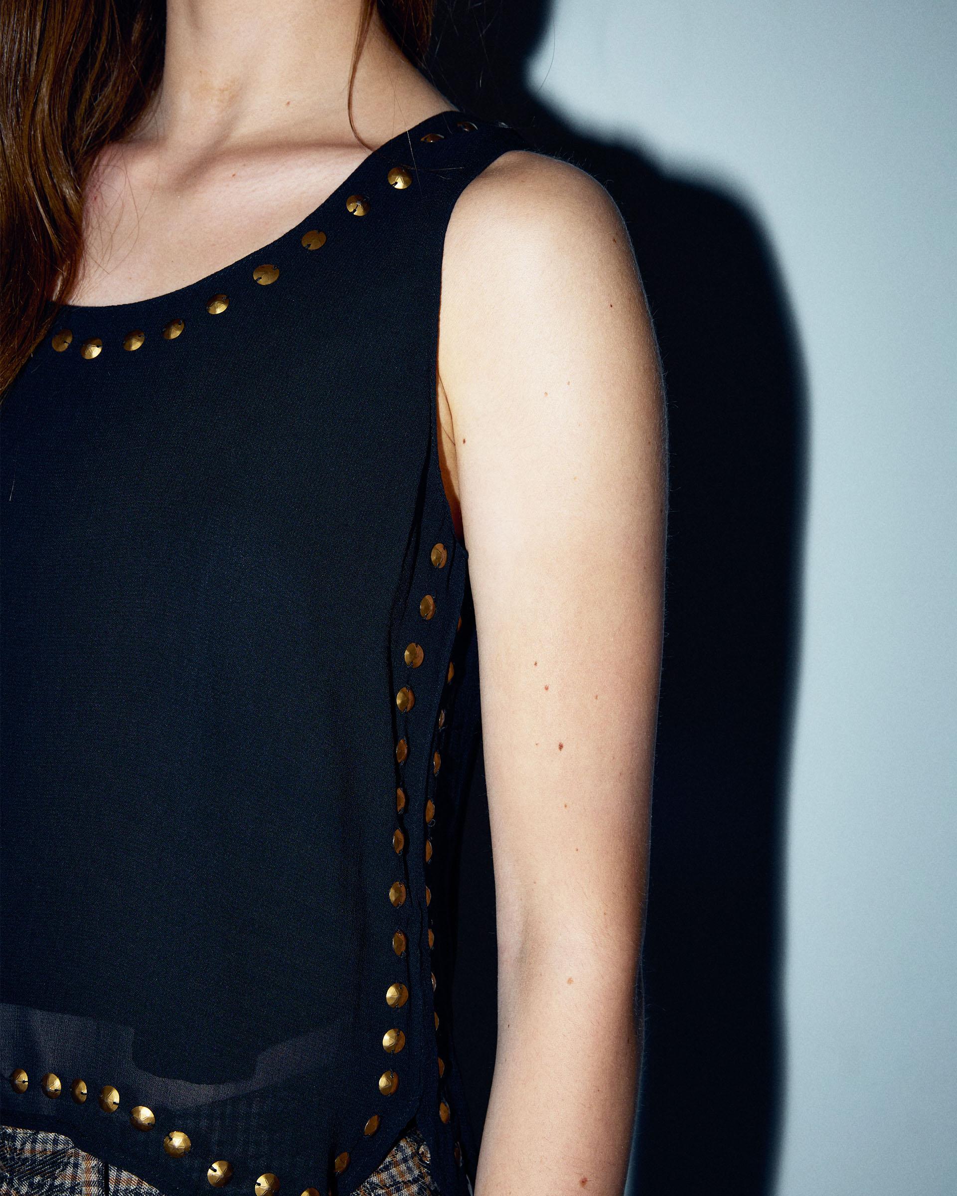 Top de tirantes en color negro con detalle de tachuelas en escote, laterales y bajo, con cierre en trasero con lágrima y botón.