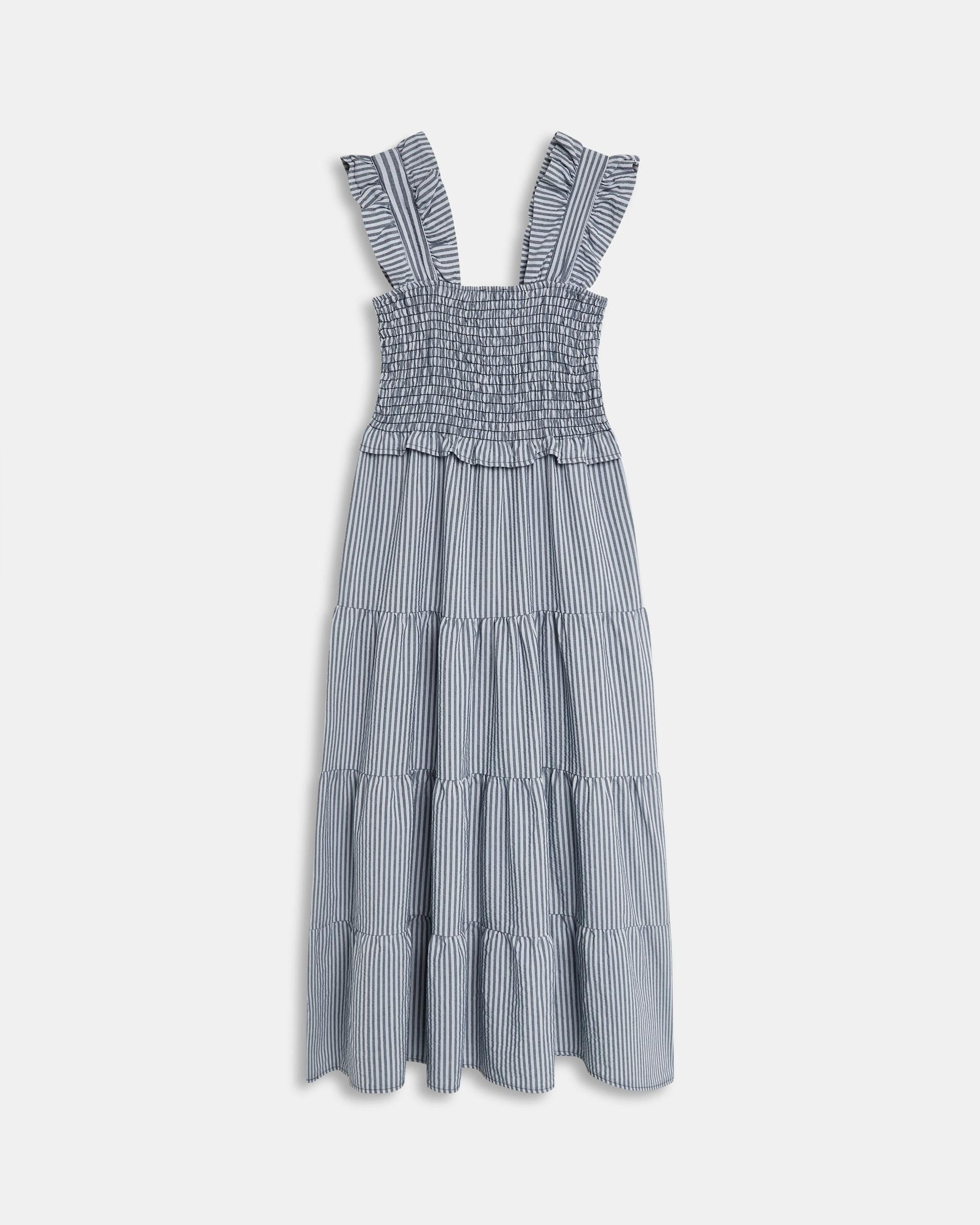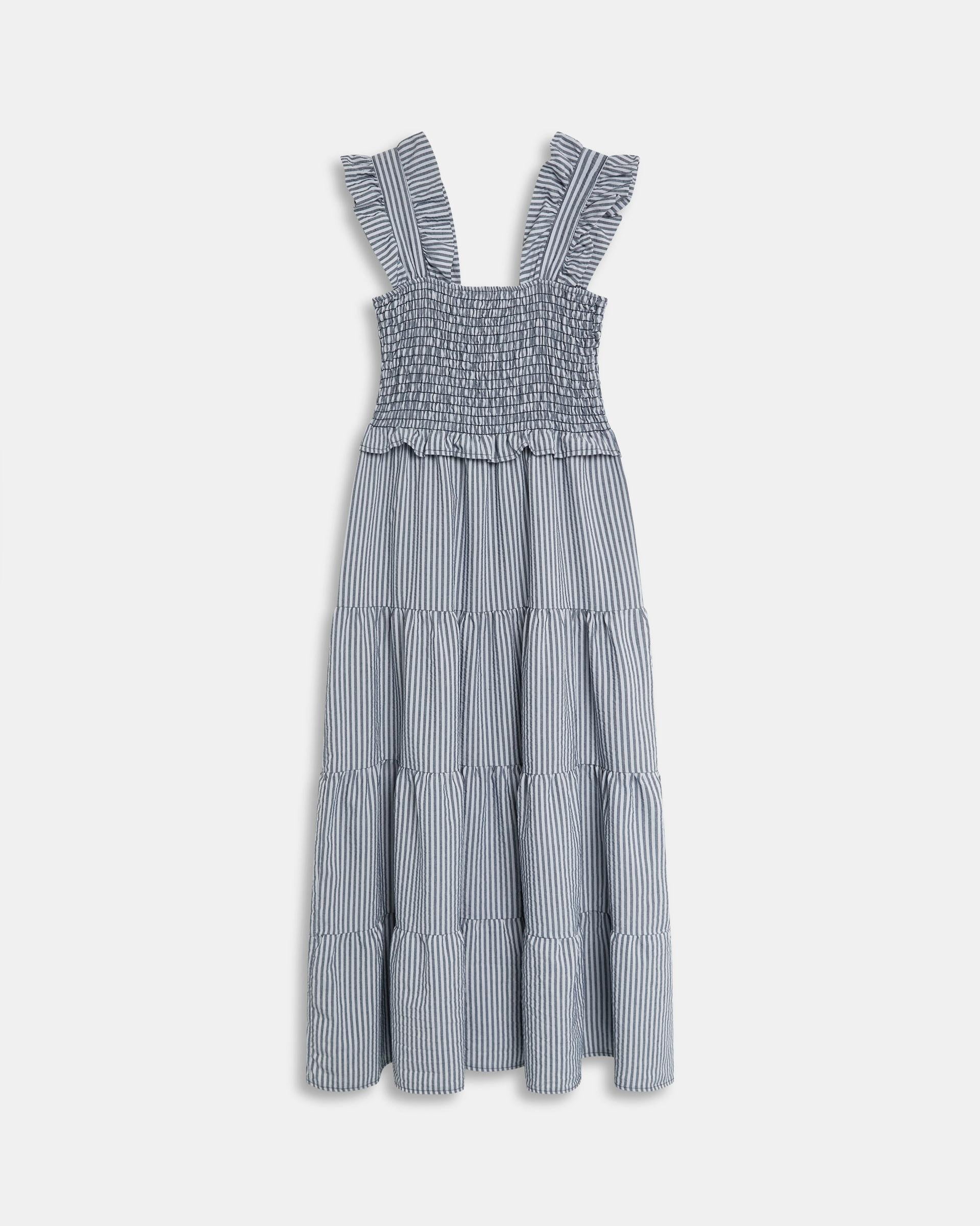 Vestido largo de rayas en color azul, nido de abeja y detalle de volantes en tirantes y falda.
