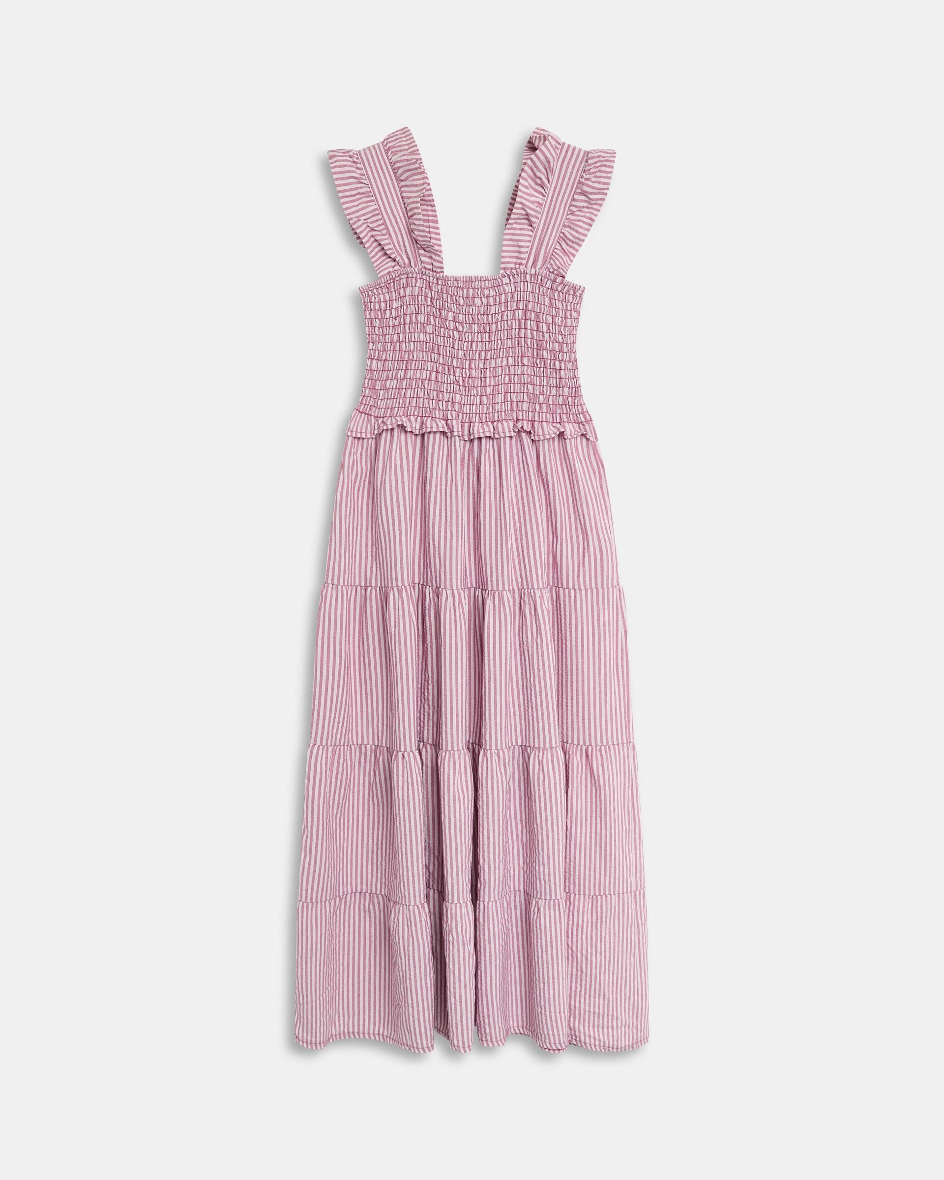 Vestido largo de rayas en color rosa, nido de abeja y detalle de volantes en tirantes y falda.