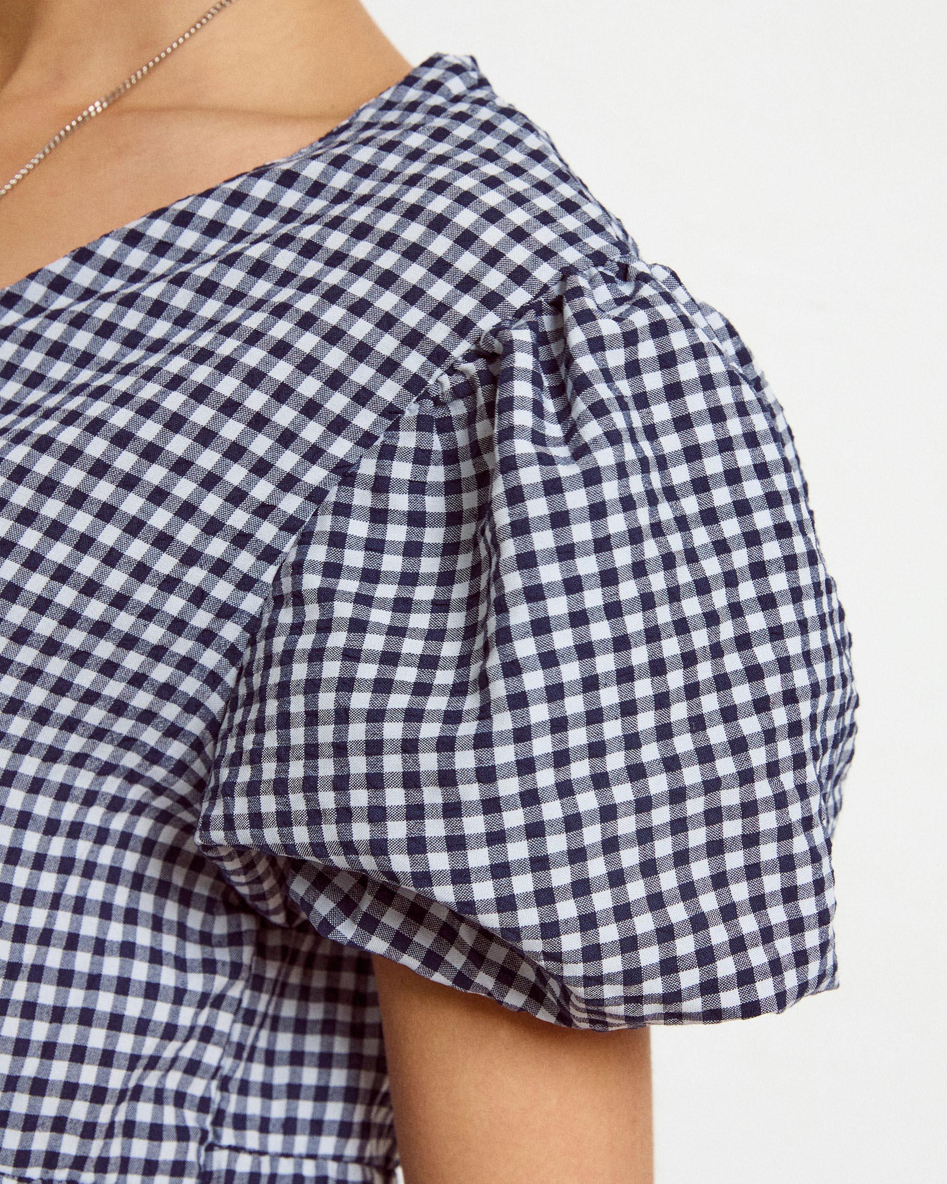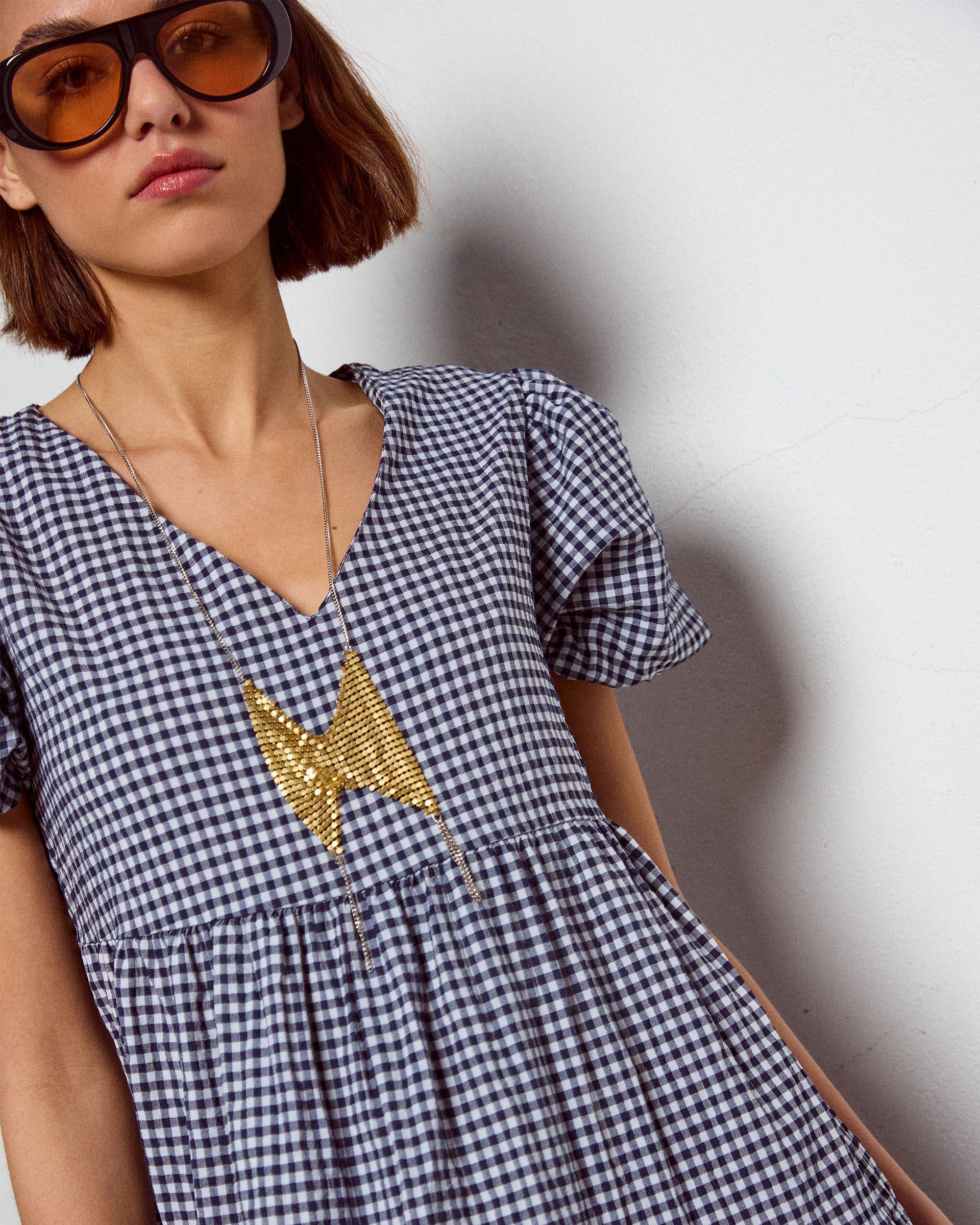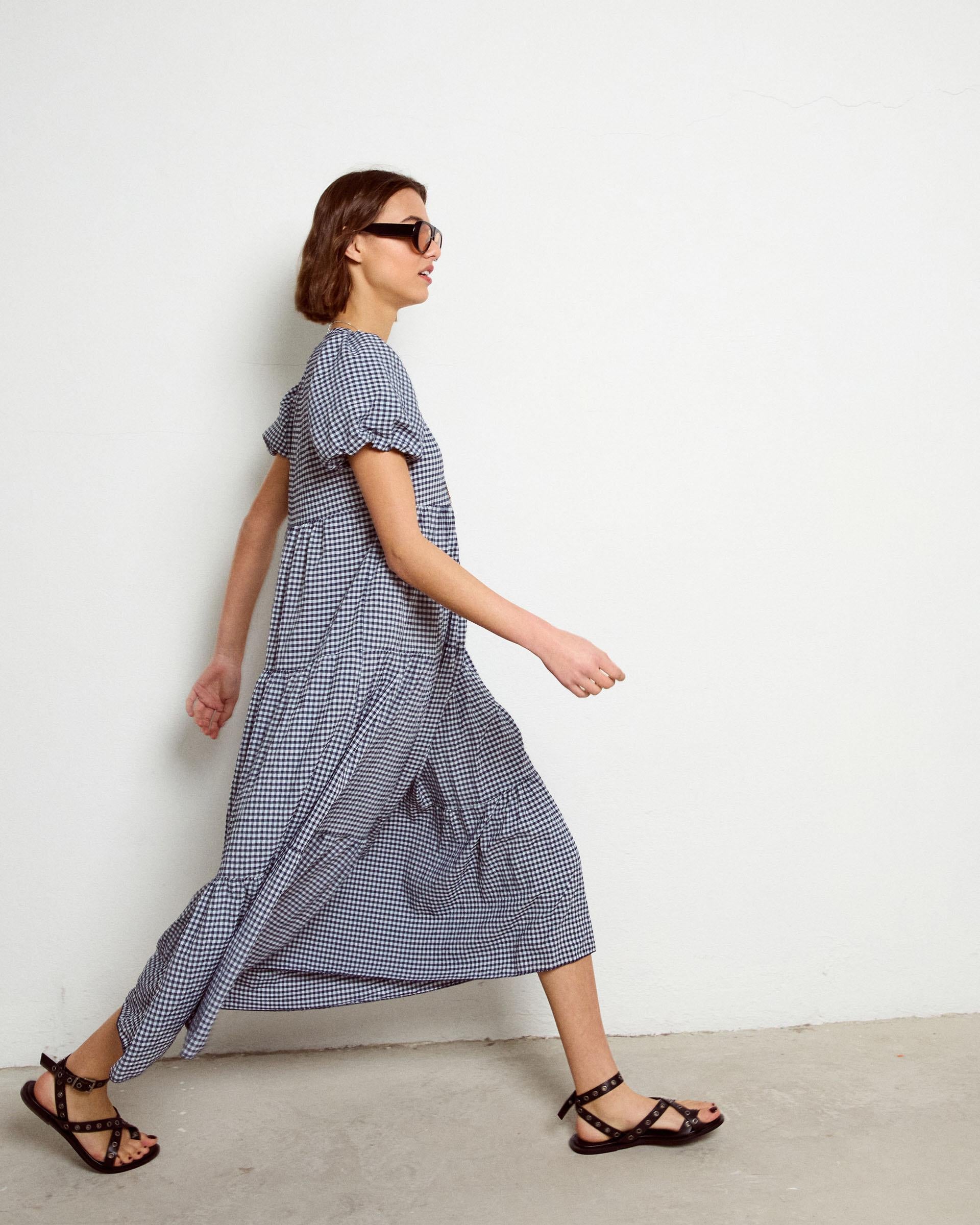 Vestido largo de manga corta y escote en pico, con cortes de cuadro vichy en color azul marino y blanco.