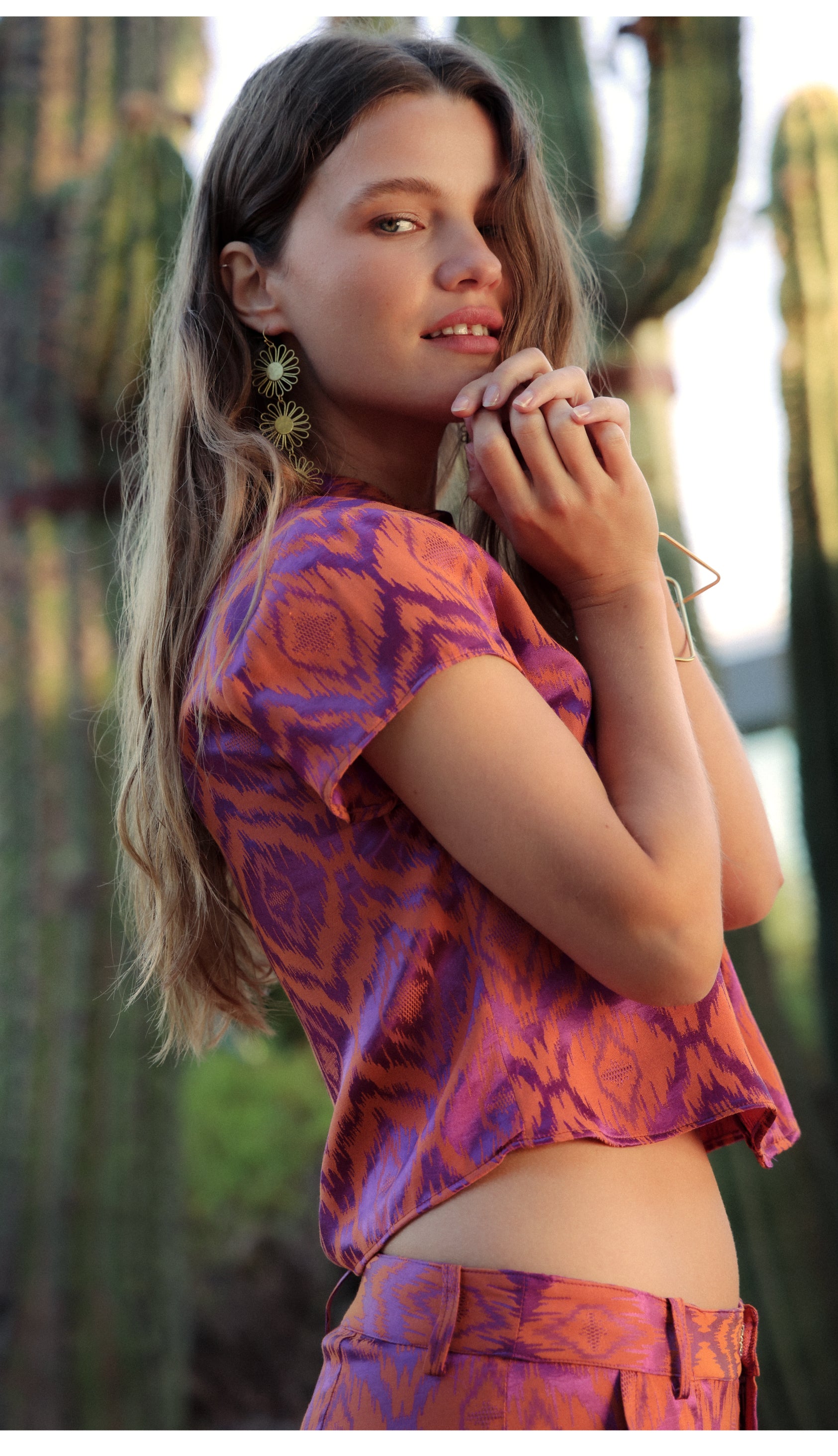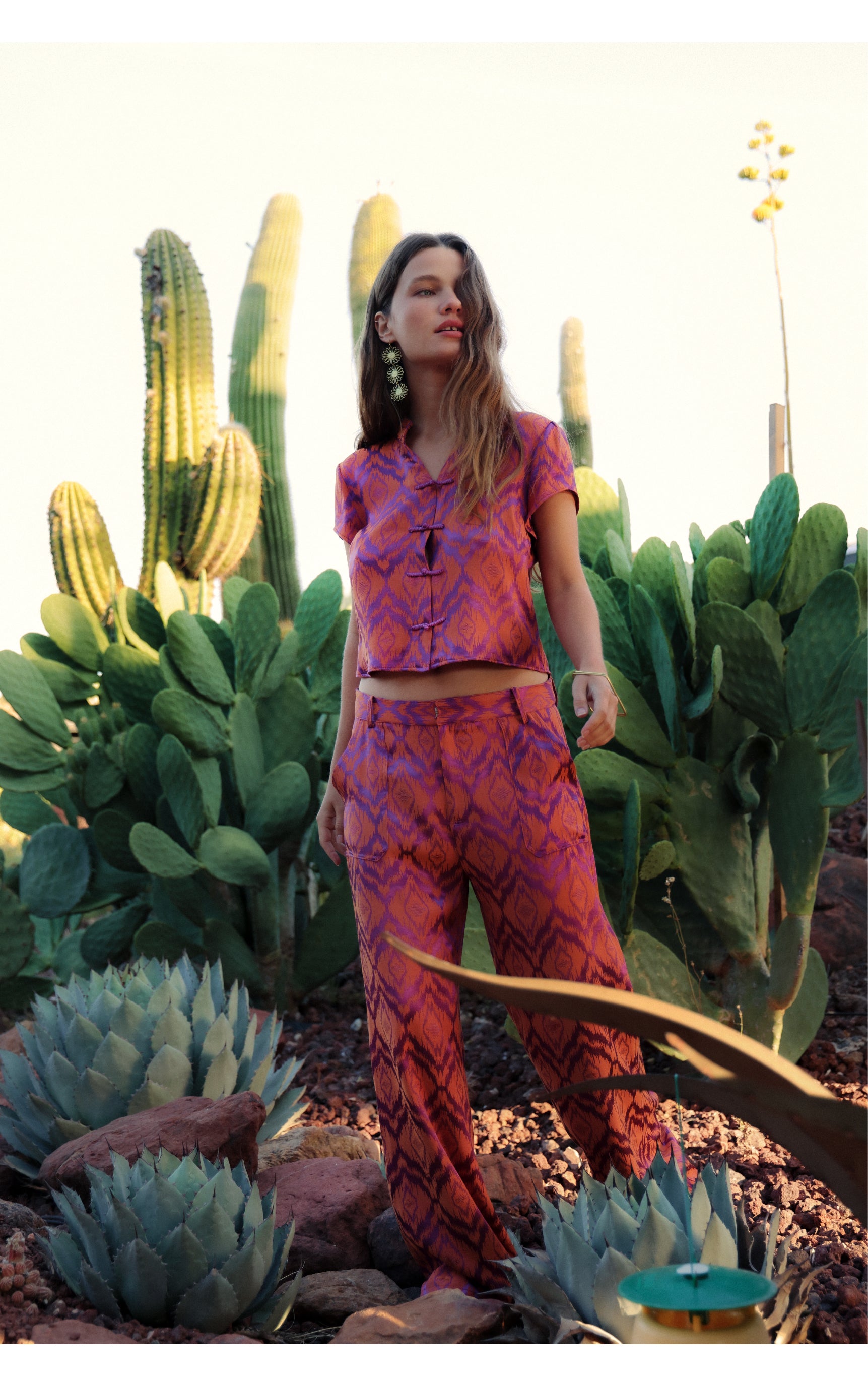 • Casaco roxo de abotoamento duplo com fecho de cordões.