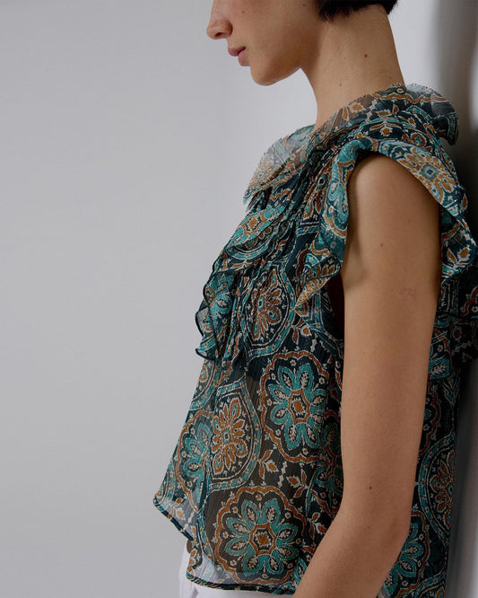 • Blusa fluída com estampado floral em tons de petróleo