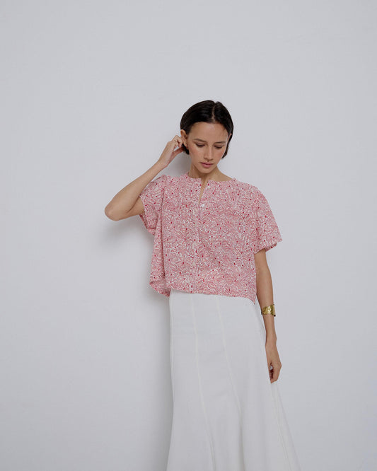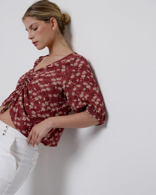 • Blusa estampada rosa franzida
