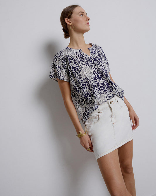 • Blusa azul-escura com estampado de amebas
