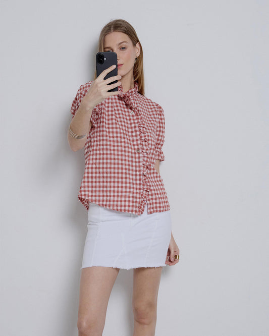 • Blusa xadrez roxa com folhos laterais