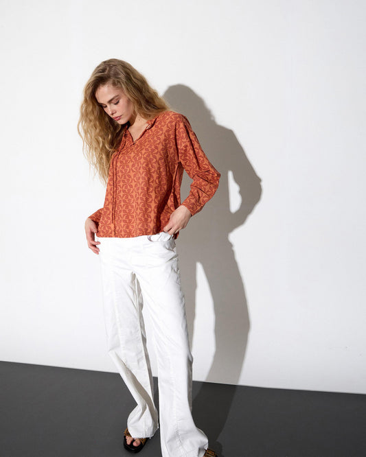 • Blusa rosa com estampado geométrico