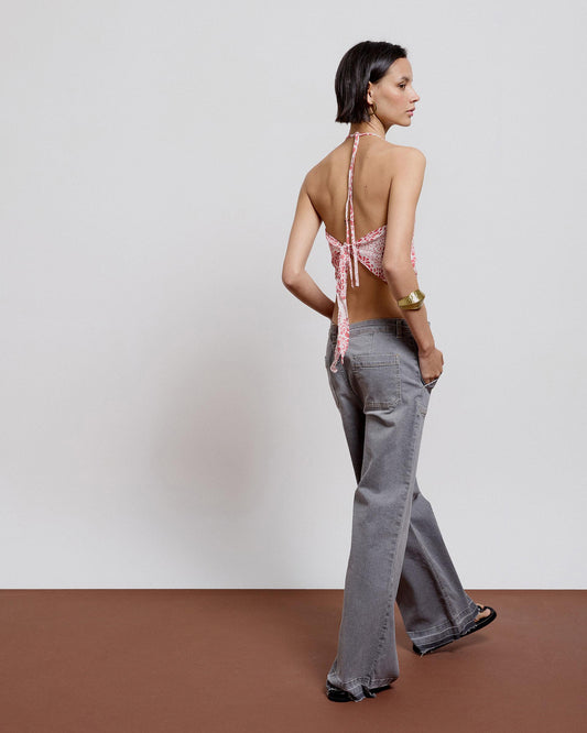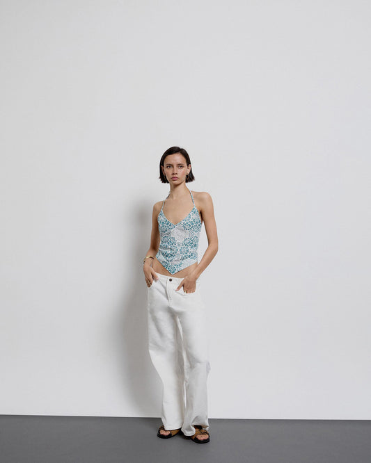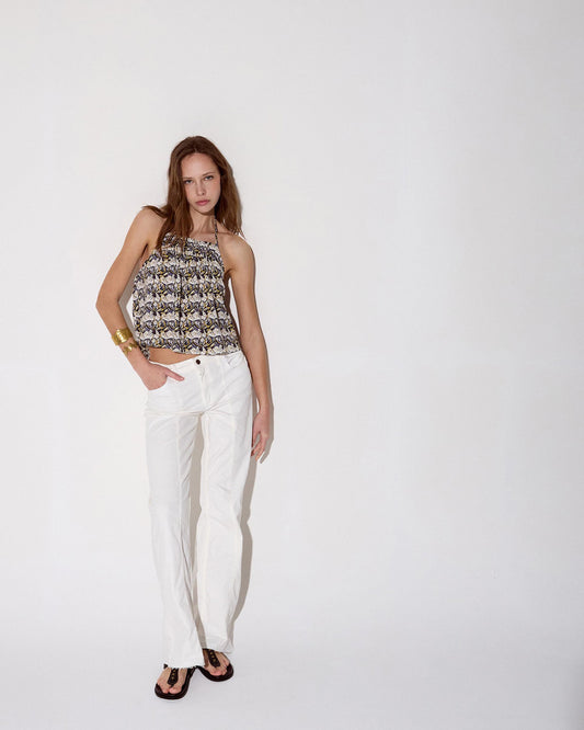 • Top bege com estampado floral e decote alto