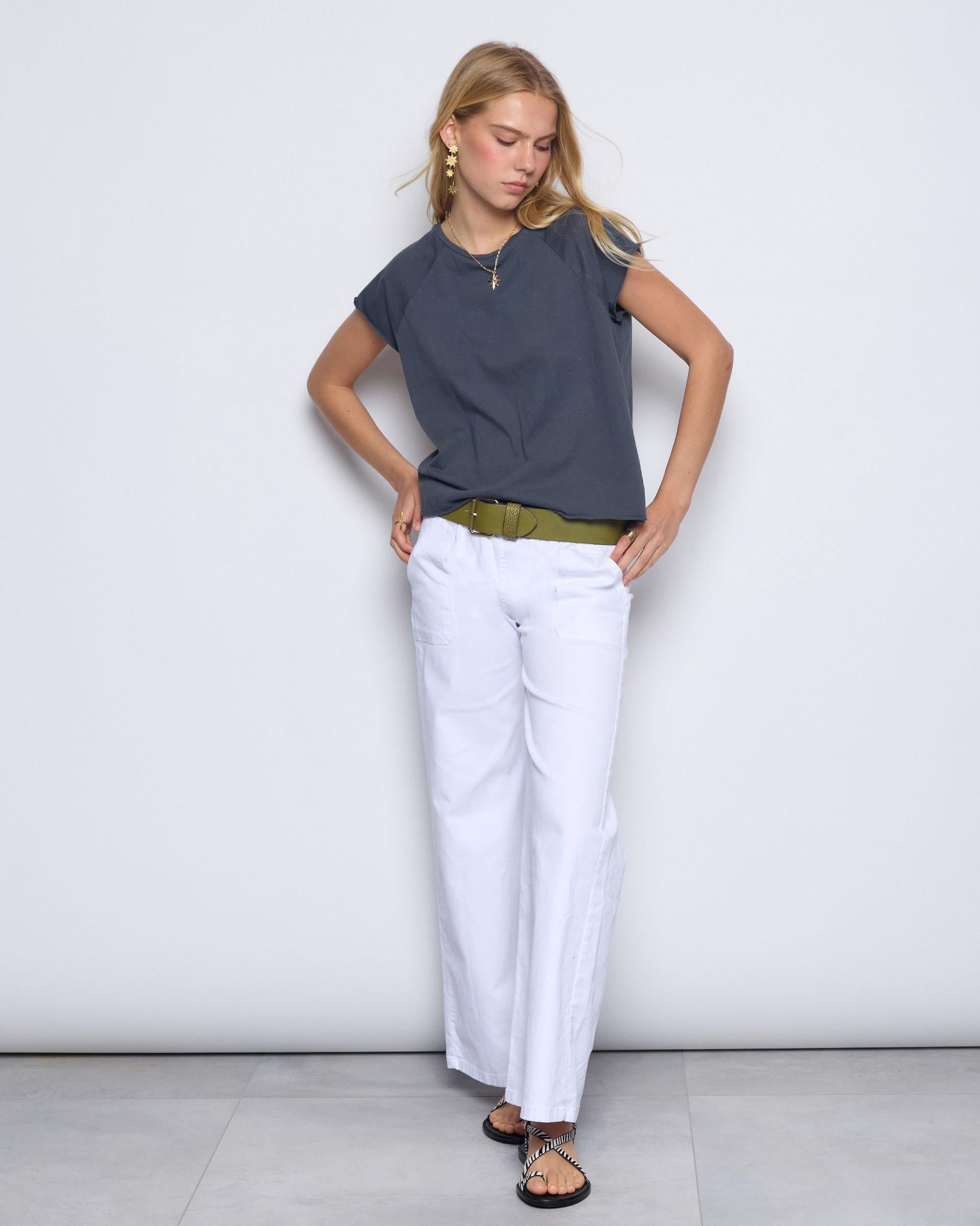 Camiseta manga curta raglan, com acabamento nas mangas cinza escuro.