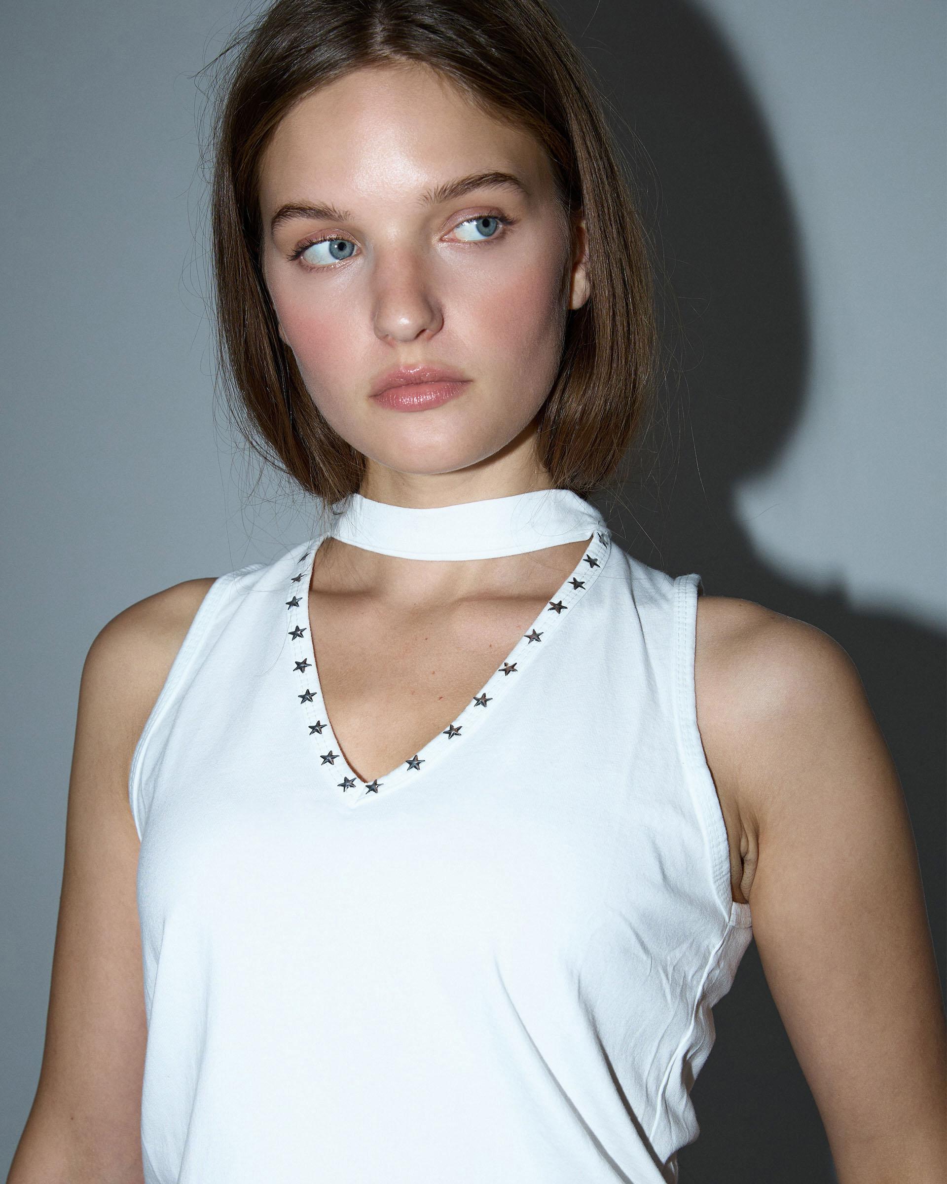 Regata com decote em V, alça no pescoço e tachas em forma de estrela.