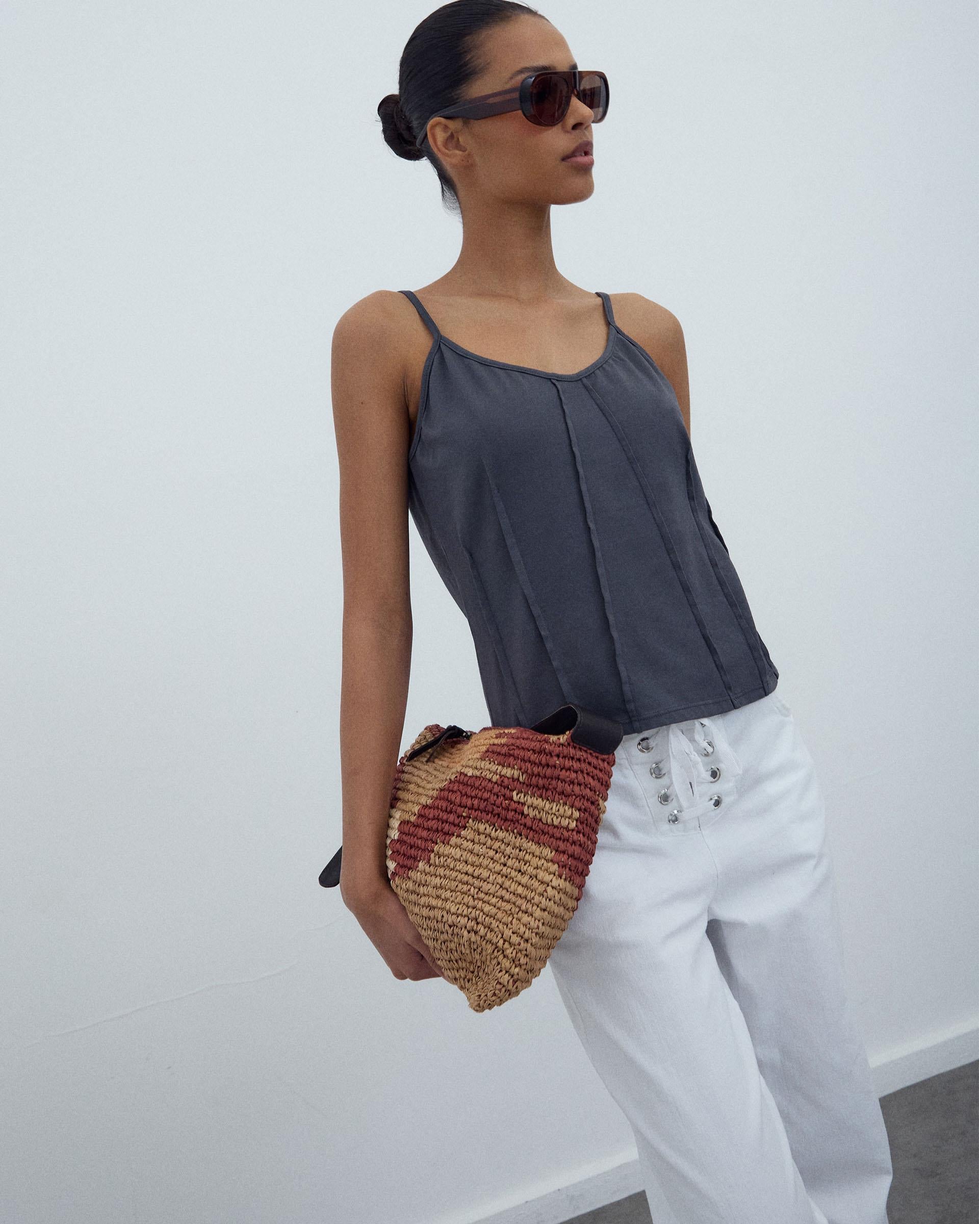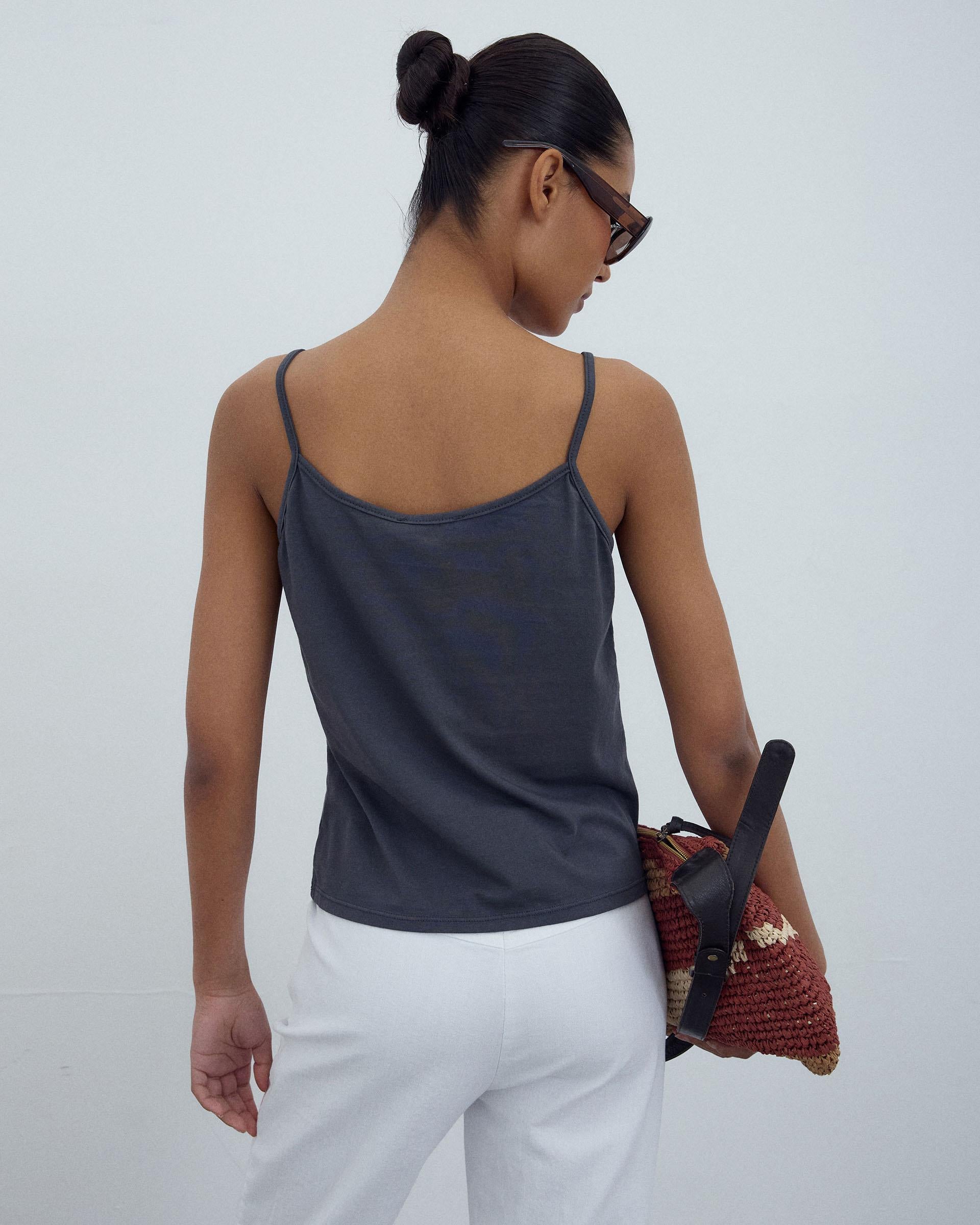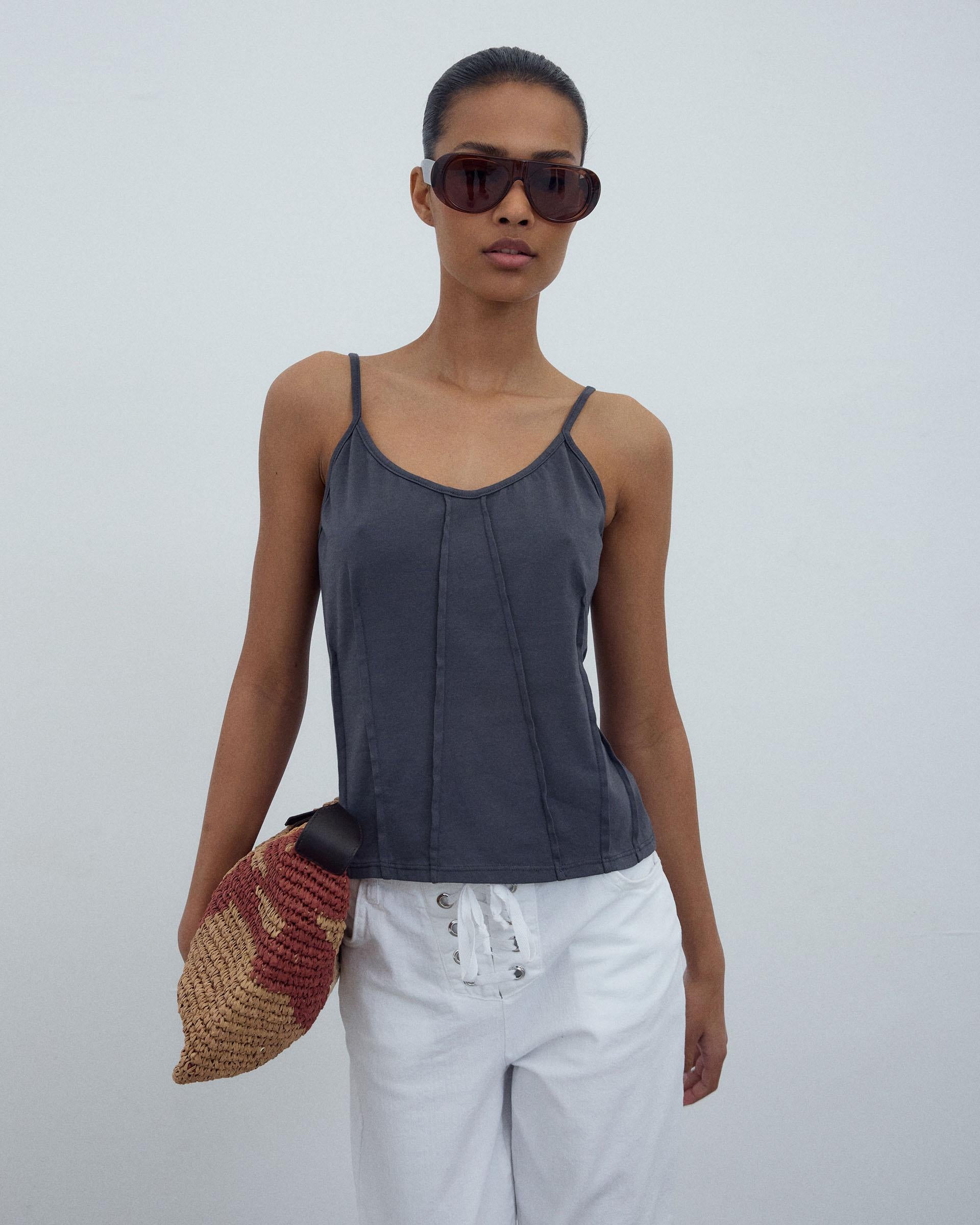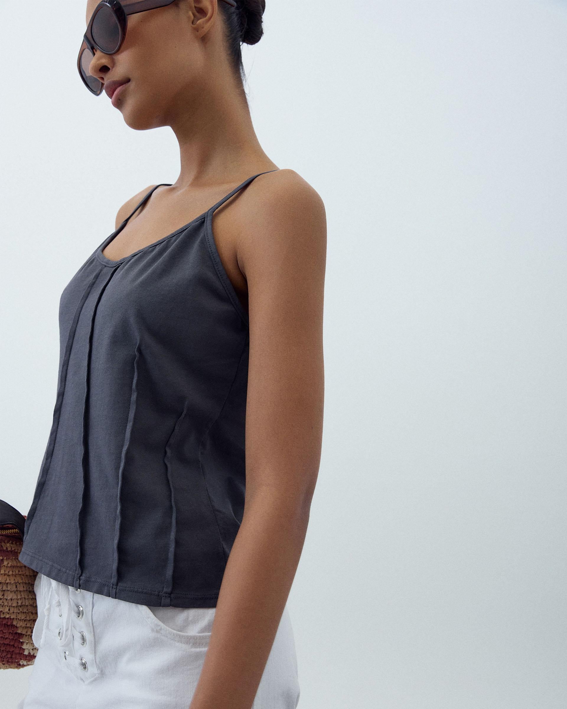 T-shirt de alças em cor antracite com detalhe de costuras tipo nervuras.