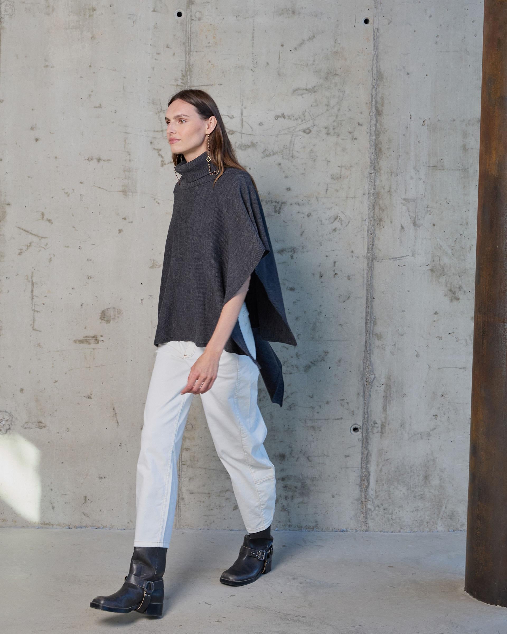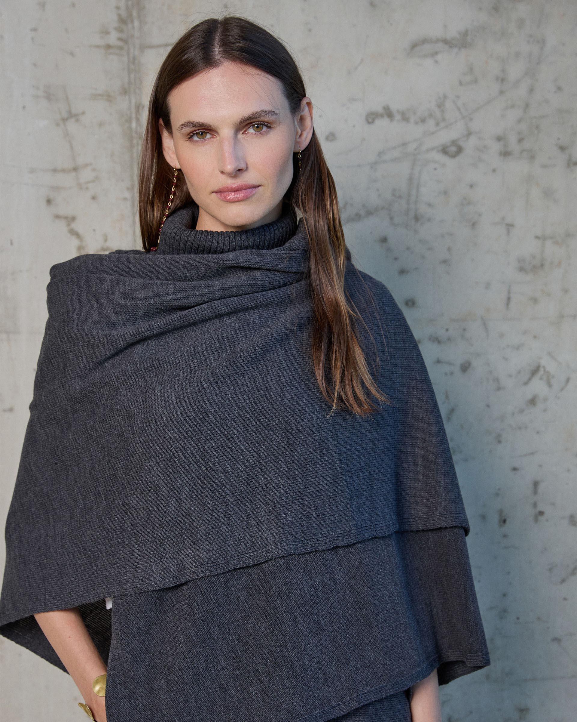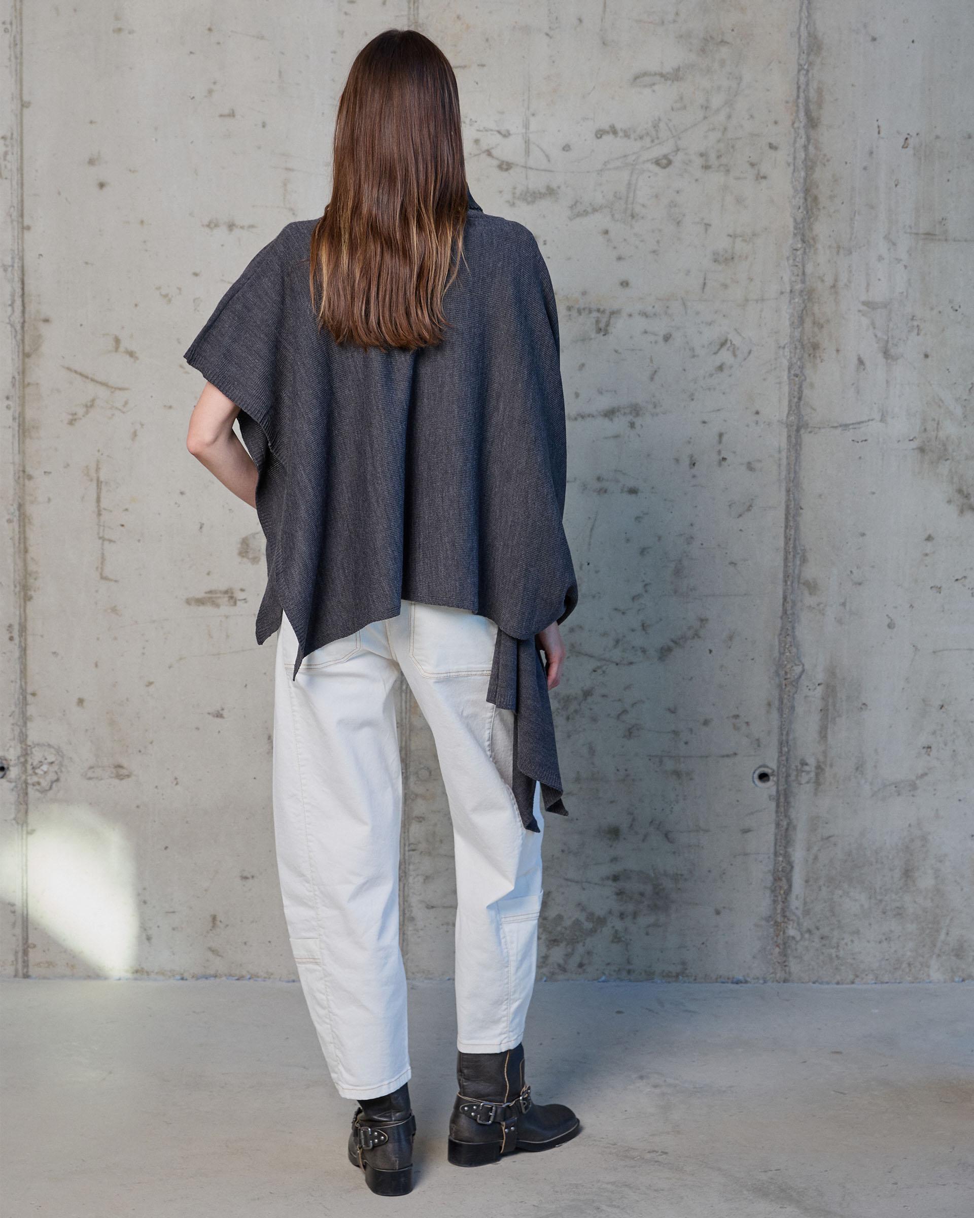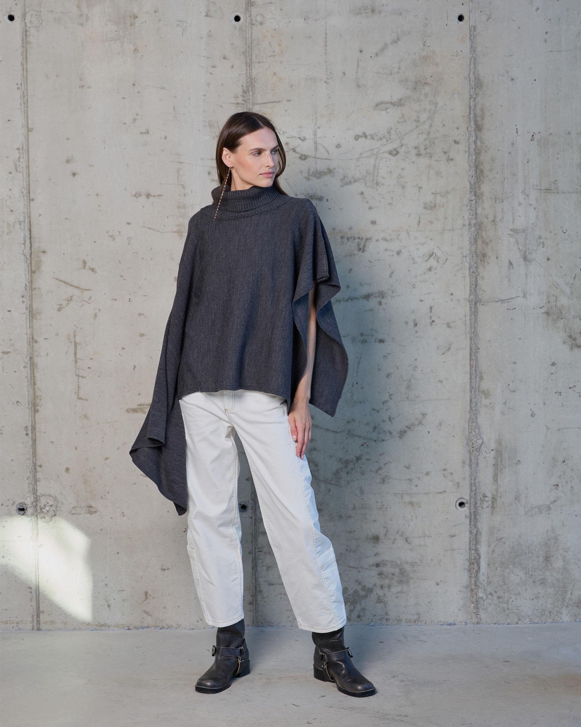 Capa de gola alta com bainha assimétrica, cinza escuro.