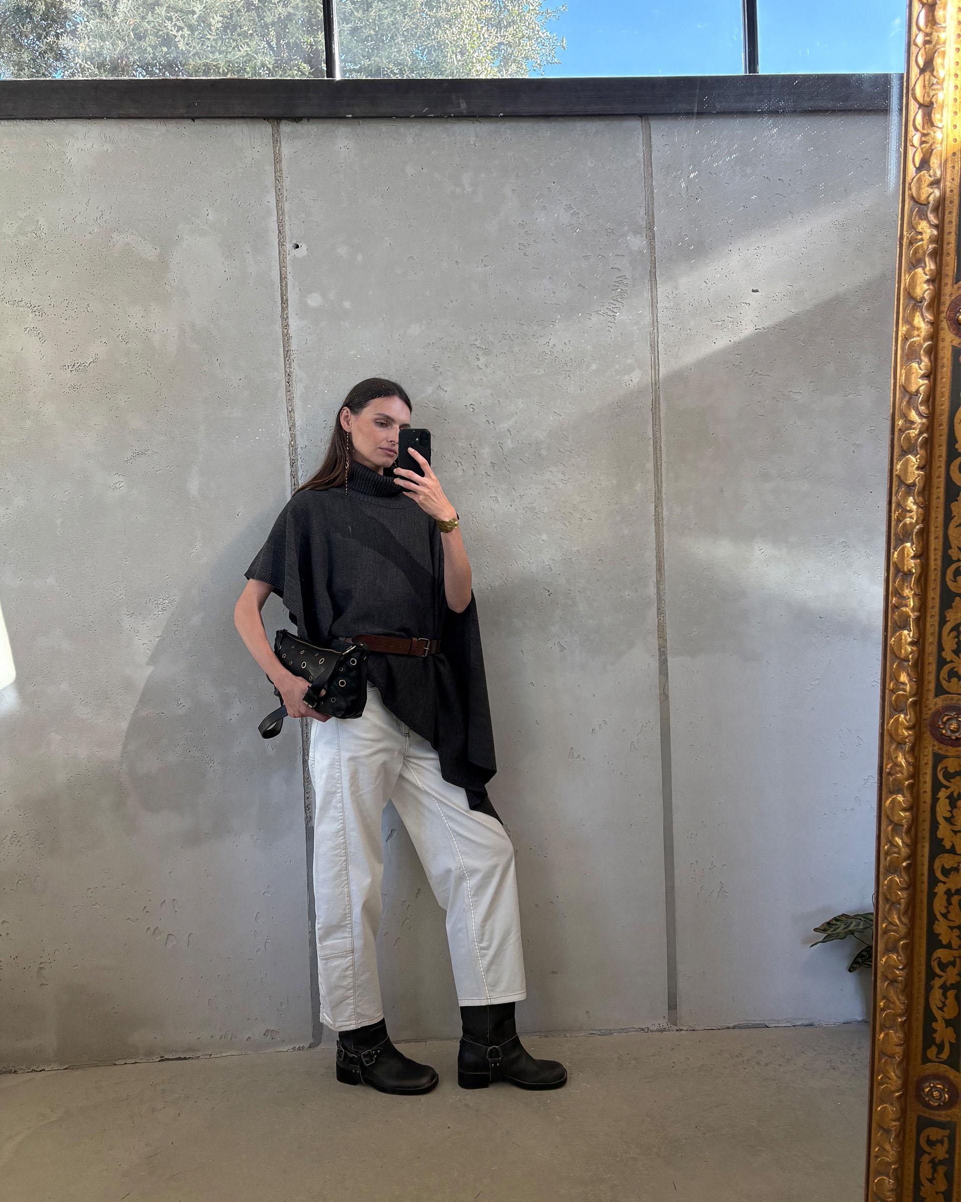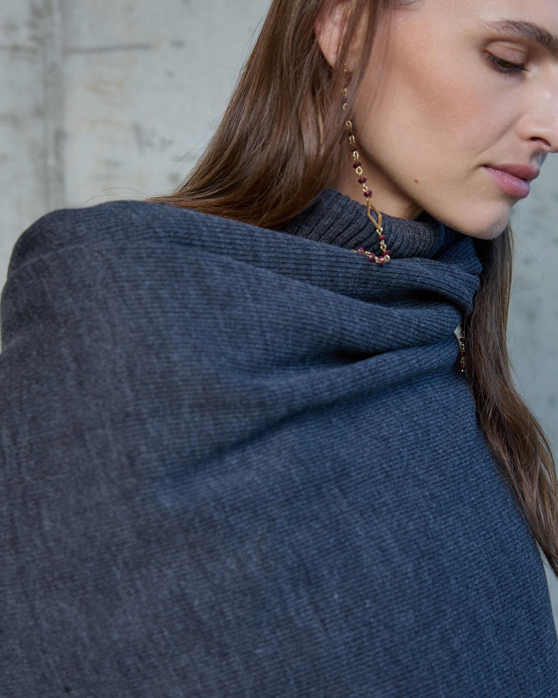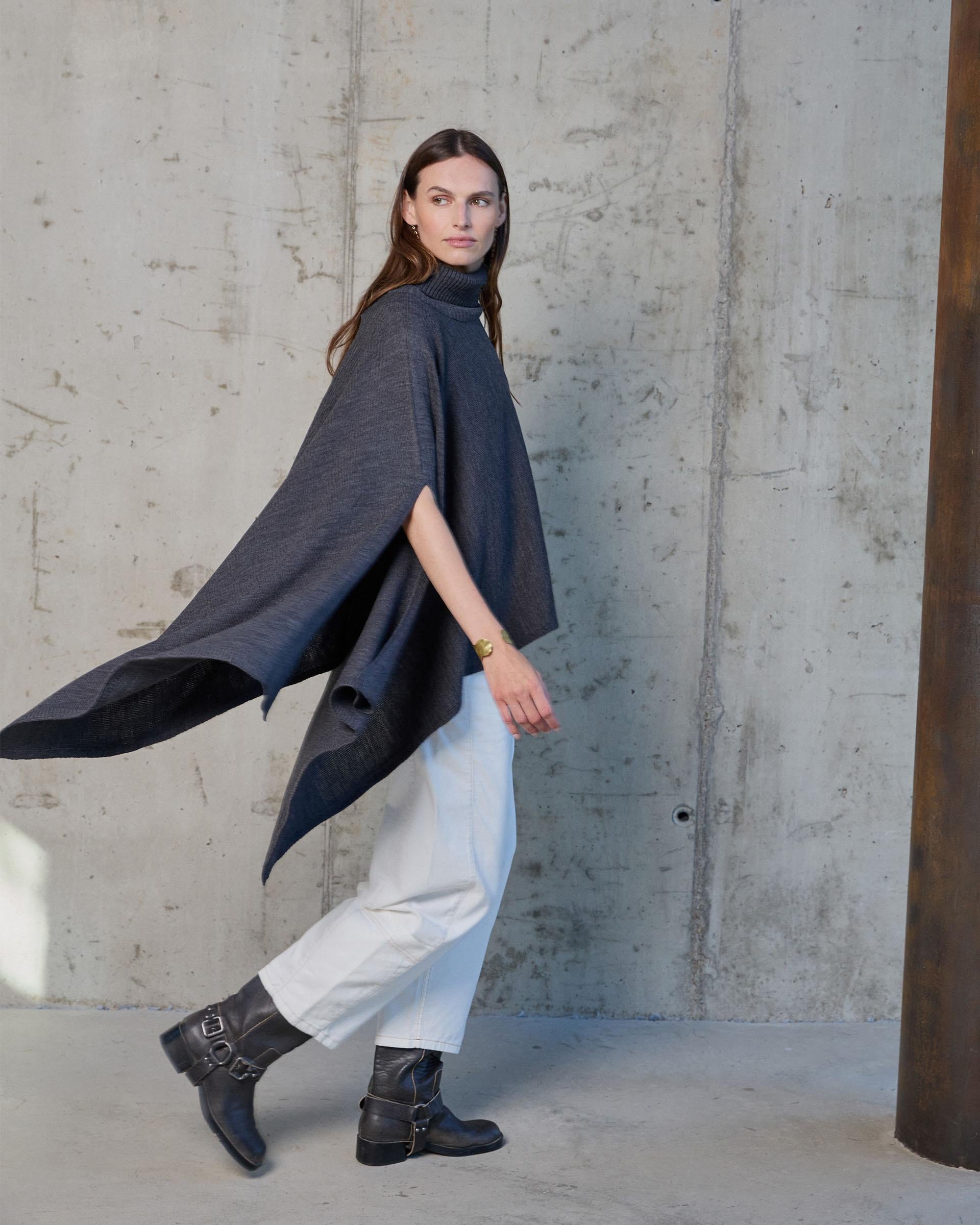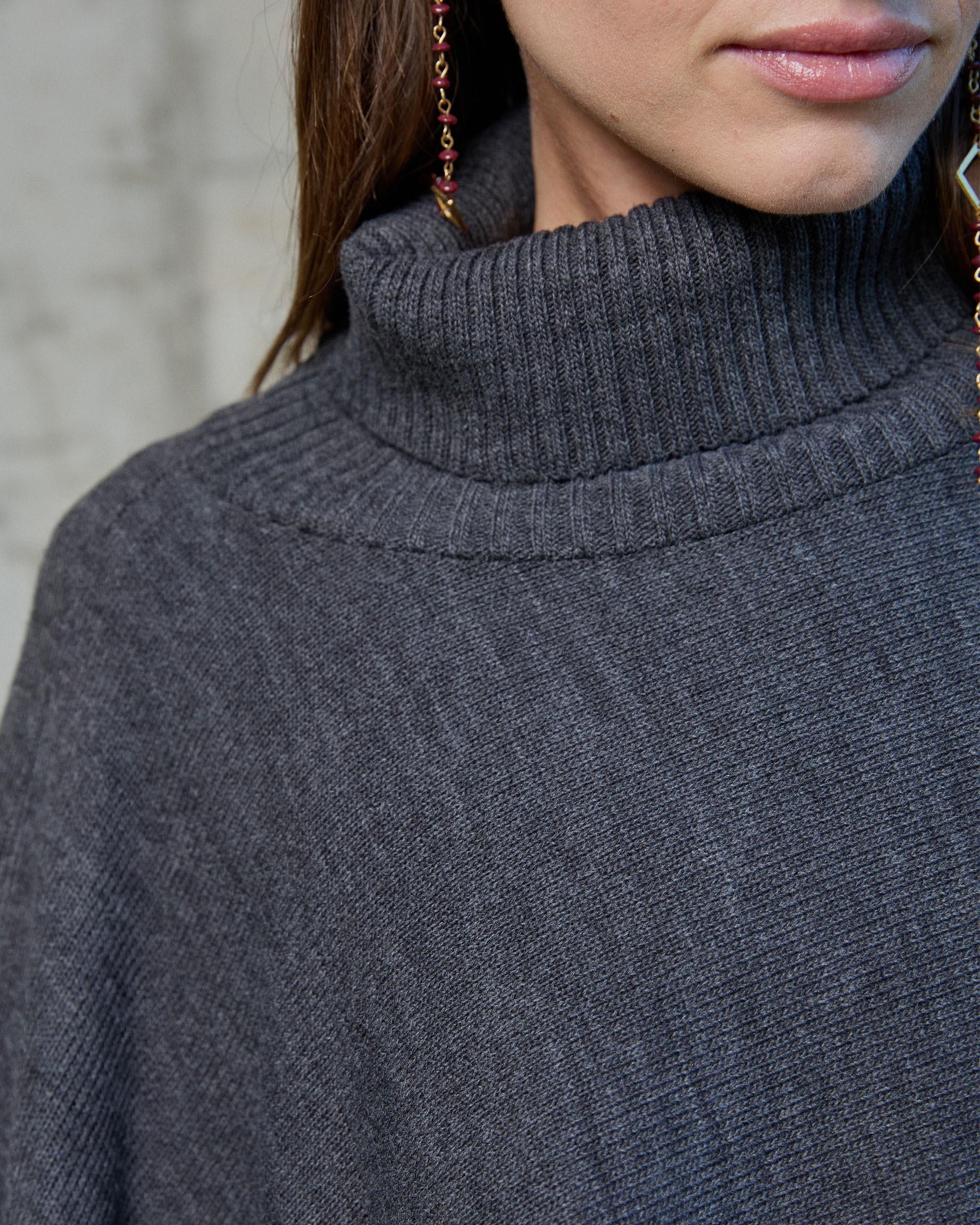 Capa de gola alta com bainha assimétrica, cinza escuro.