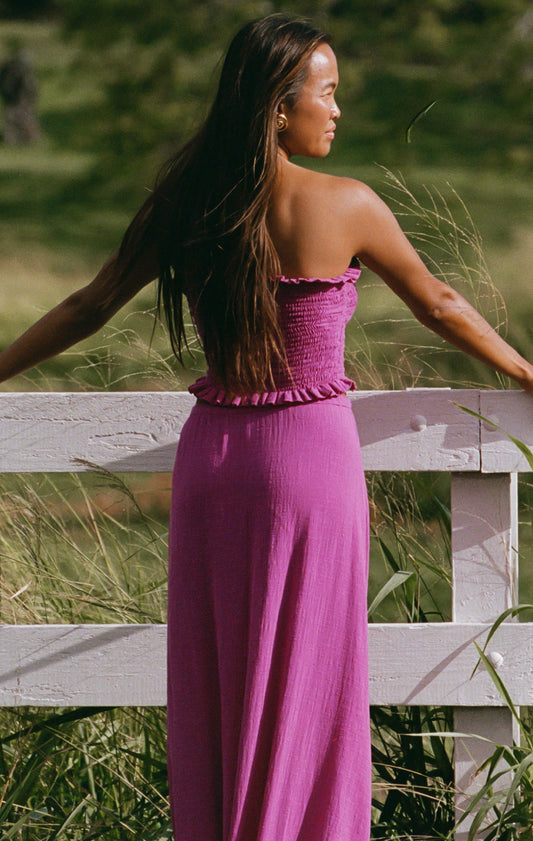 Casaco roxo de abotoamento duplo com fecho de cordões.