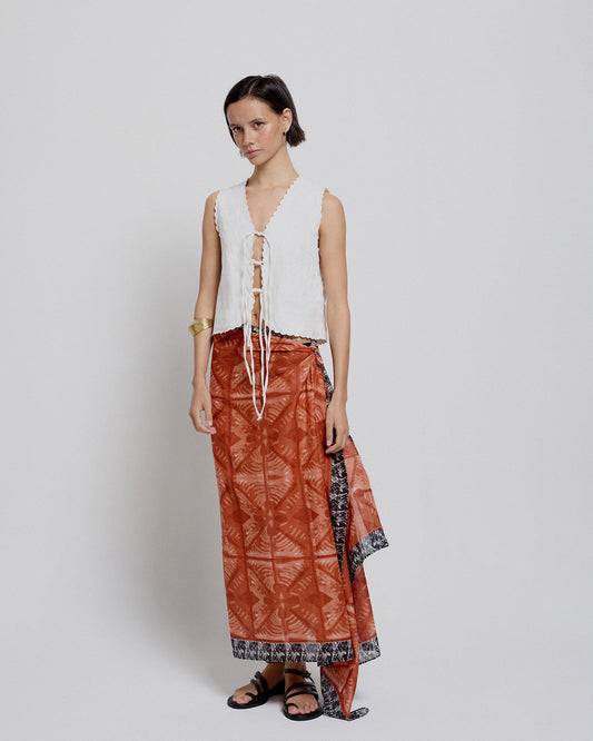 Casaco roxo de abotoamento duplo com fecho de cordões.