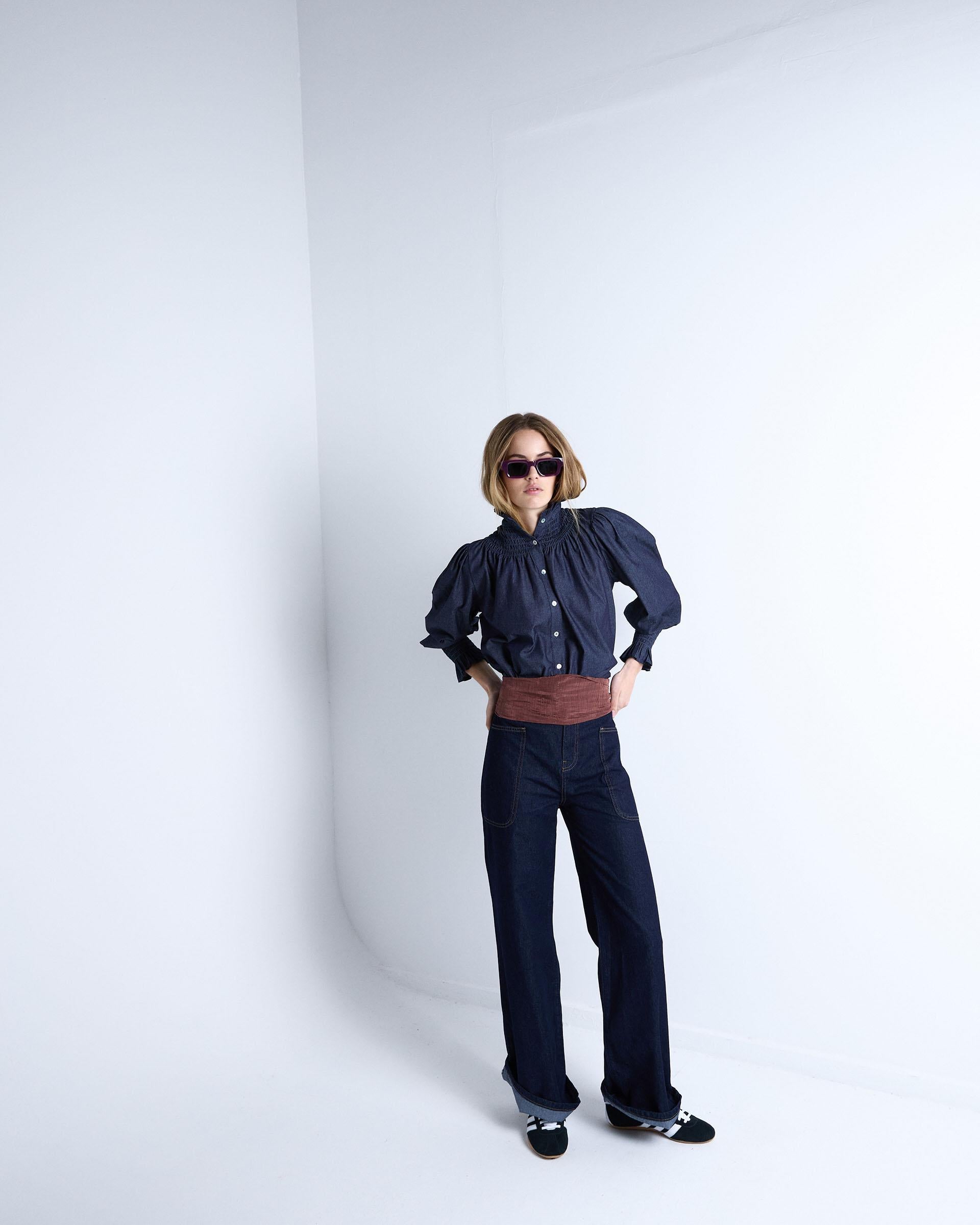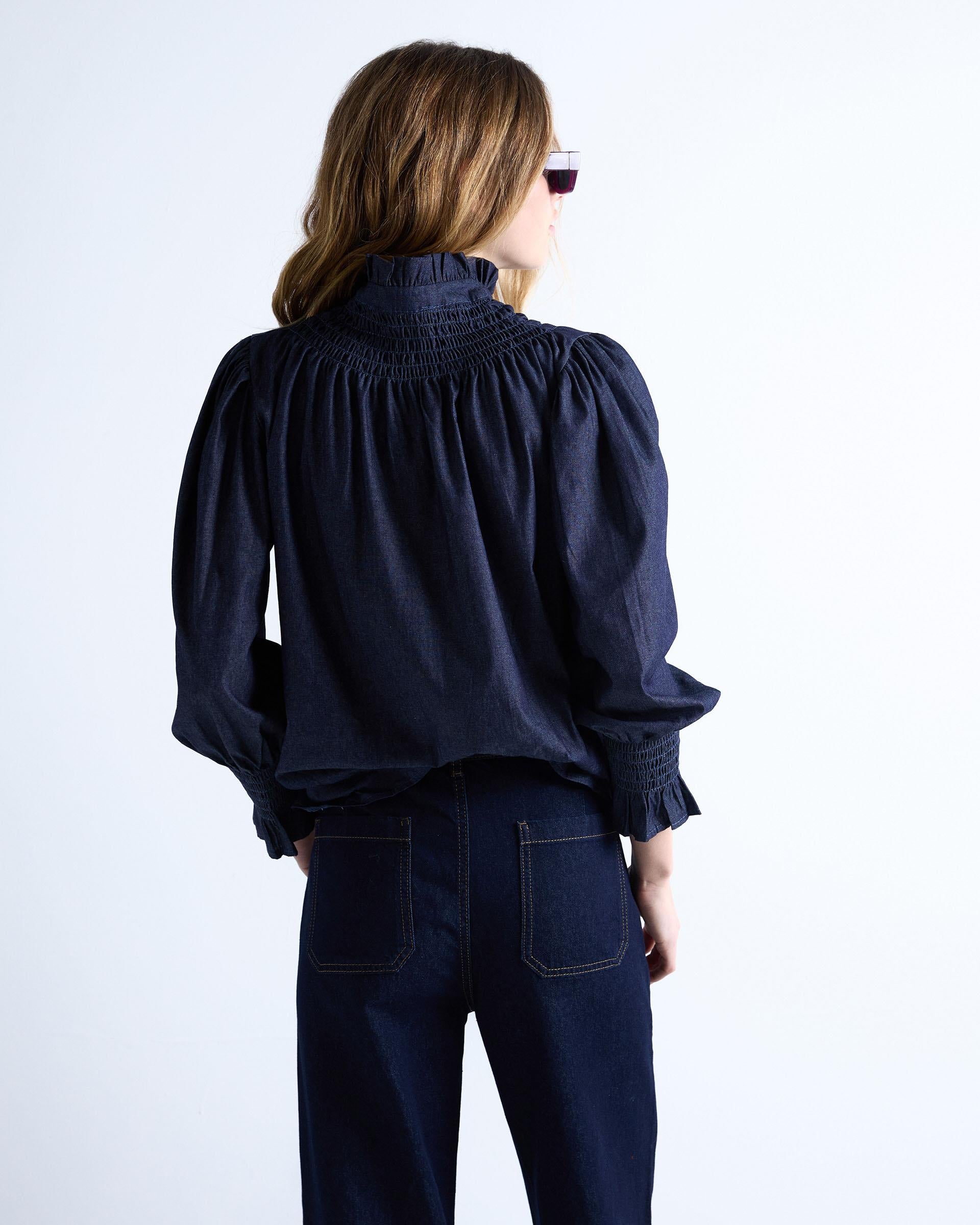 Blusa de manga comprida estilo ganga com detalhe em favo de mel na gola e nos punhos.