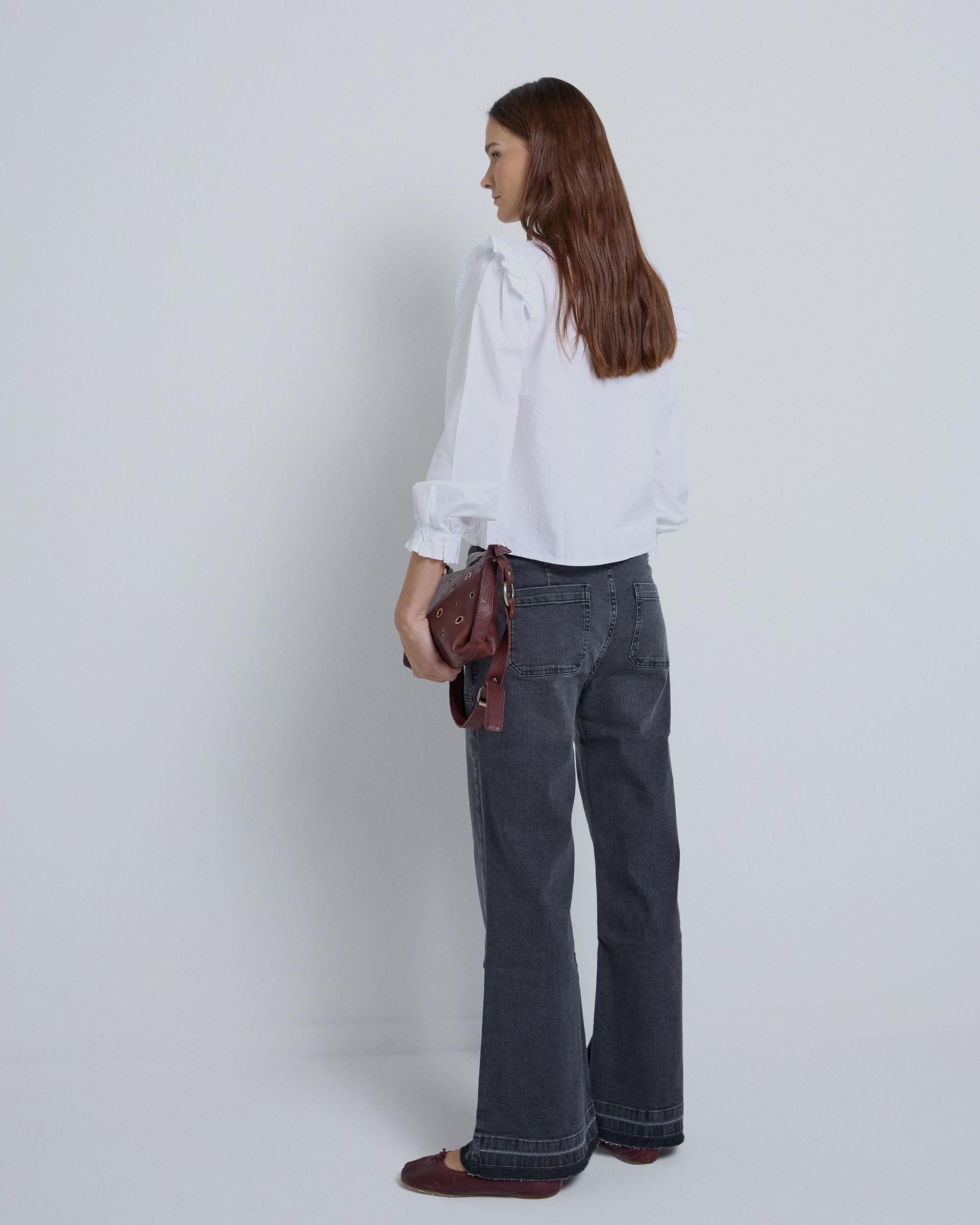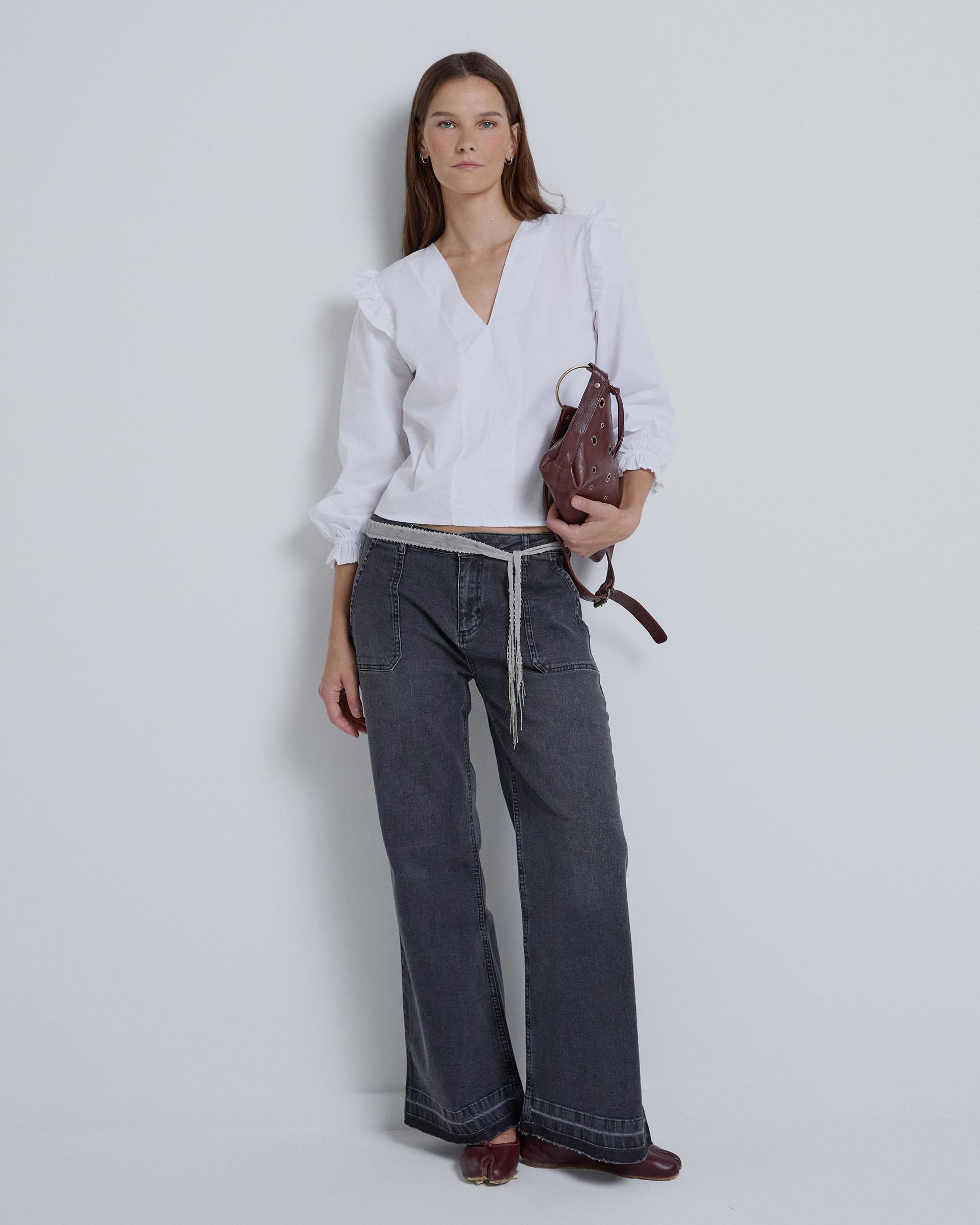 Blusa branca de manga comprida com decote em V, franzida na frente e pequeno detalhe de folho nos ombros.