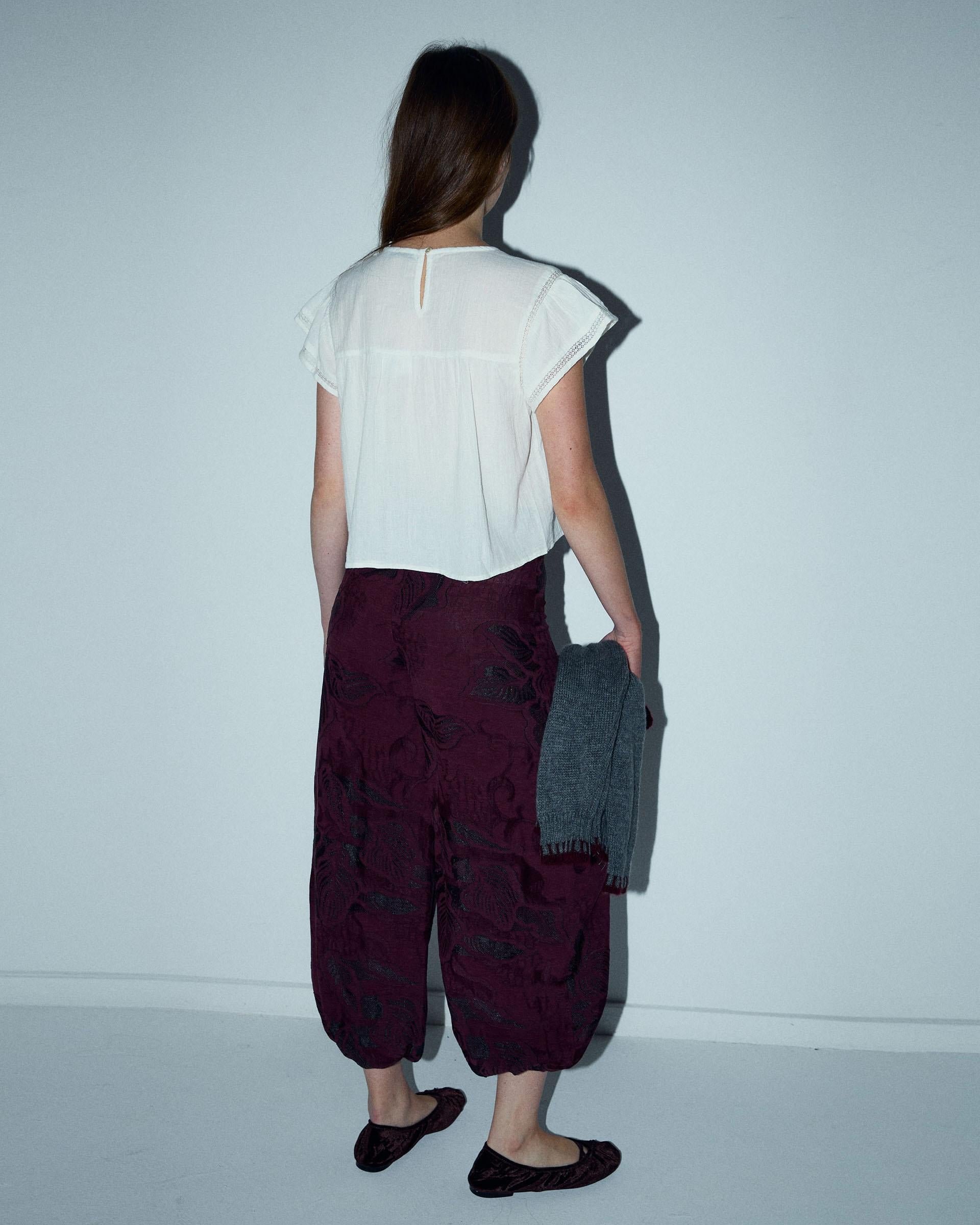 Blusa de manga curta com detalhe em renda, gola redonda, fecho em forma de gota e botão nas costas, em branco.